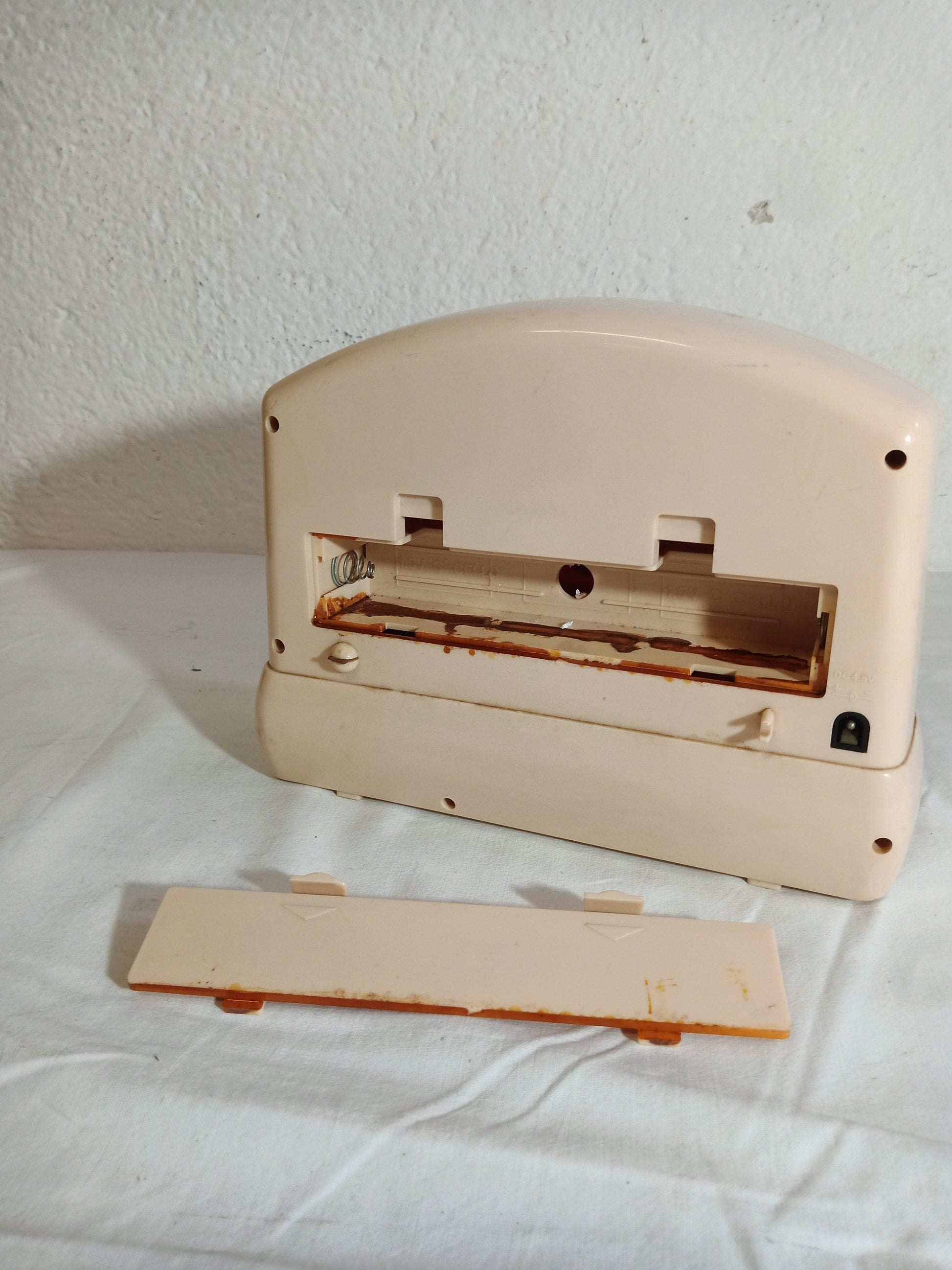 Made of plastic, this toy radio is a throwback to the era when radios were treasured possessions in everyone's home. Although it's untested and missing its power cord, it's a piece of history and a unique vintage decorative element.