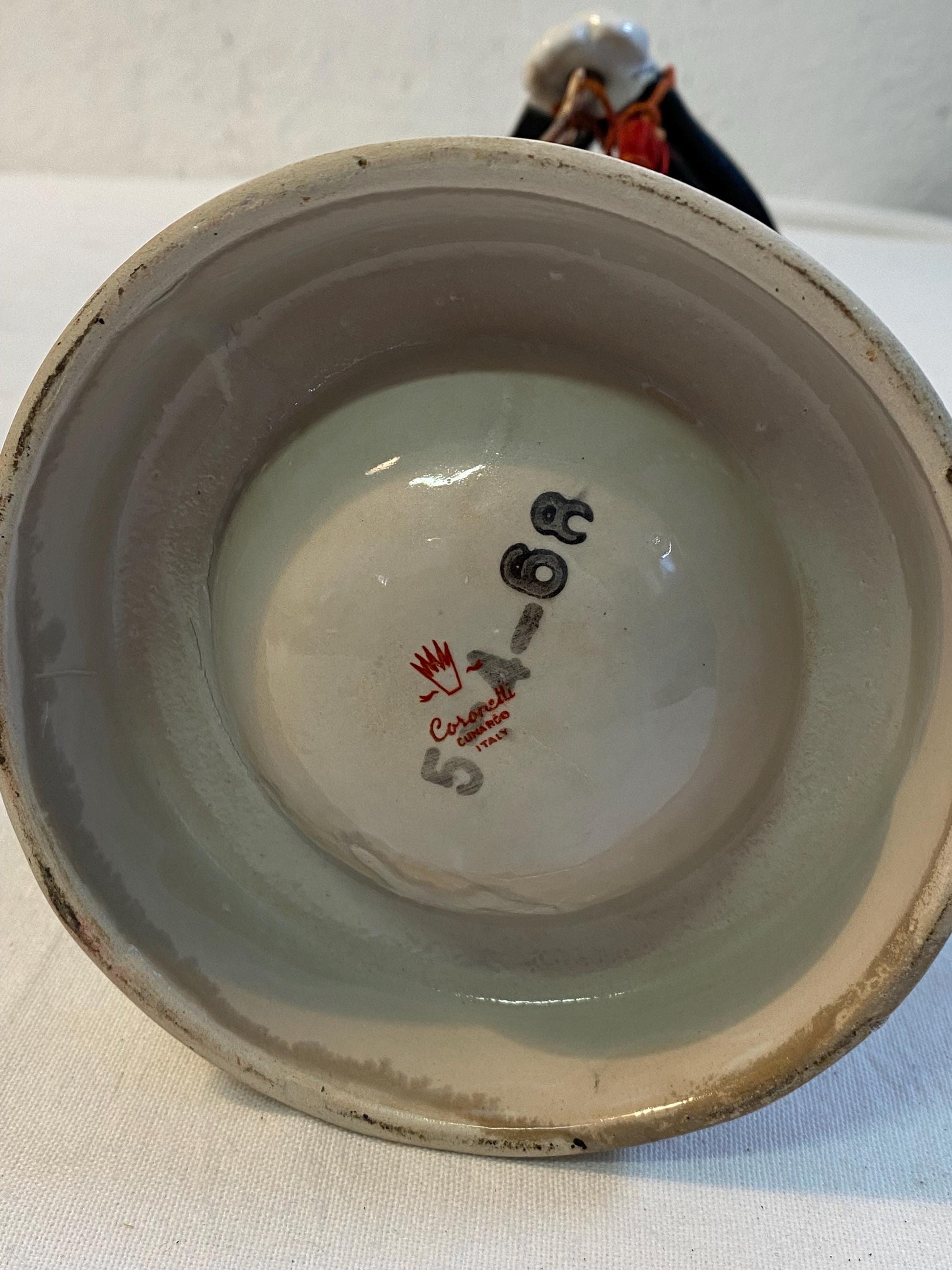 Large Gilliano Carabinieri liquor decanter for display in a shop or bar. Stamped "Coronelli, Italy" under the base. The large decanter depicts a Carabiniere in uniform. The uniform and hat are primarily black with white trim, white gloves, and a gold-plated metal sword. The hat features a white, red, and green ceramic plume decoration on the top, with a small chip. The sword has two gold tassels. His face is in excellent condition.