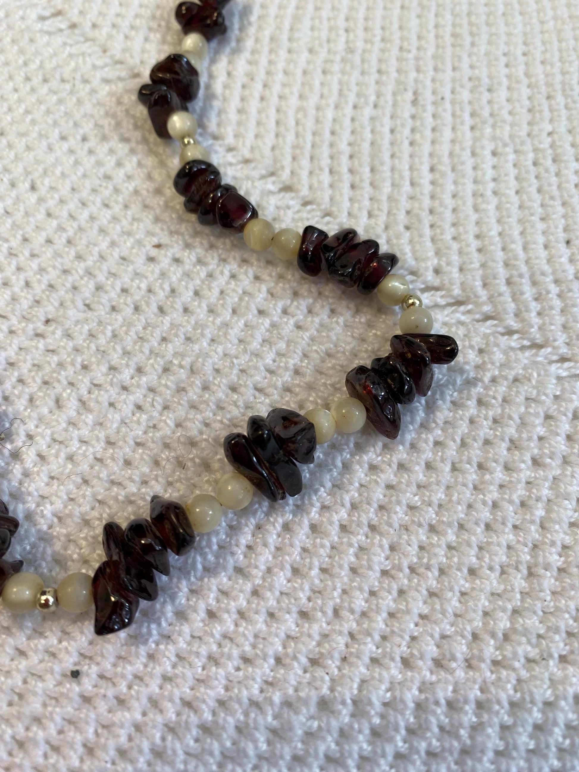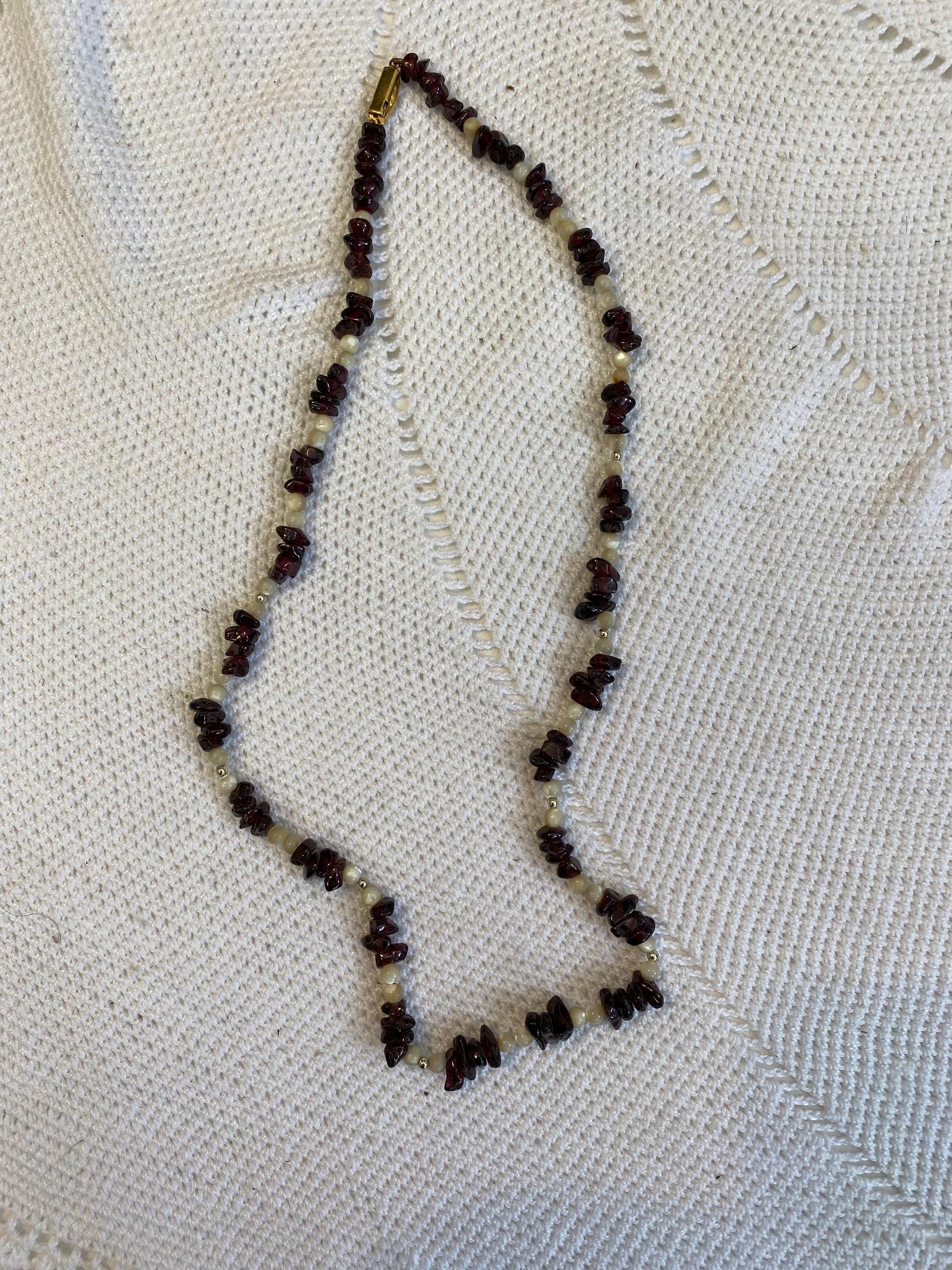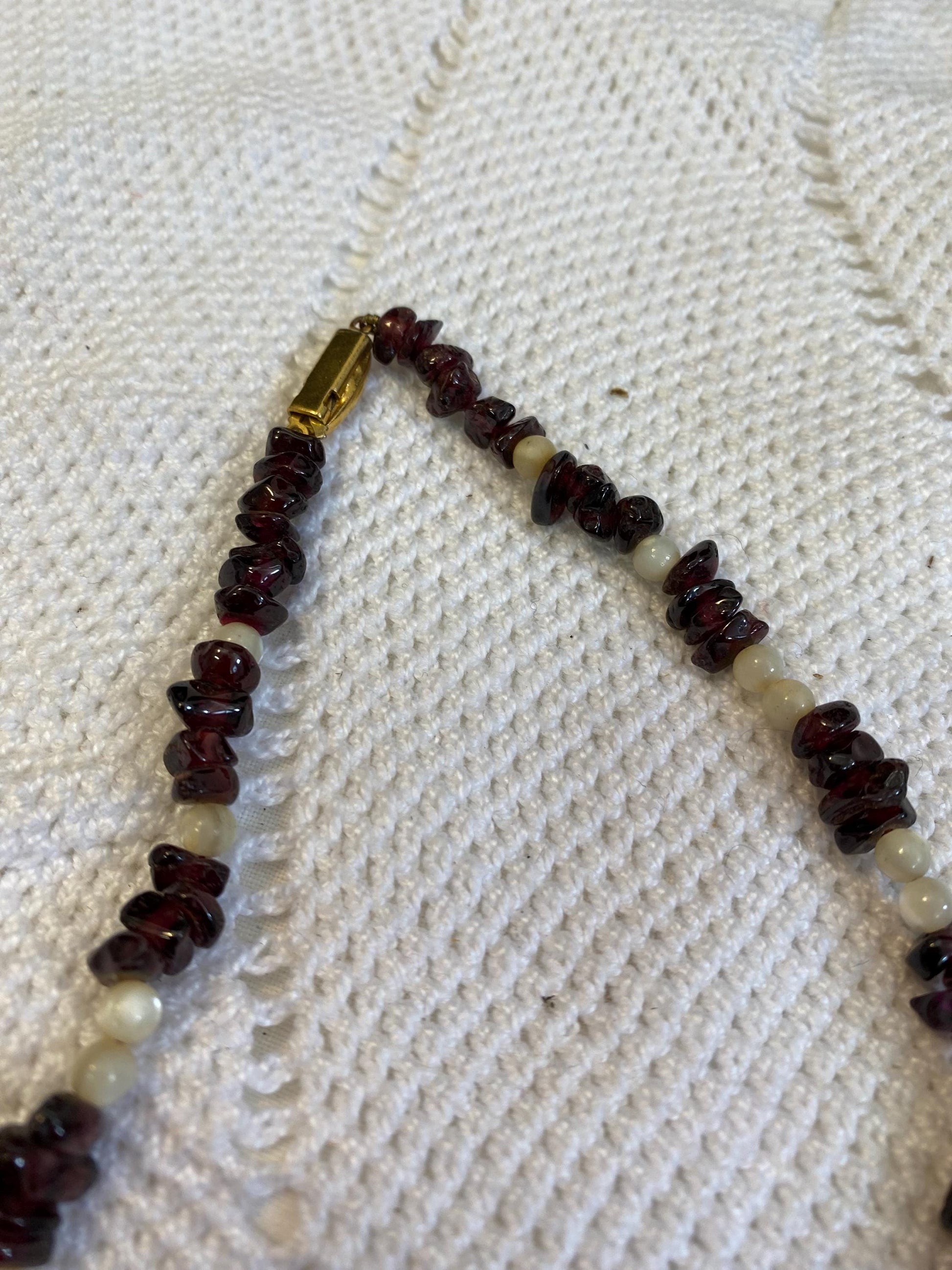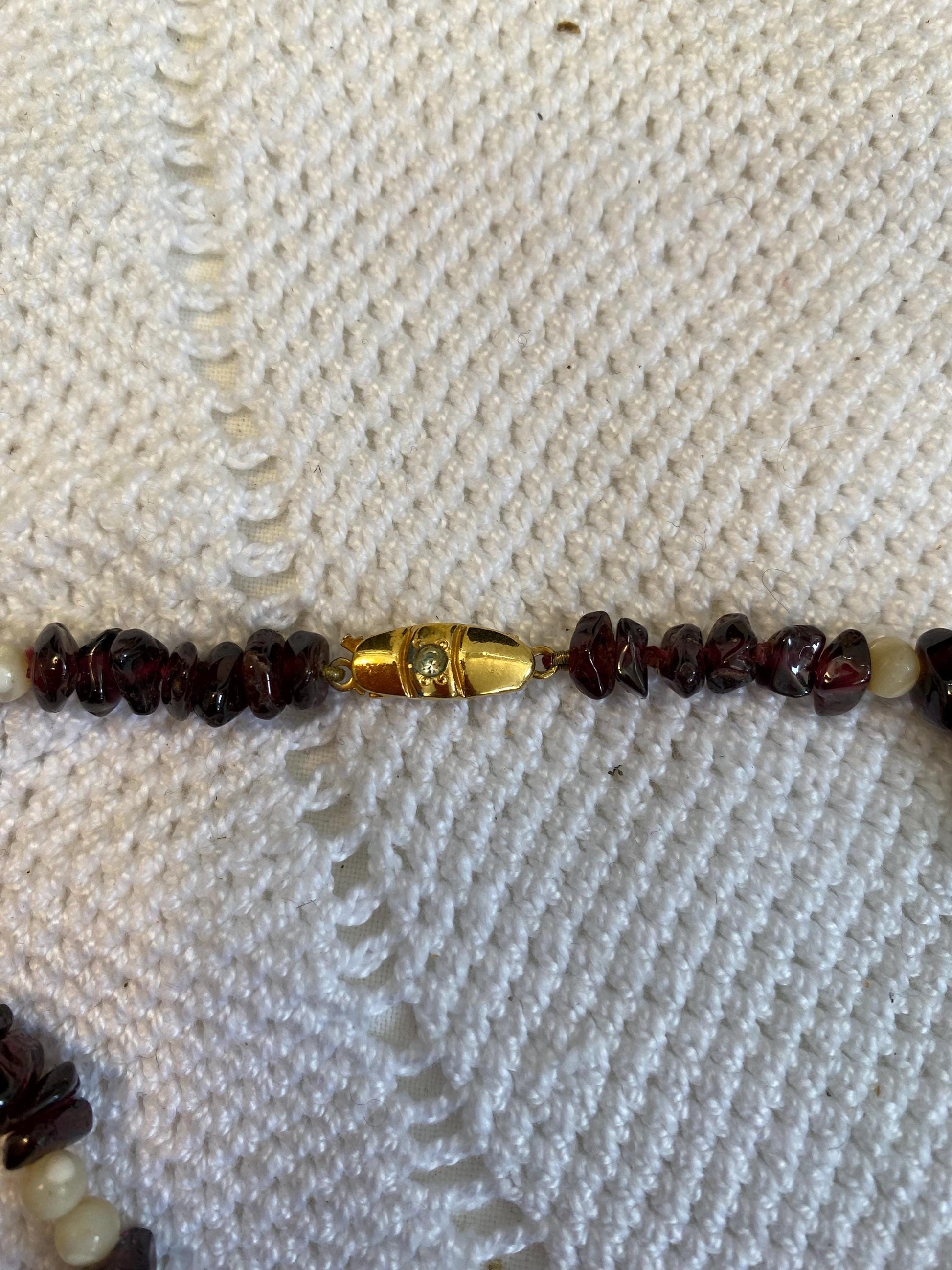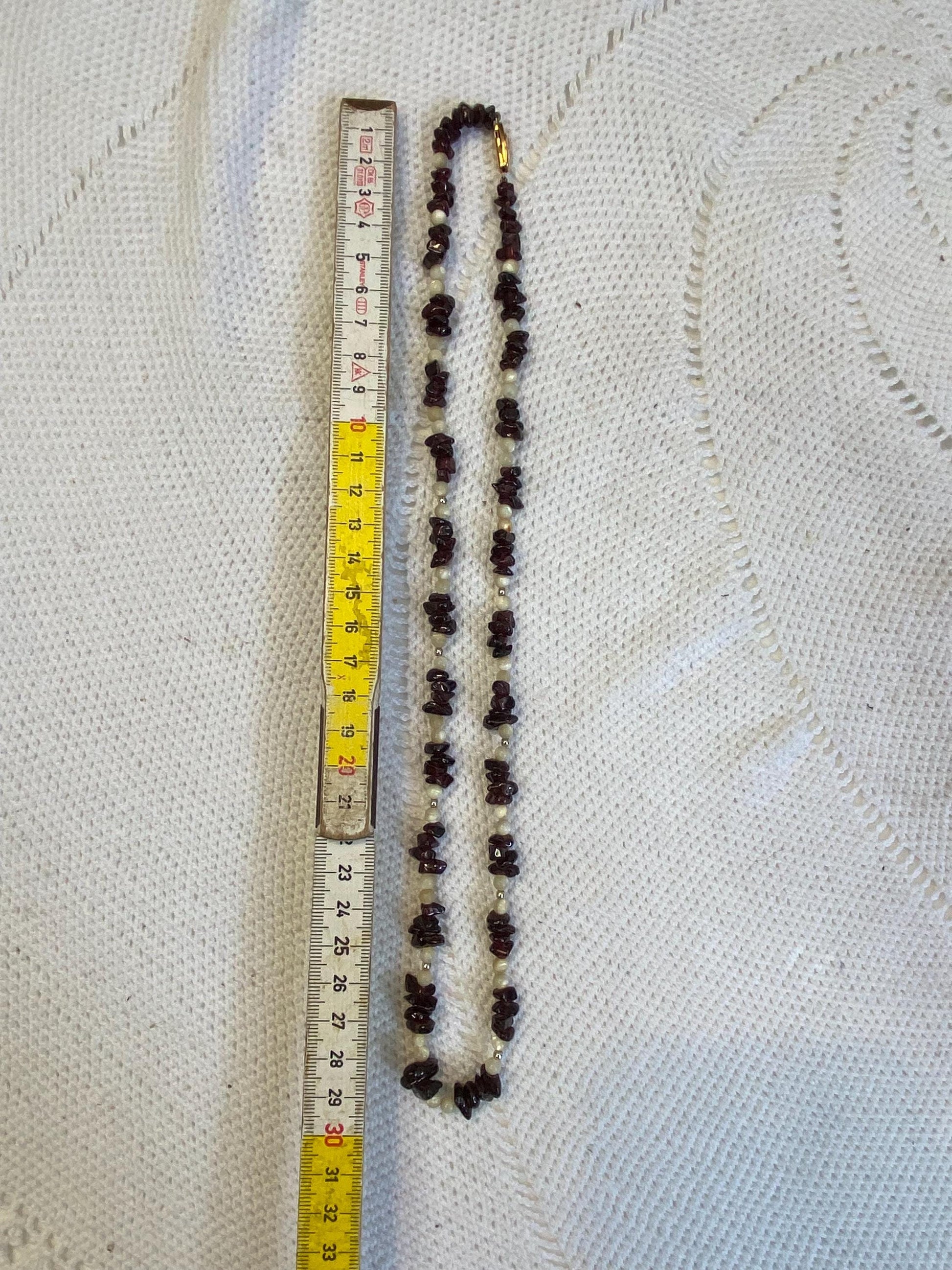 30 cm necklace with dark red mineral stone grains and natural pearls, vintage gold clasp, elegant and refined, unique piece
