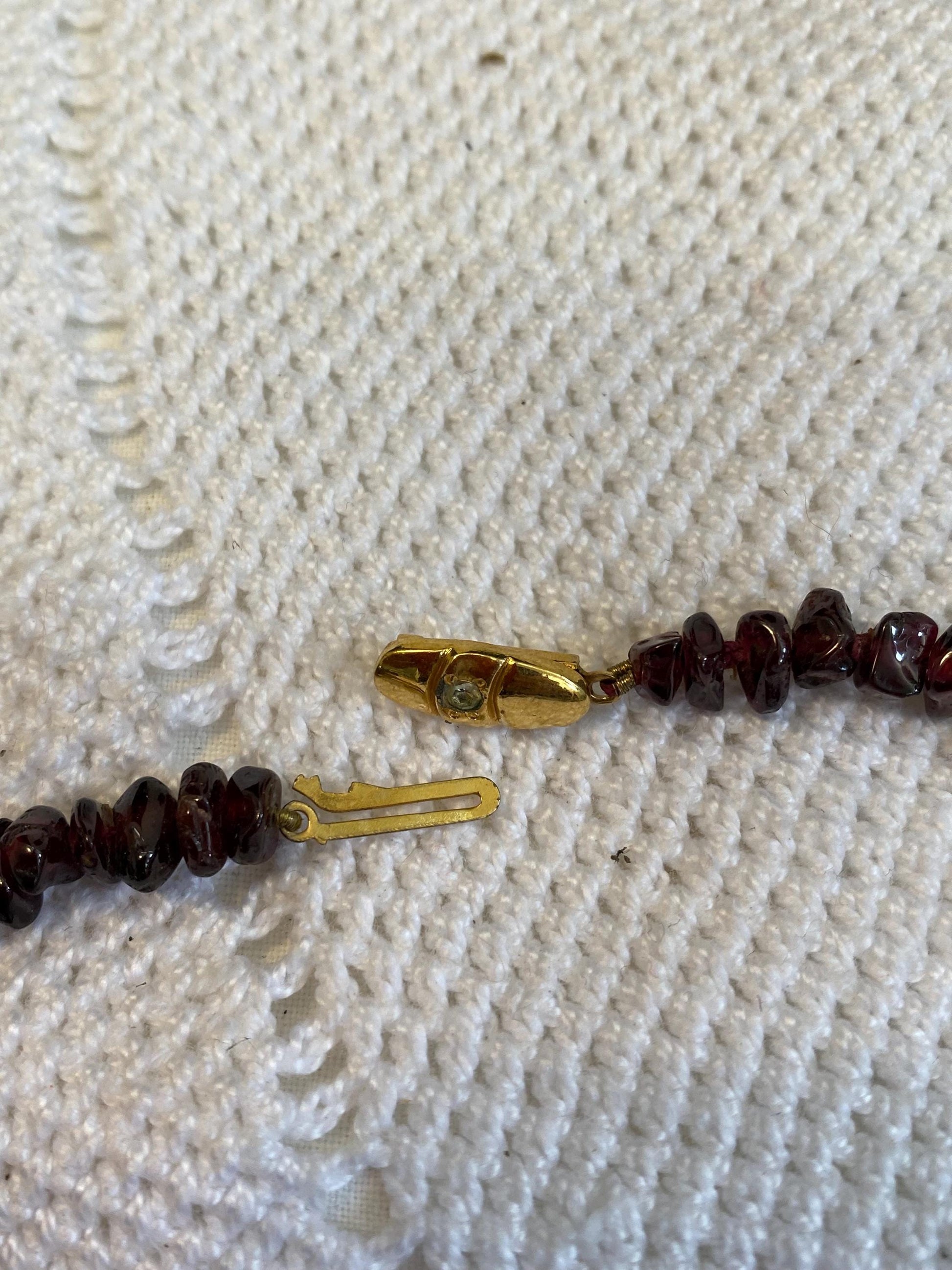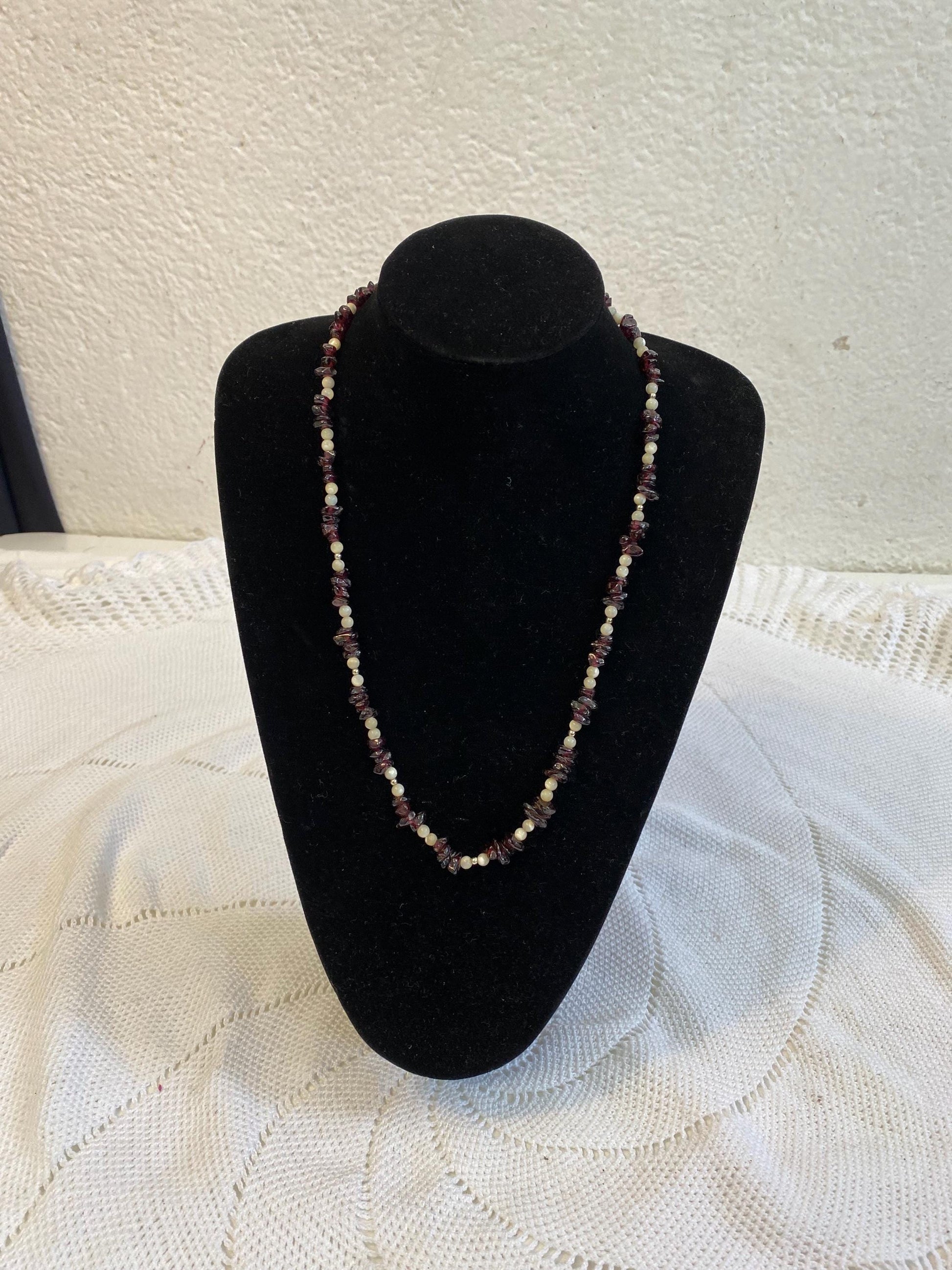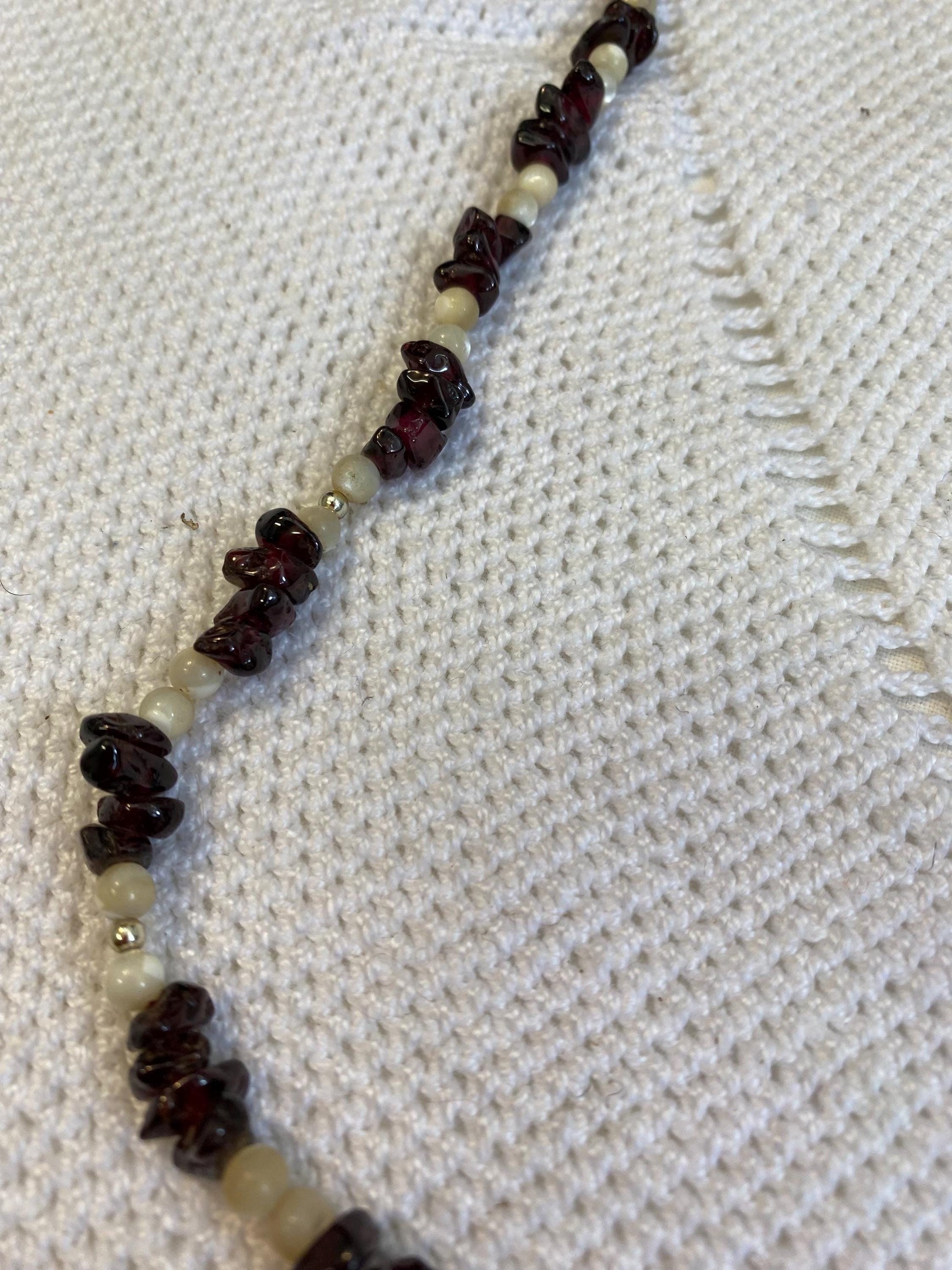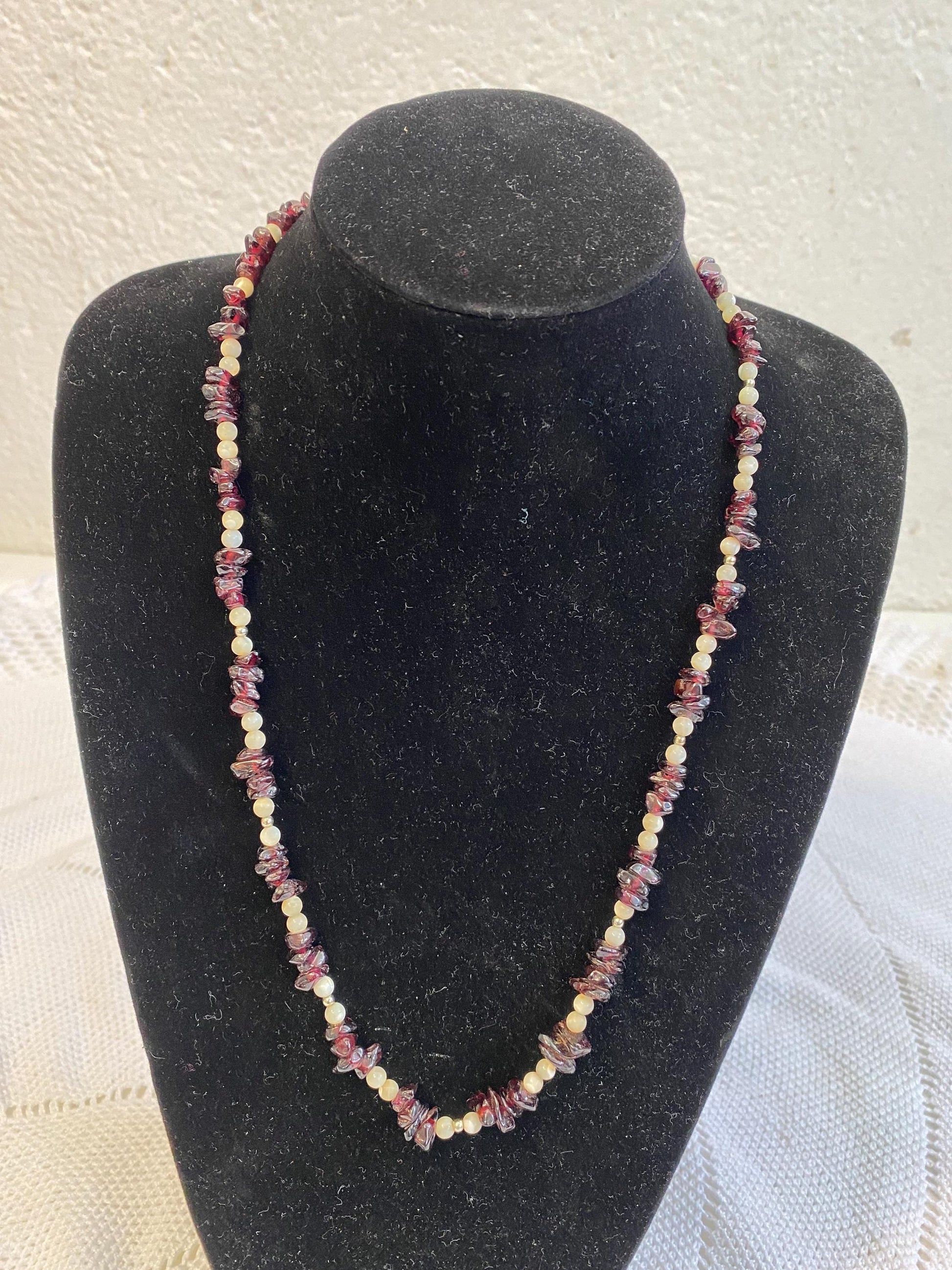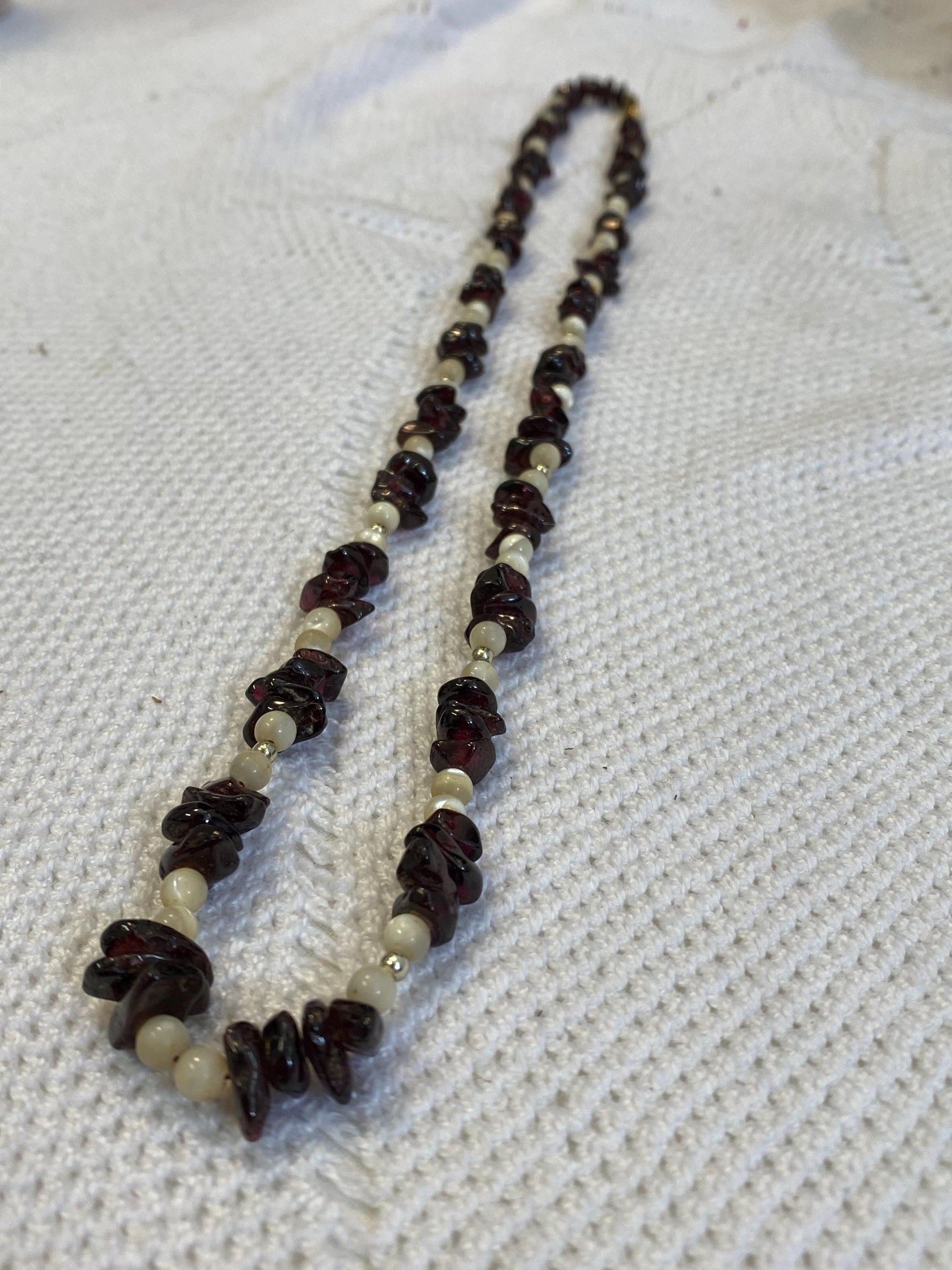 30 cm necklace with dark red mineral stone grains and natural pearls, vintage gold clasp, elegant and refined, unique piece
