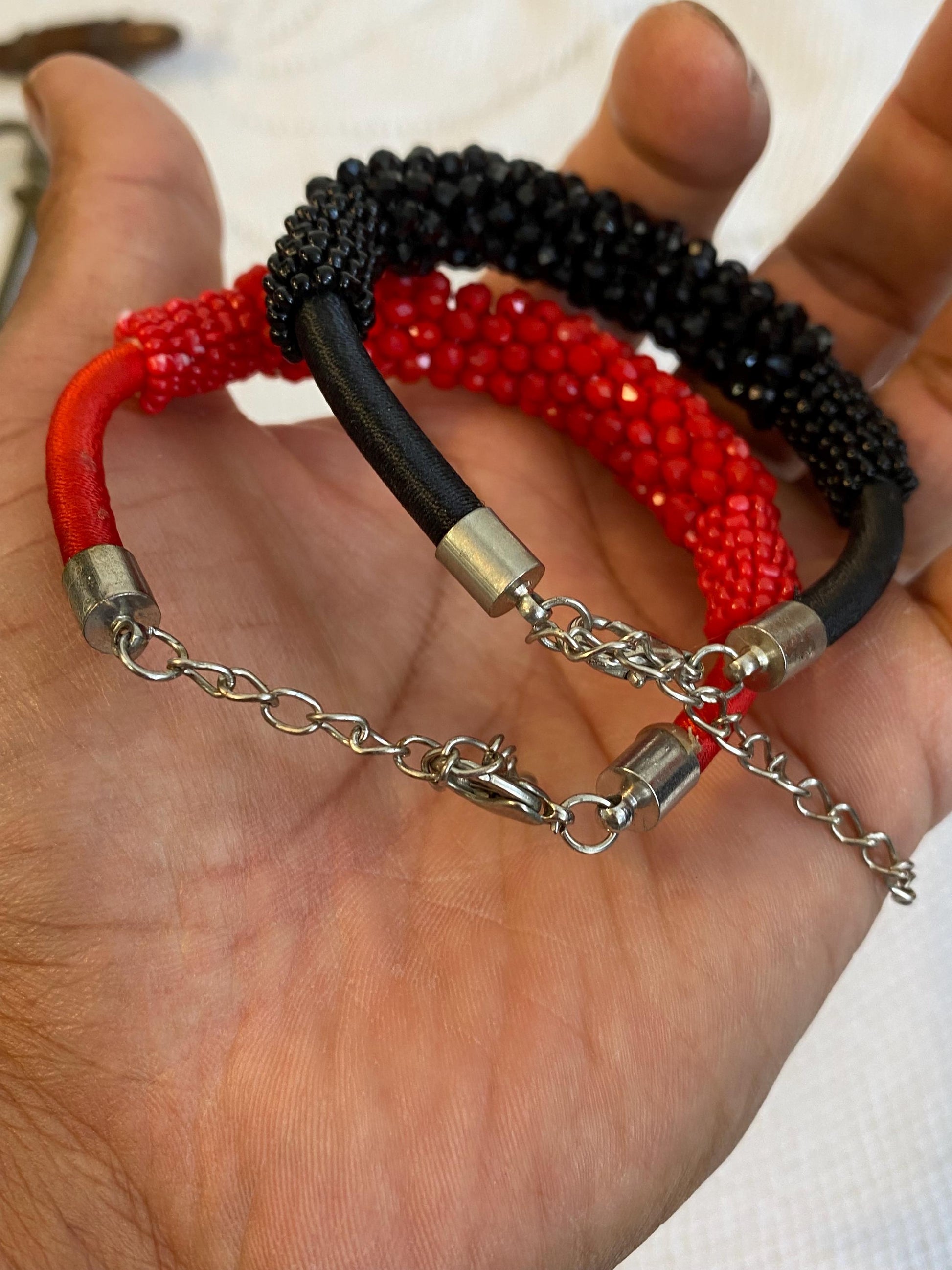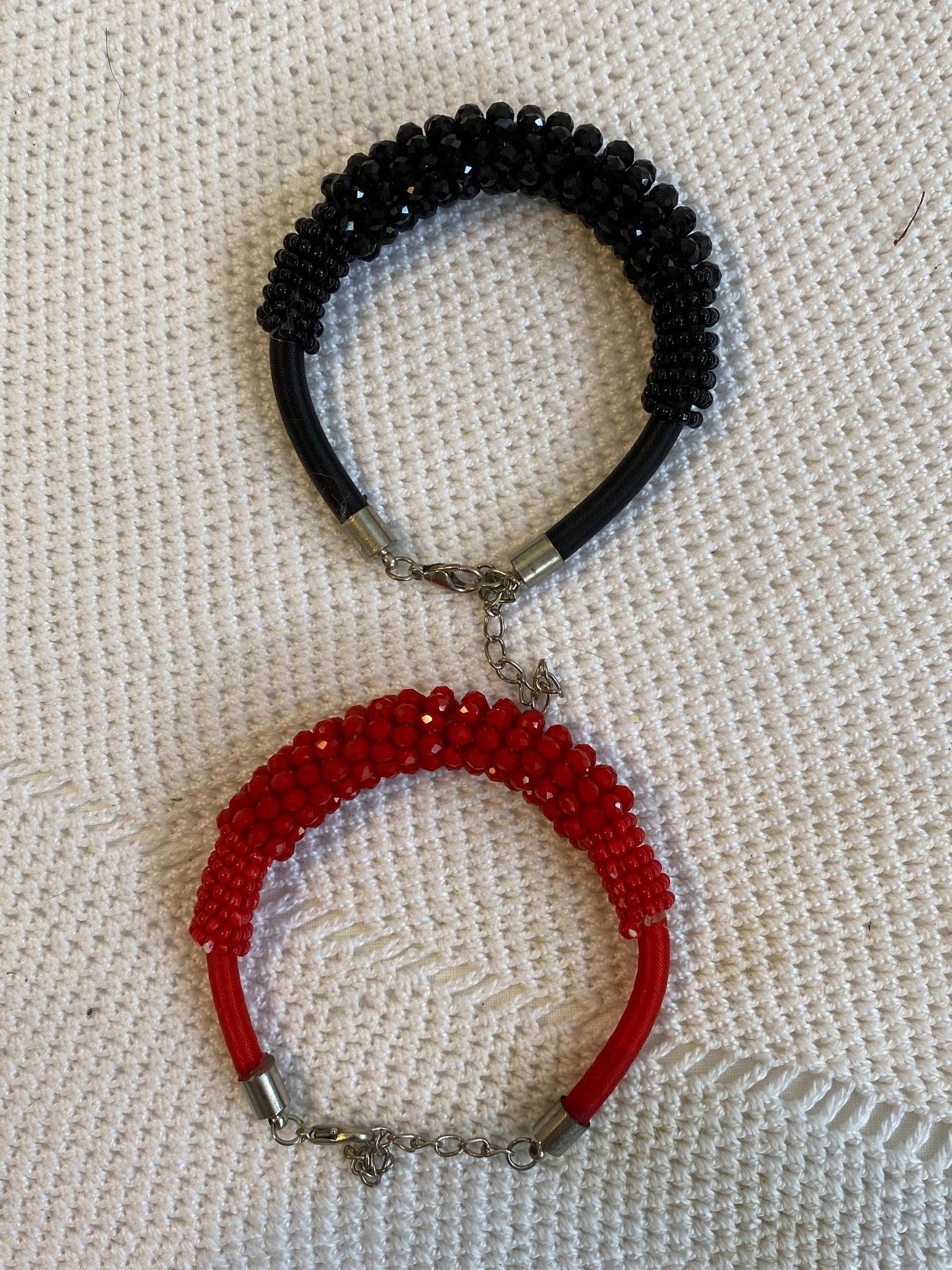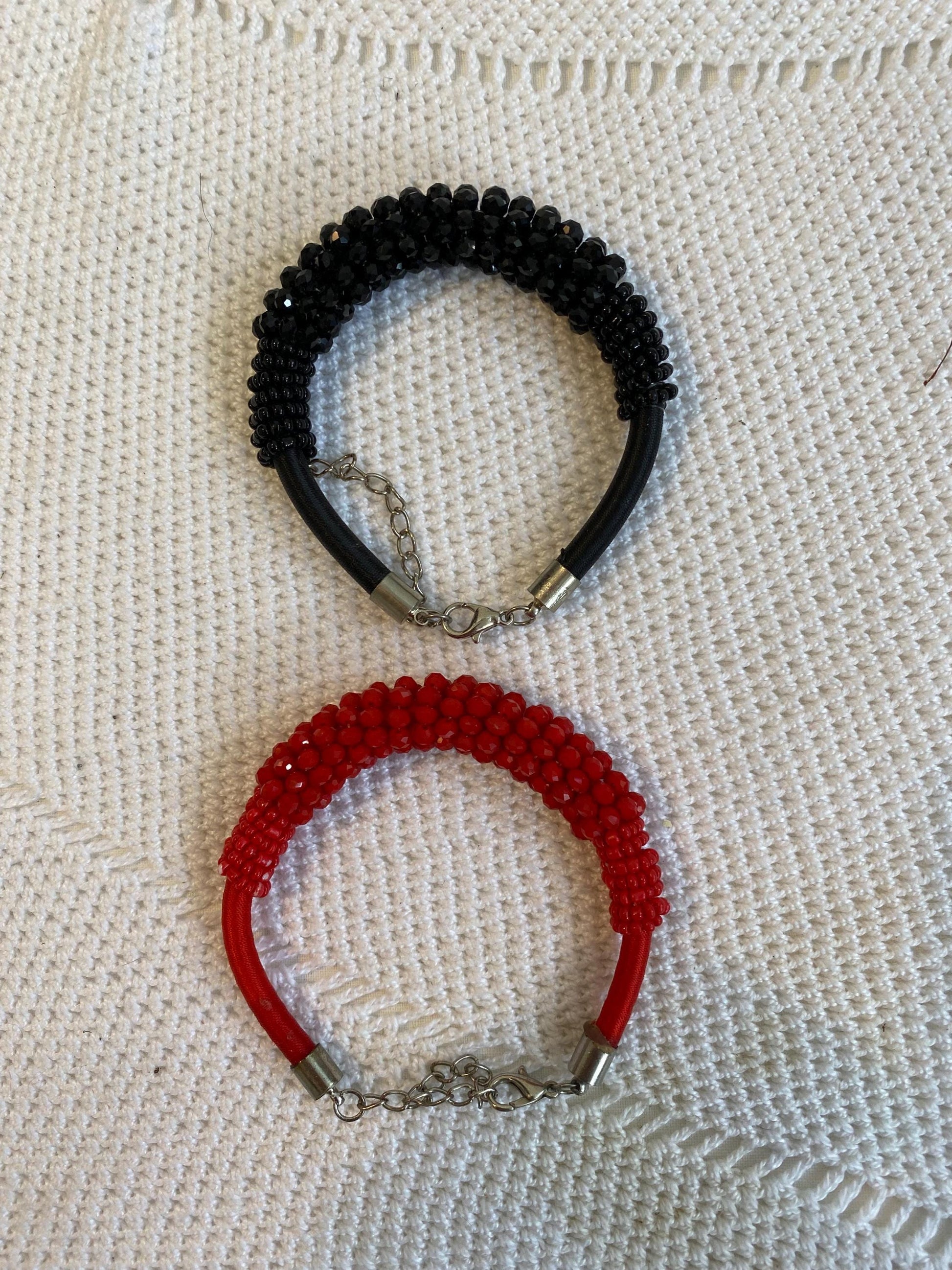 Discover this pair of adjustable bracelets, handmade with red and black beads. The two bracelets are made with hand-strung beads on a flexible metal base, finished with a black cord and an adjustable chain. The two-tone design creates an elegant and modern contrast, perfect for those who love unique, handcrafted accessories.