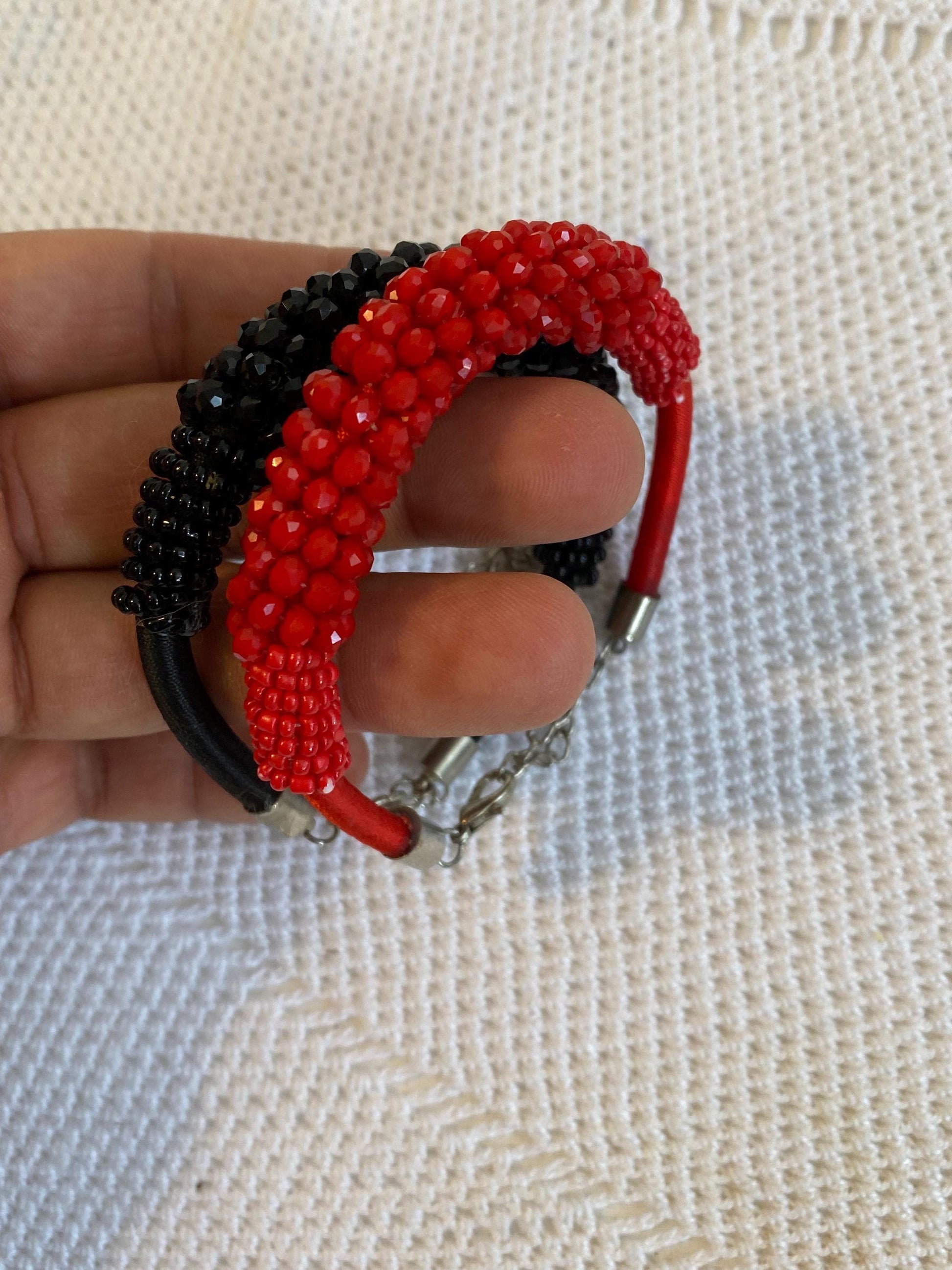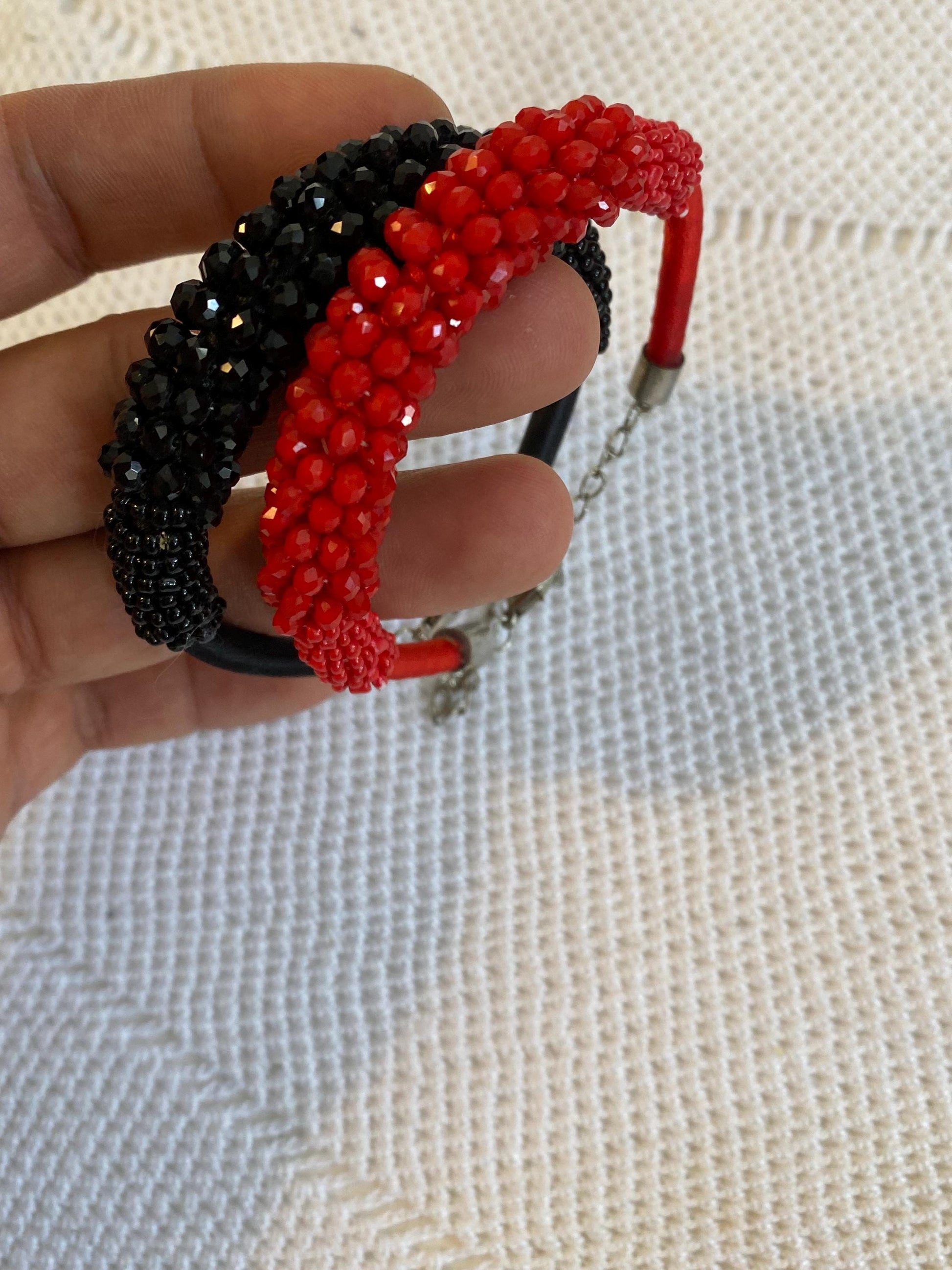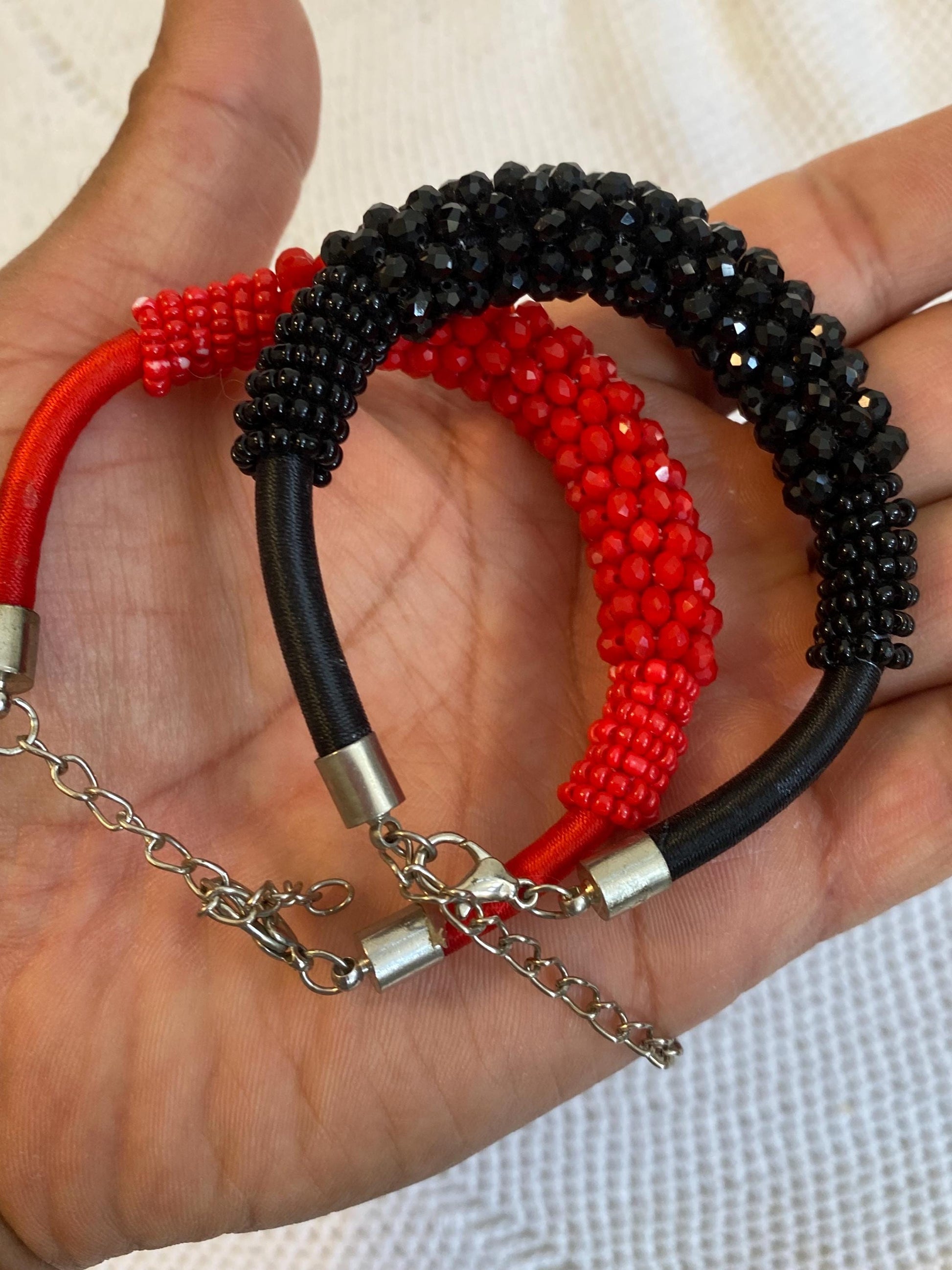 Discover this pair of adjustable bracelets, handmade with red and black beads. The two bracelets are made with hand-strung beads on a flexible metal base, finished with a black cord and an adjustable chain. The two-tone design creates an elegant and modern contrast, perfect for those who love unique, handcrafted accessories.