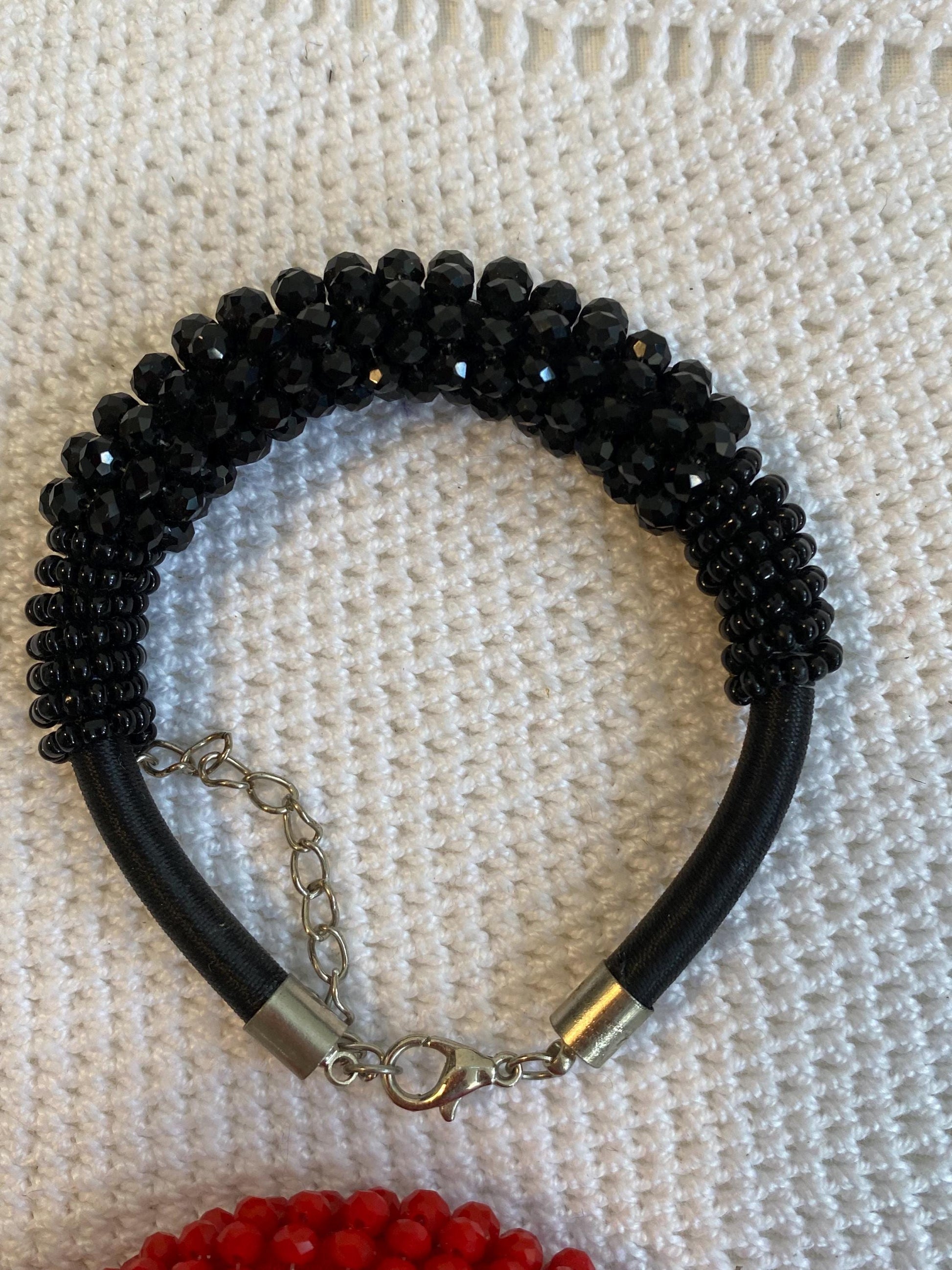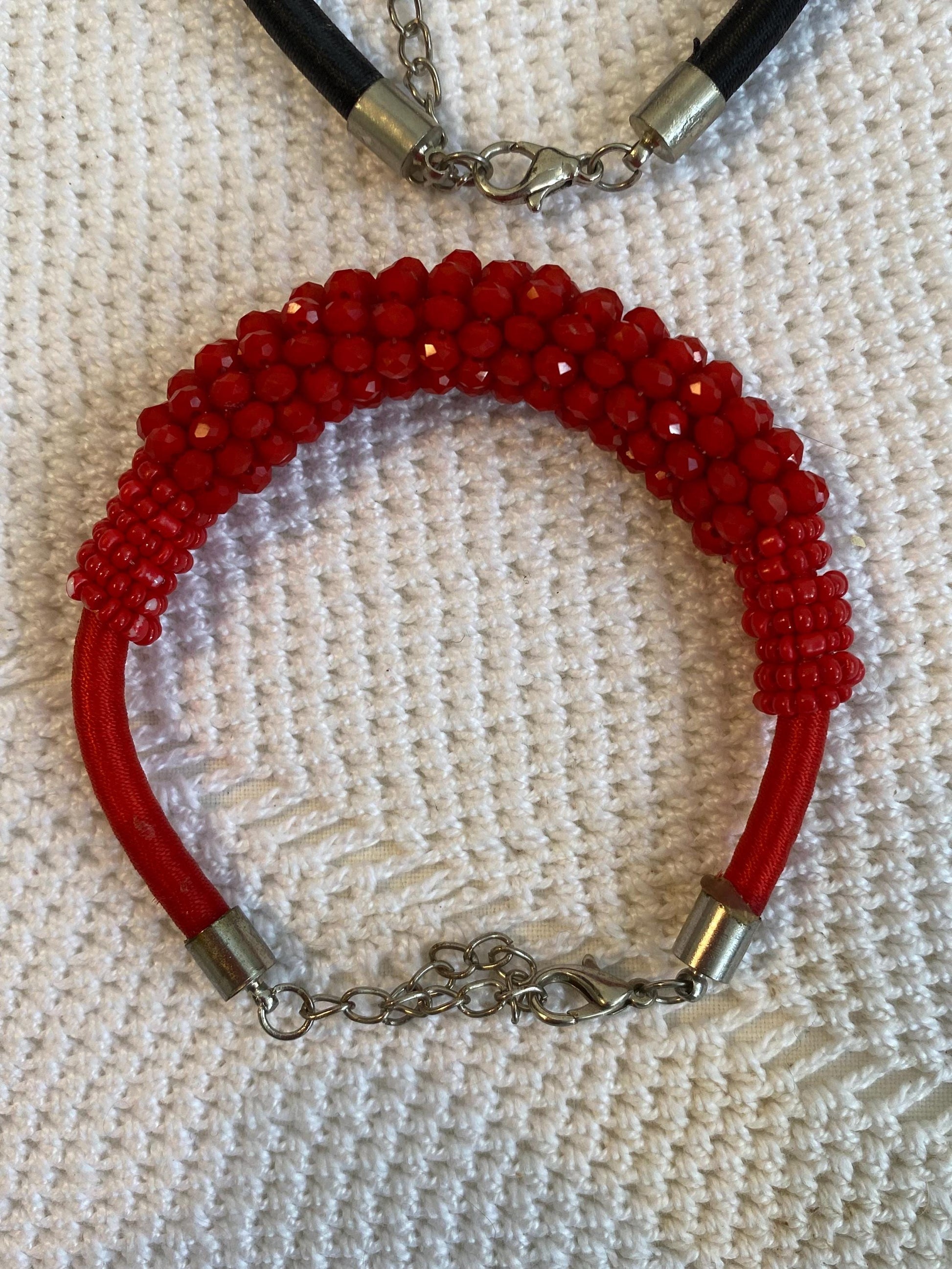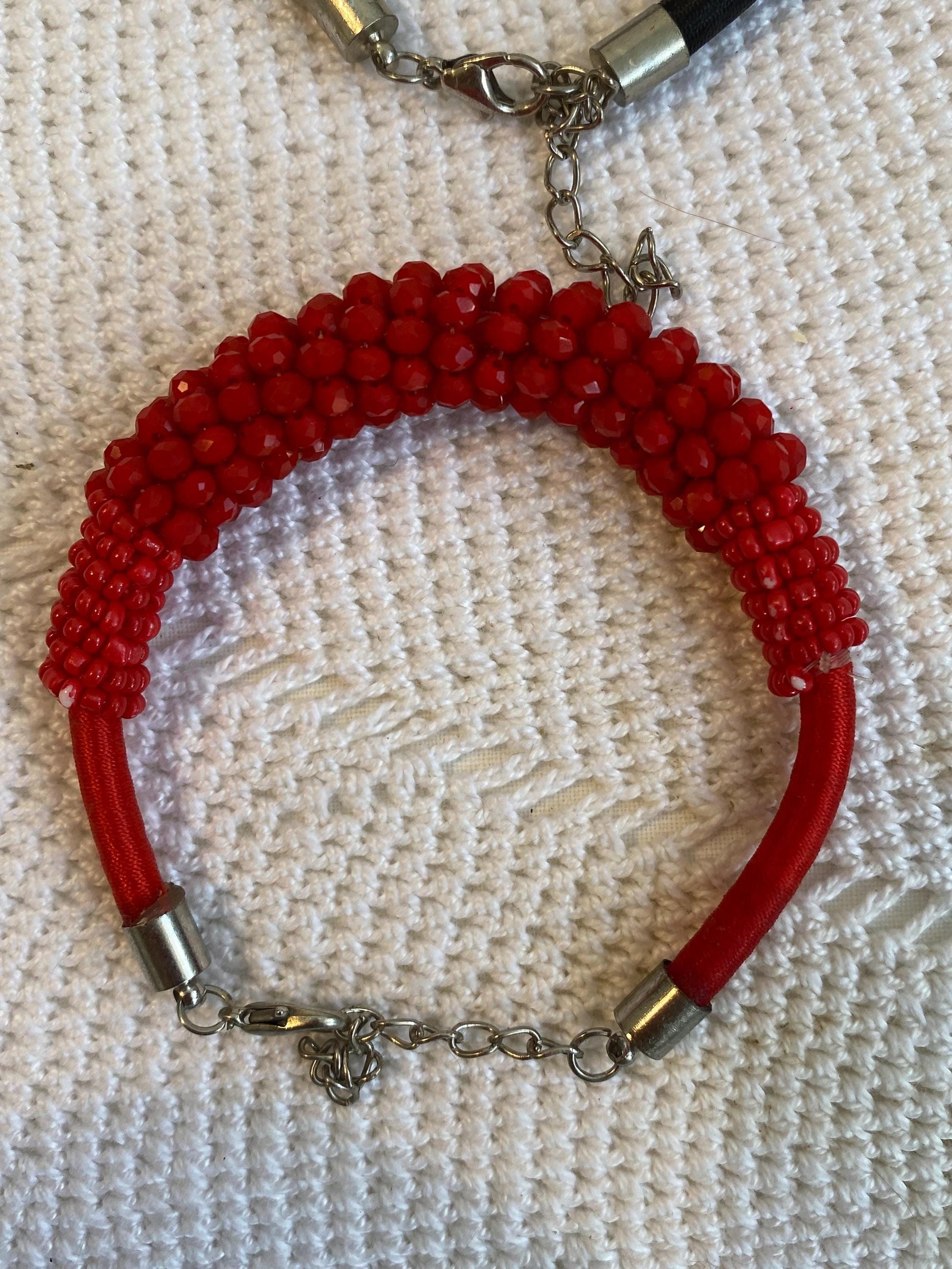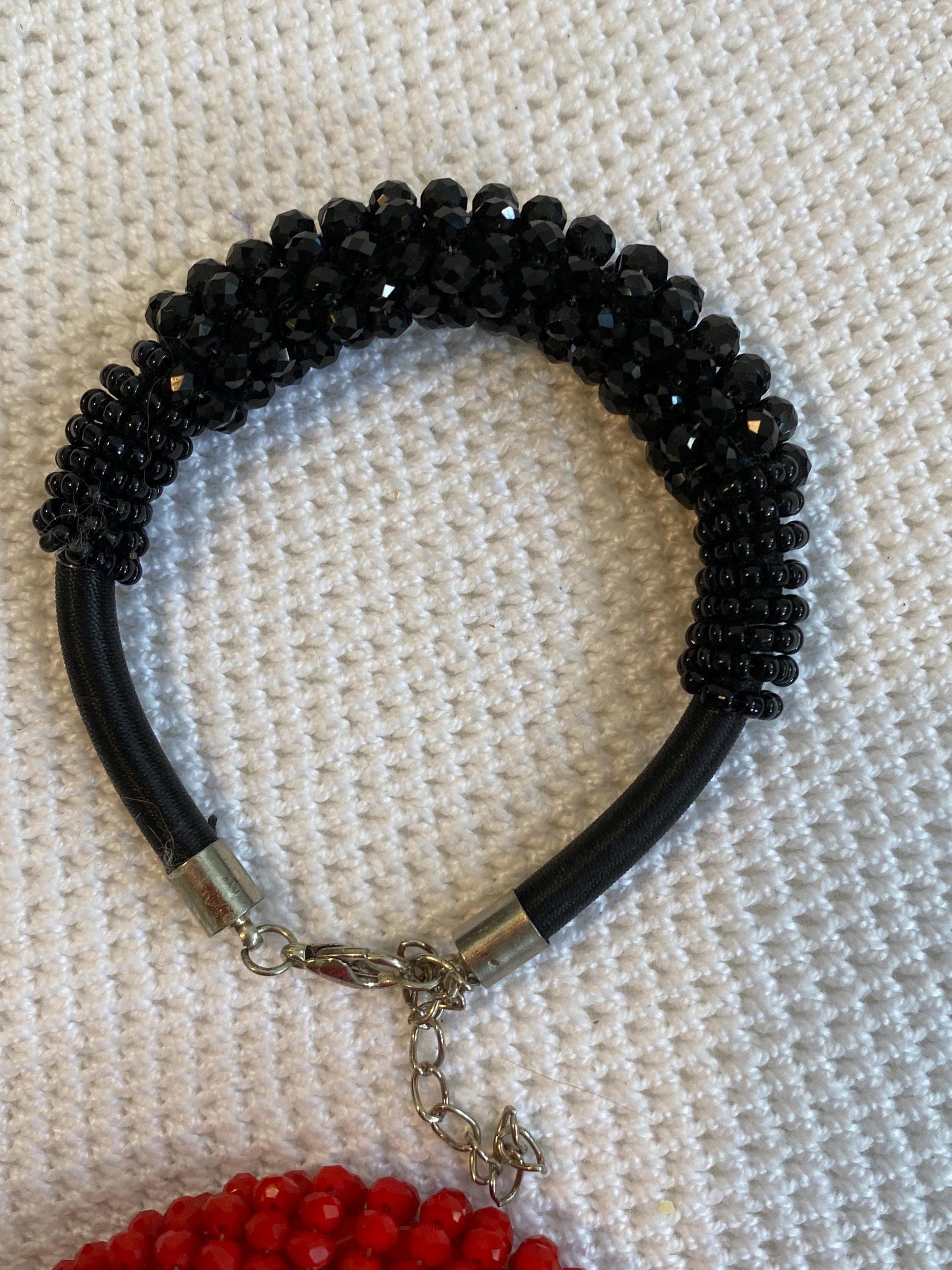 - Materials: red and black glass beads, black nylon cord, silver metal chain and clasps