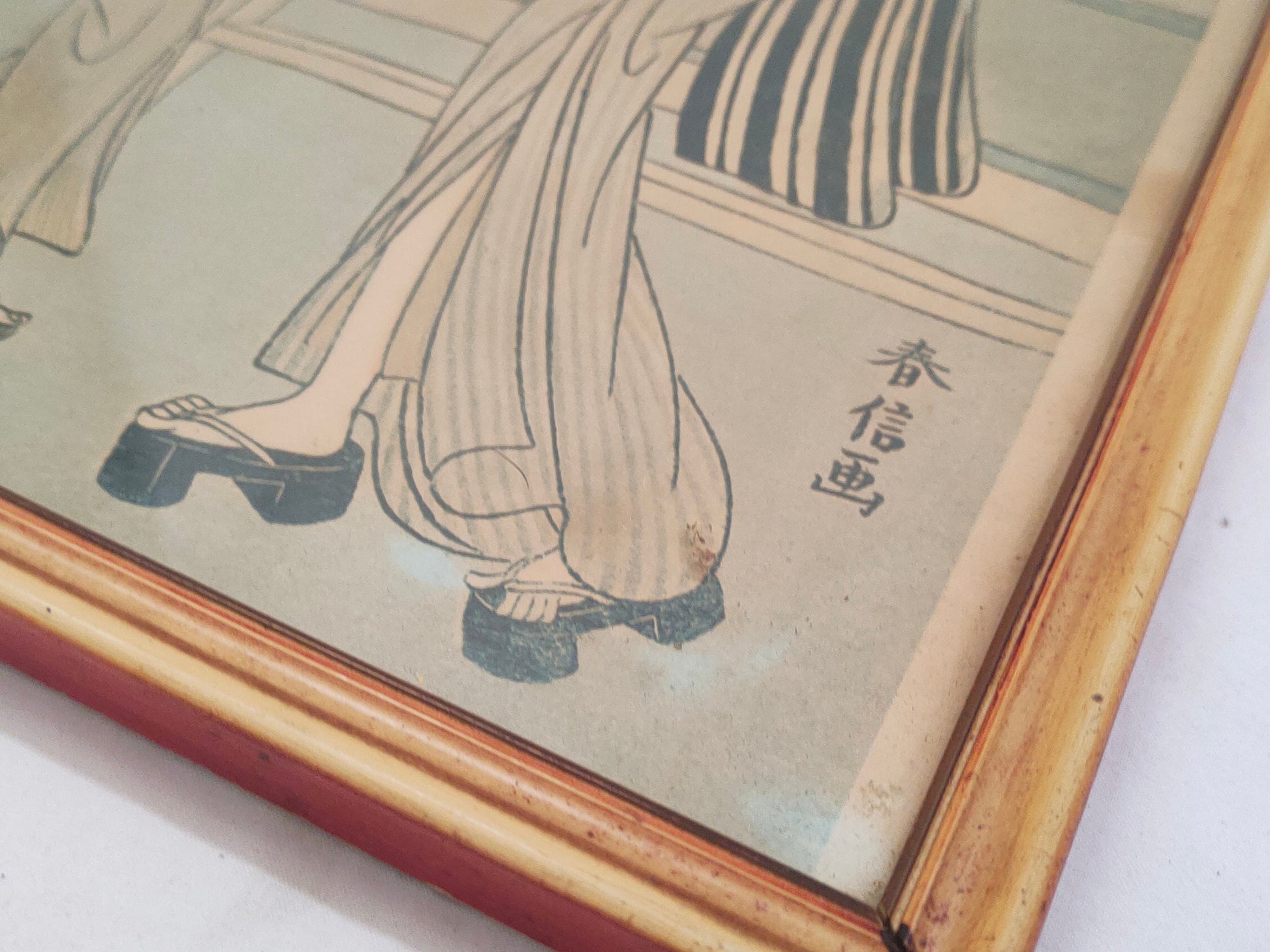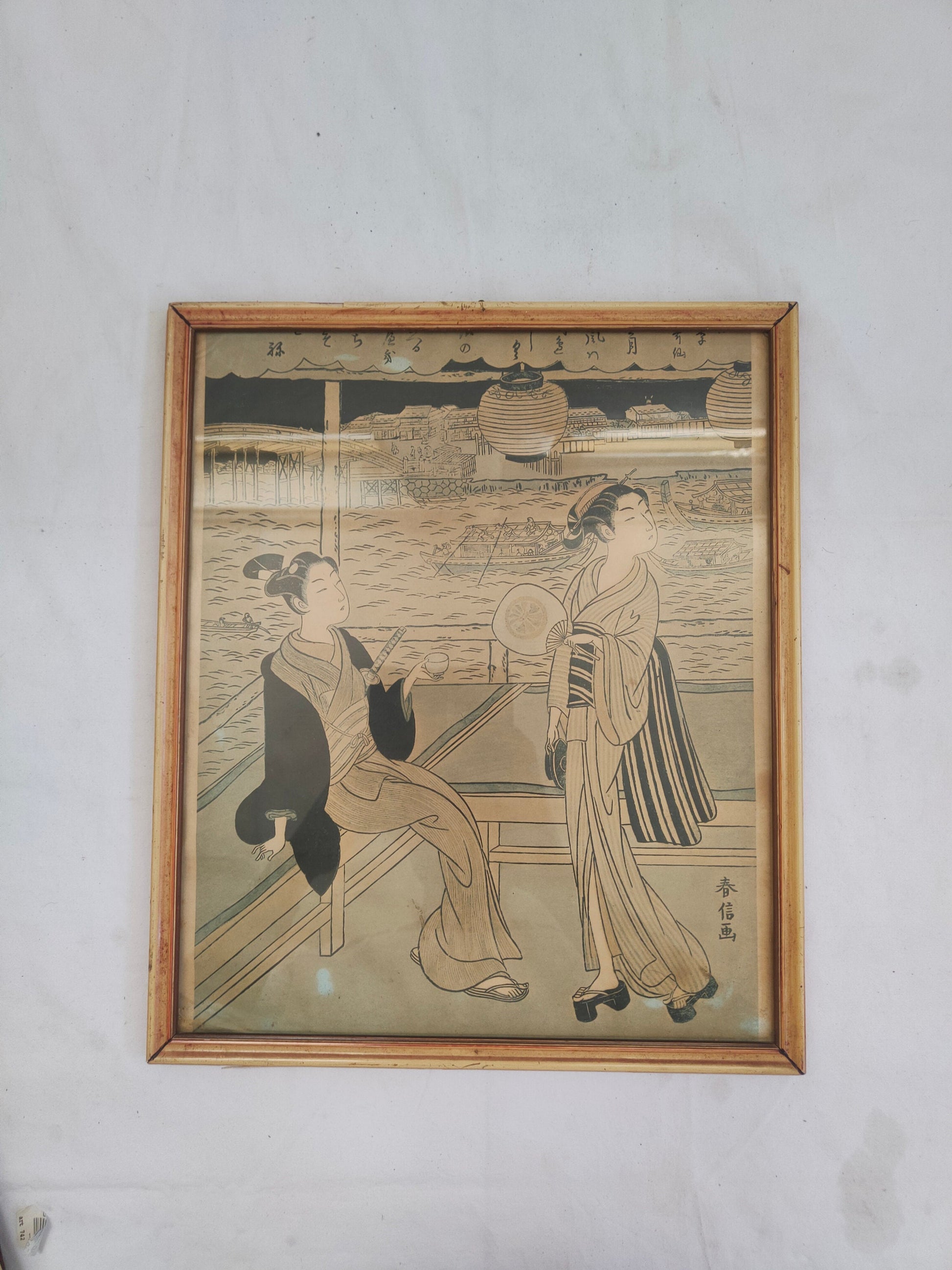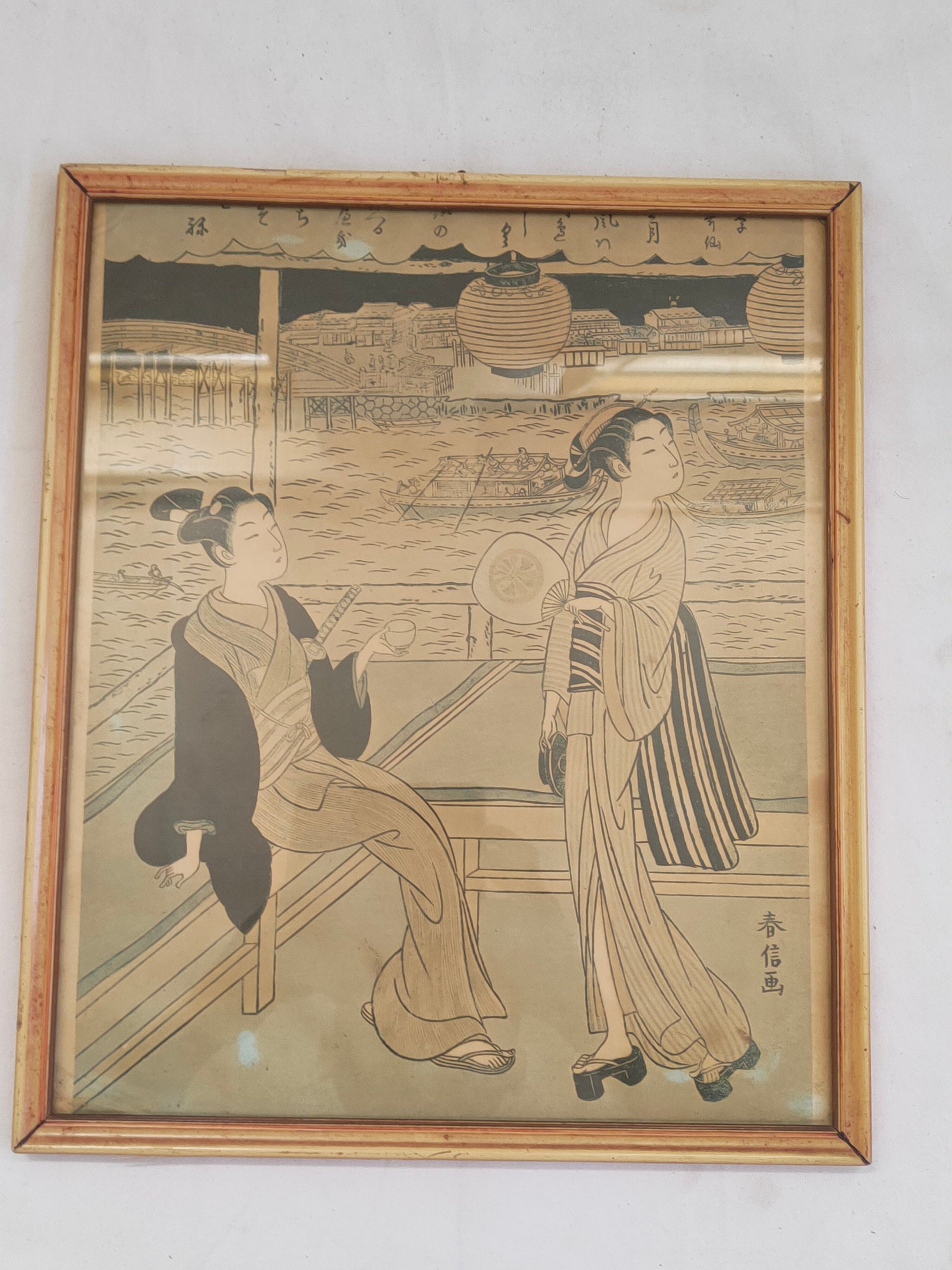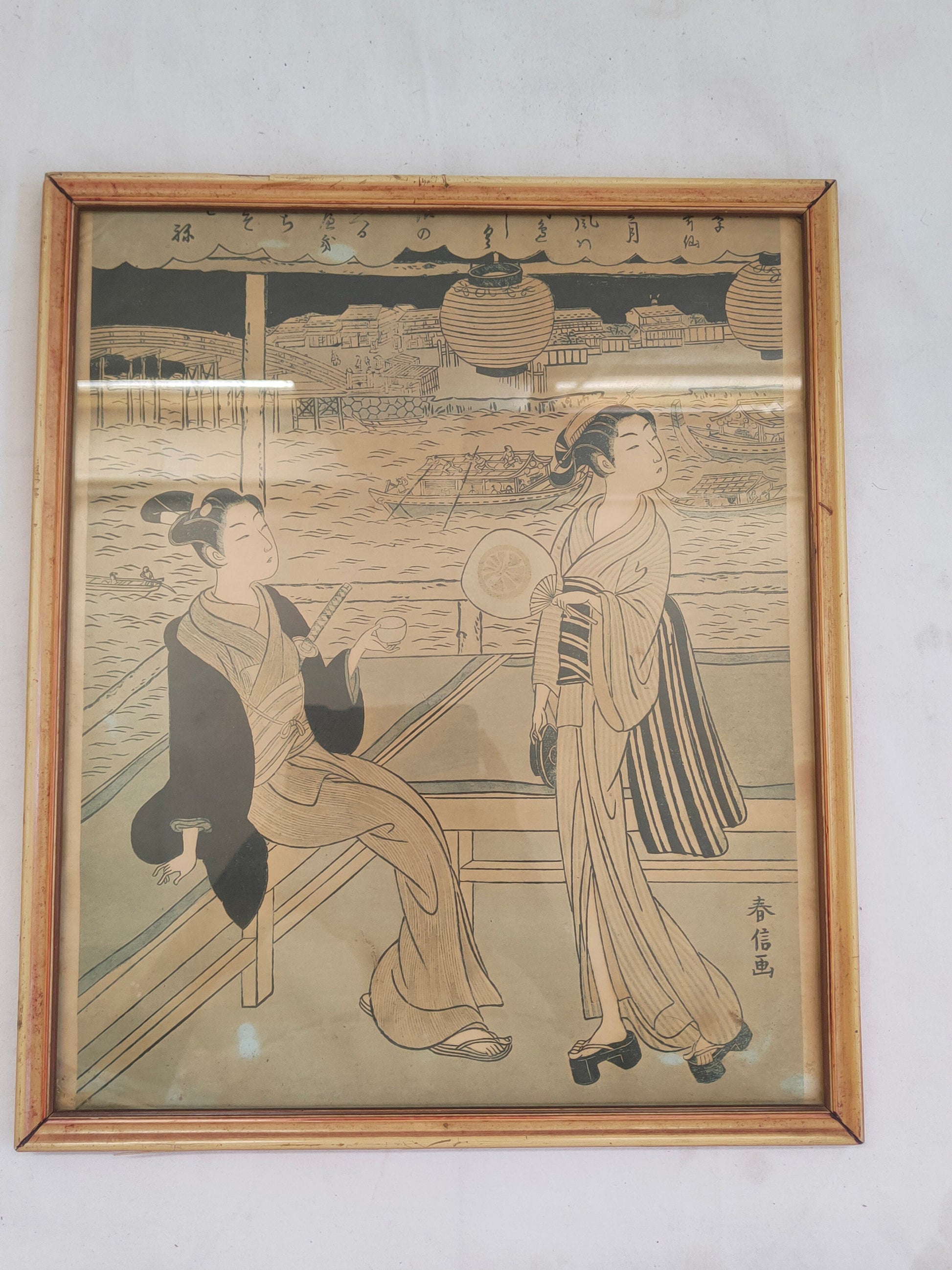 In conclusion, this charming antique framed print offers a glimpse into the distant past and invites us to immerse ourselves in the culture and elegance of Japanese tradition. The image of two women wearing kimonos and holding fans, one enjoying a cup of tea, captures the harmony and serenity of an everyday moment imbued with beauty and refinement.