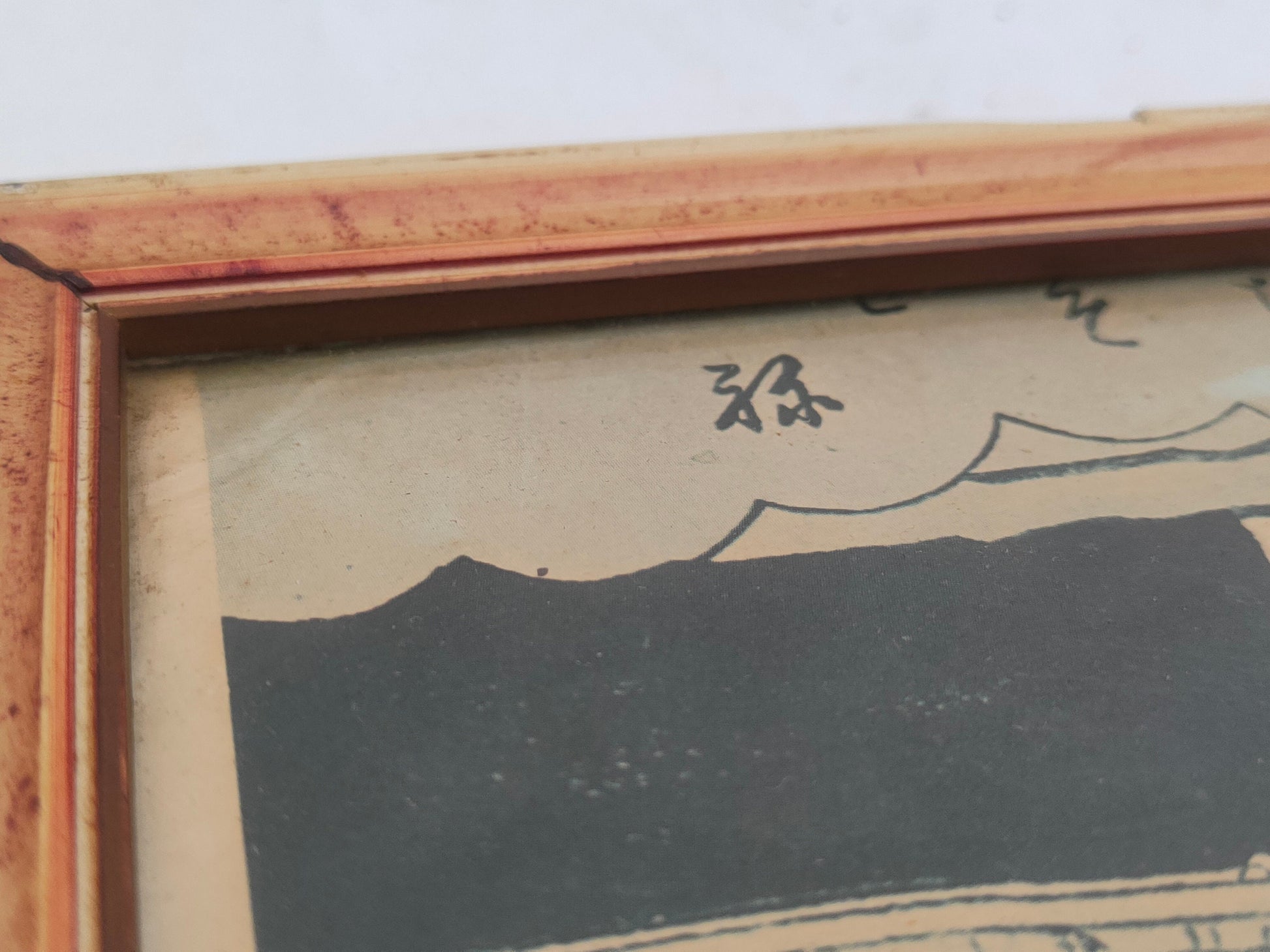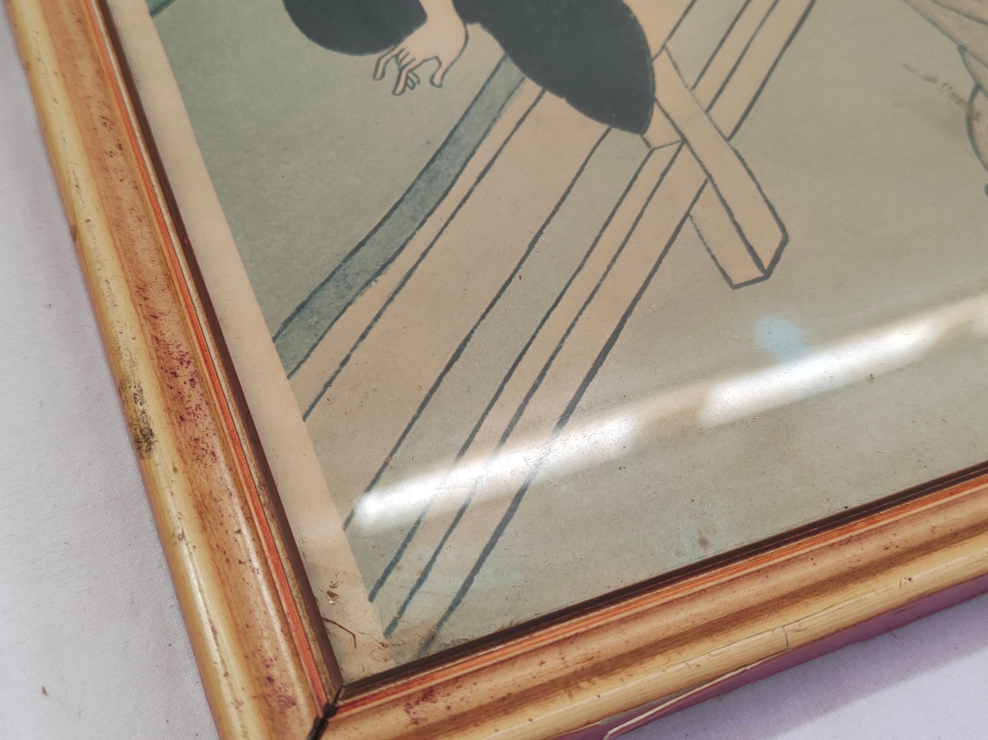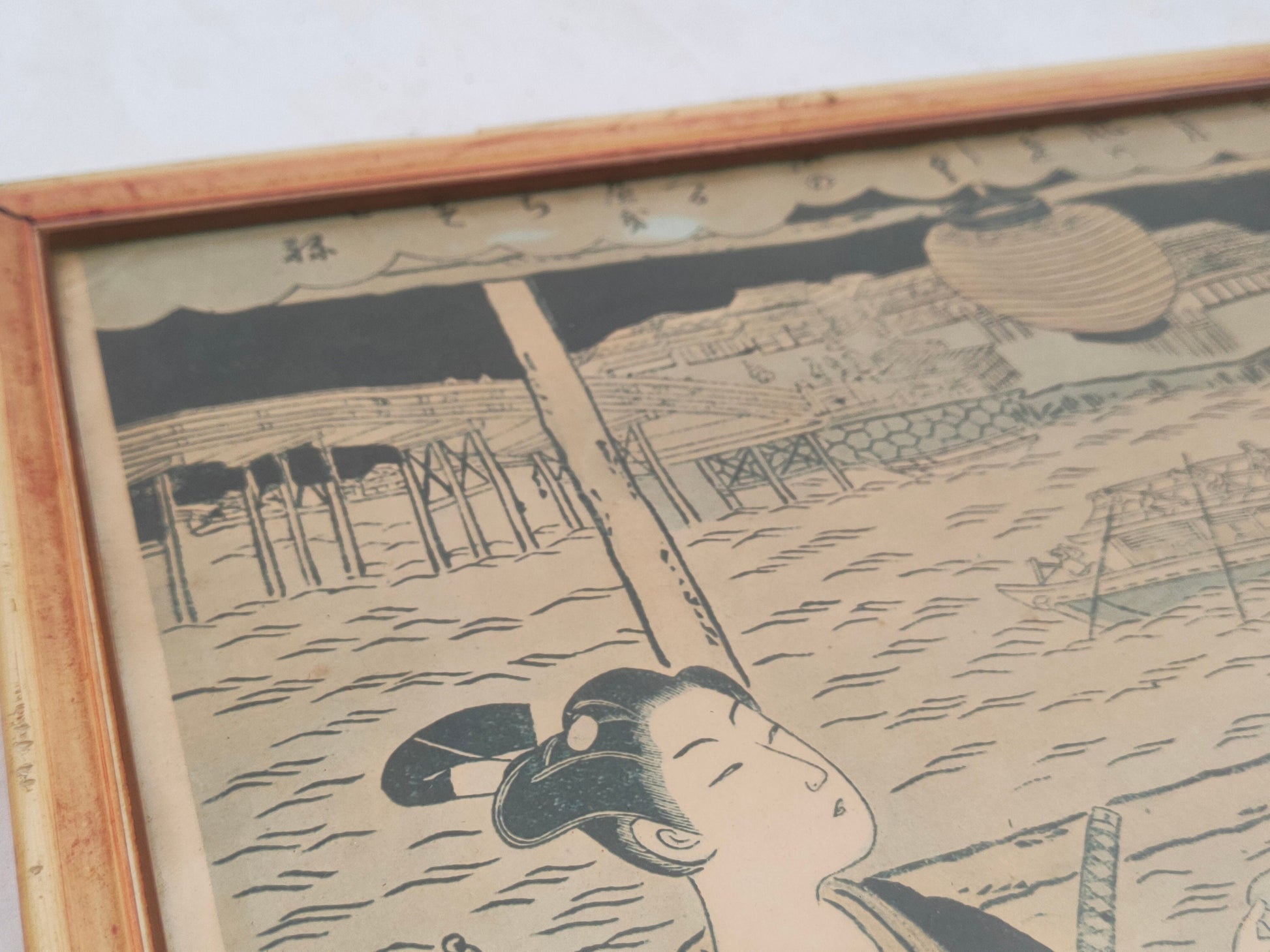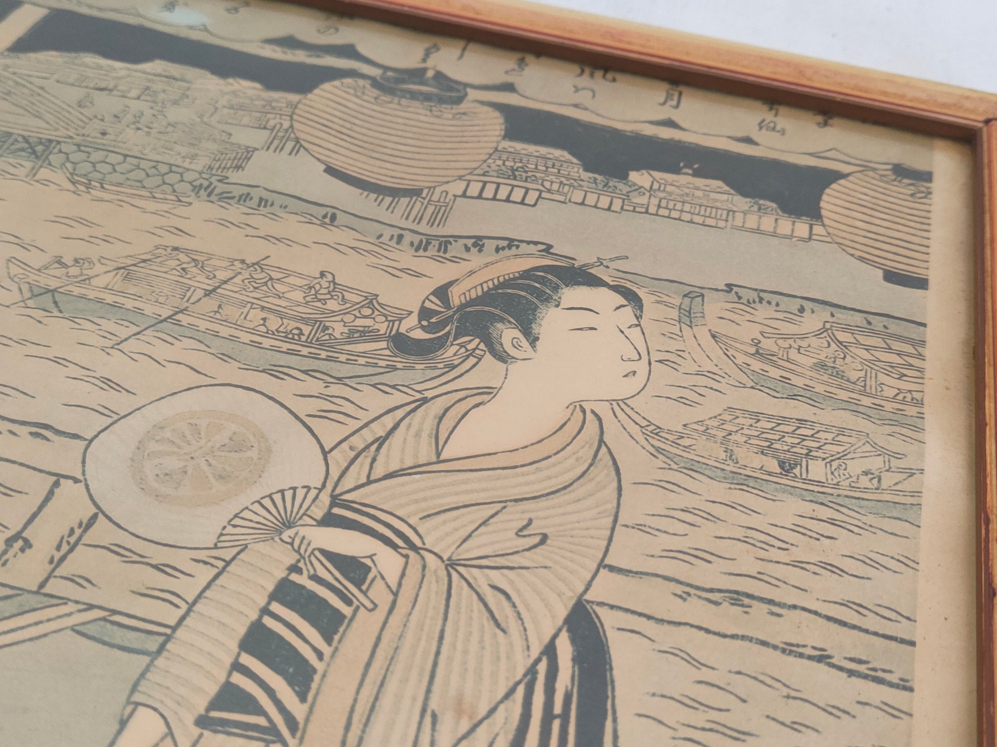 In conclusion, this charming antique framed print offers a glimpse into the distant past and invites us to immerse ourselves in the culture and elegance of Japanese tradition. The image of two women wearing kimonos and holding fans, one enjoying a cup of tea, captures the harmony and serenity of an everyday moment imbued with beauty and refinement.