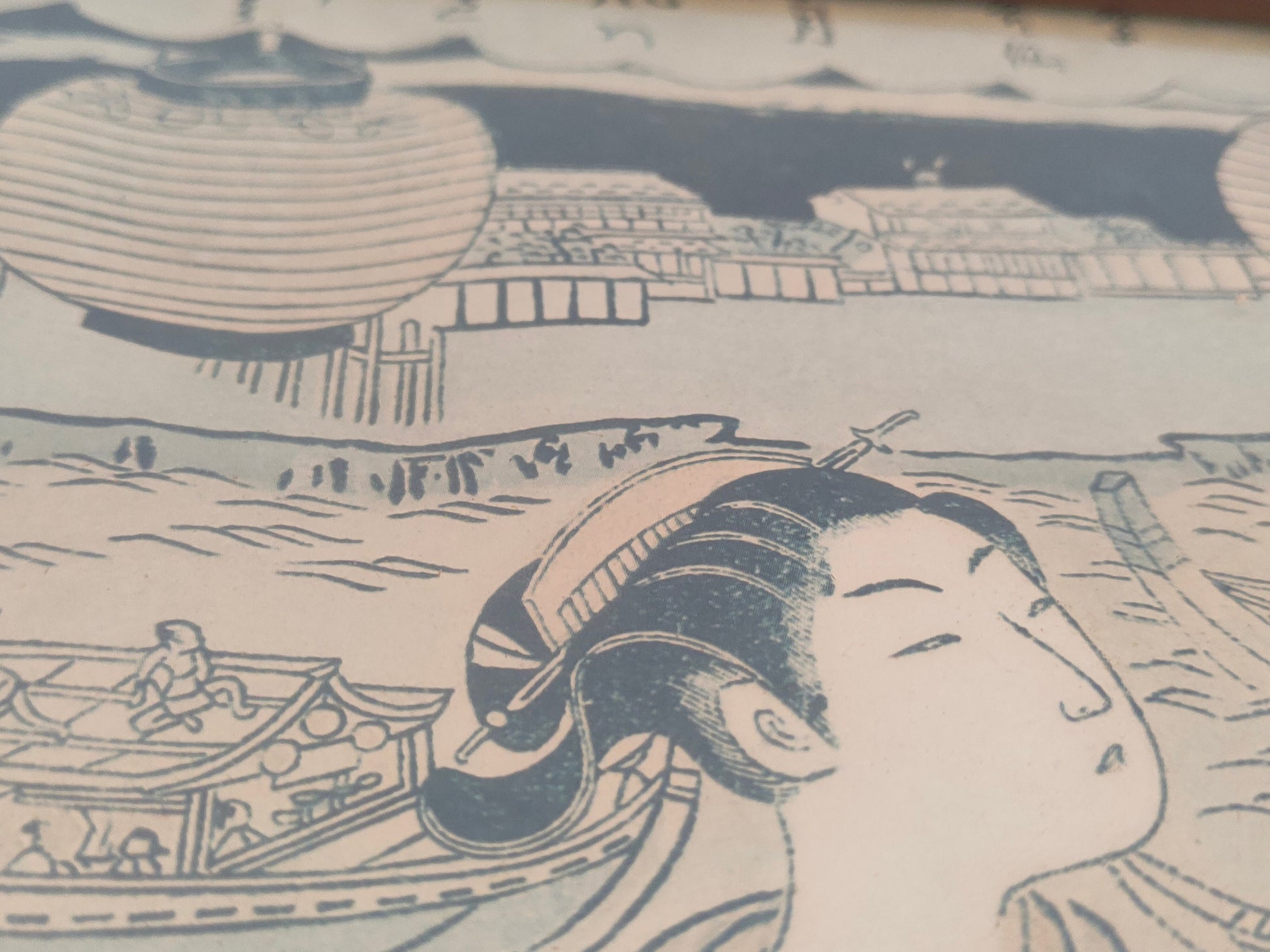 At the center of the mold, two women stand out, dressed in sumptuous kimonos, a symbol of refinement and tradition. Their garments are rendered with vibrant colors and finely crafted details, revealing the meticulous attention to detail that went into the work.