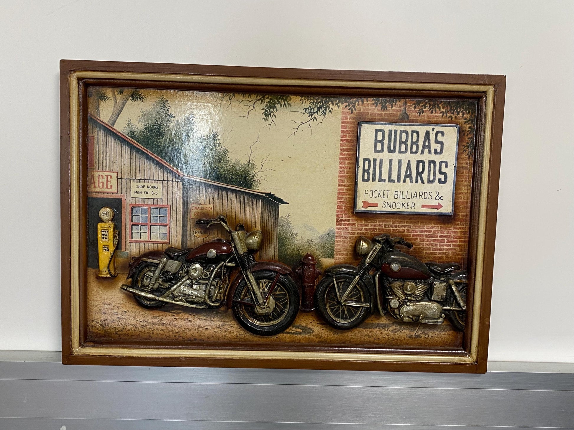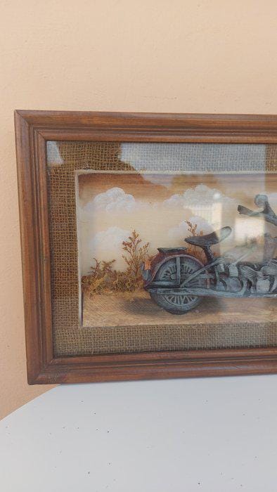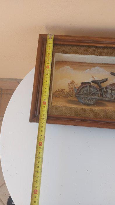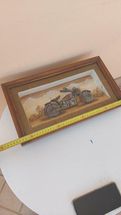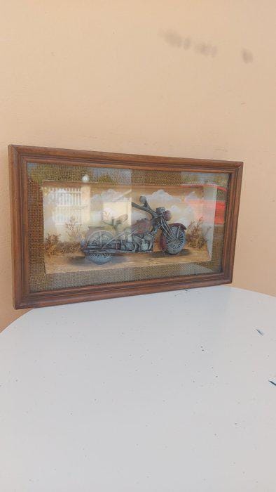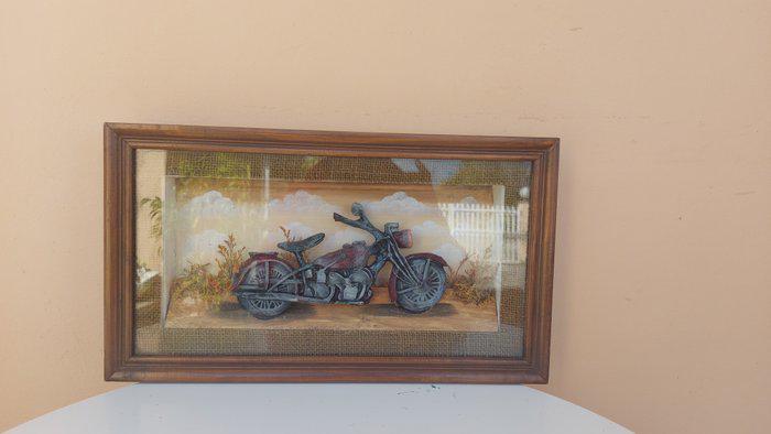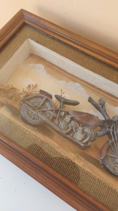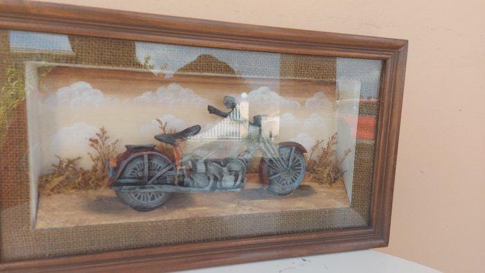 Affascinante diorama vintage raffigurante una moto custom in rilievo, realizzato interamente a mano con dettagli minuziosi. Questo pezzo unico, realizzato con una combinazione di legno, metallo e tela, cattura l‘essenza dello stile retrò, perfetto per collezionisti e appassionati di motociclette.