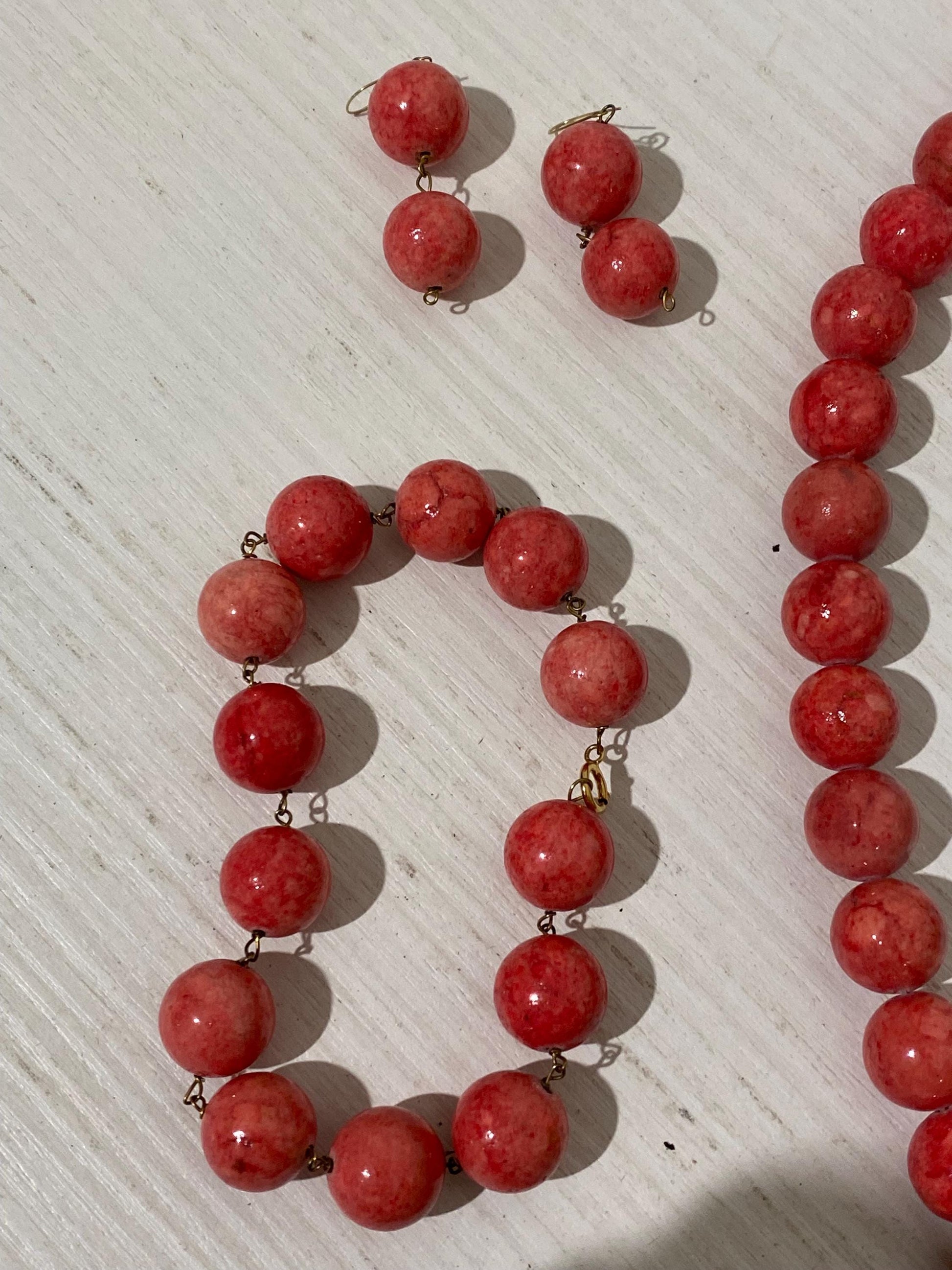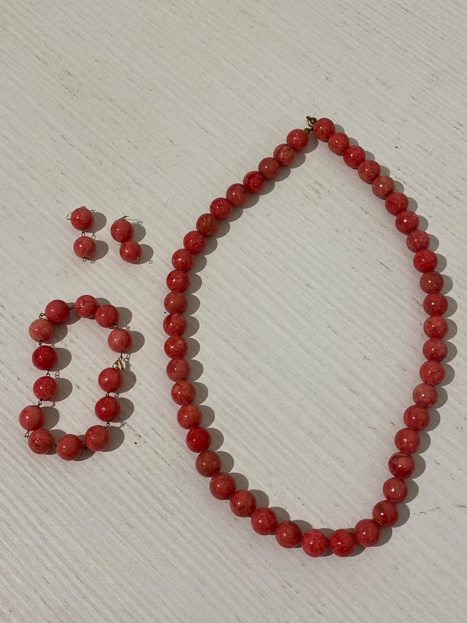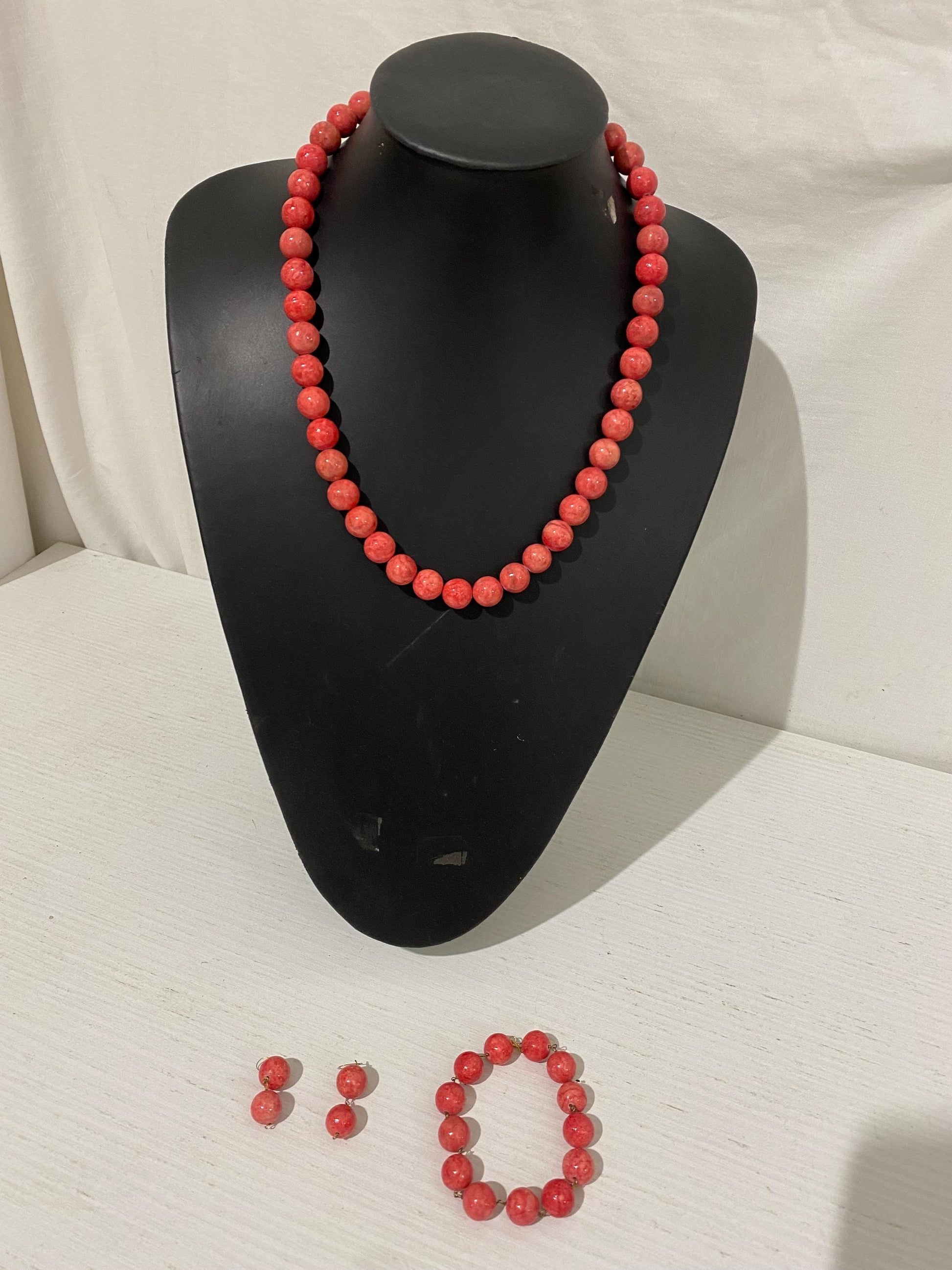 Un’affascinante parure vintage composta da collana, bracciale e orecchini, impreziositi da splendide perline sfaccettate di un vivace colore rosso. Un accessorio unico che aggiunge un tocco di classe al tuo look.