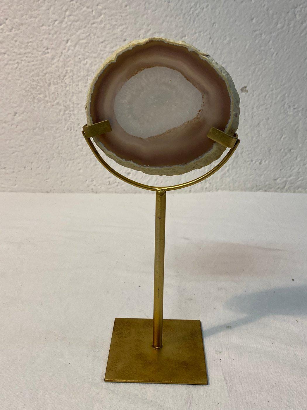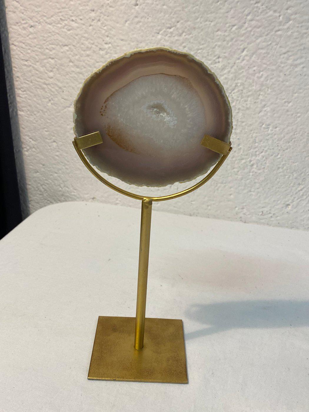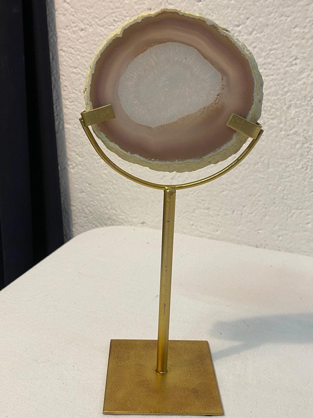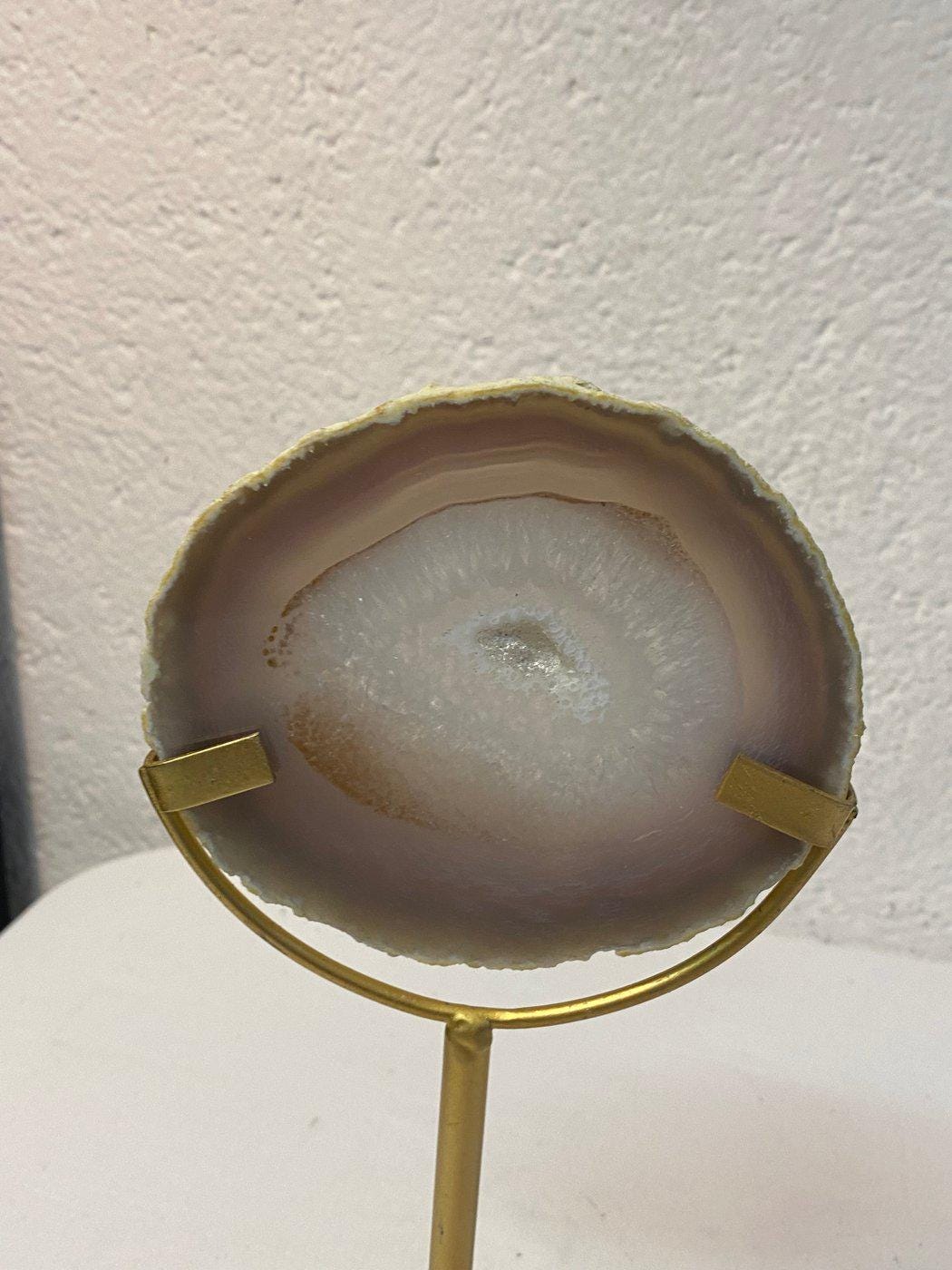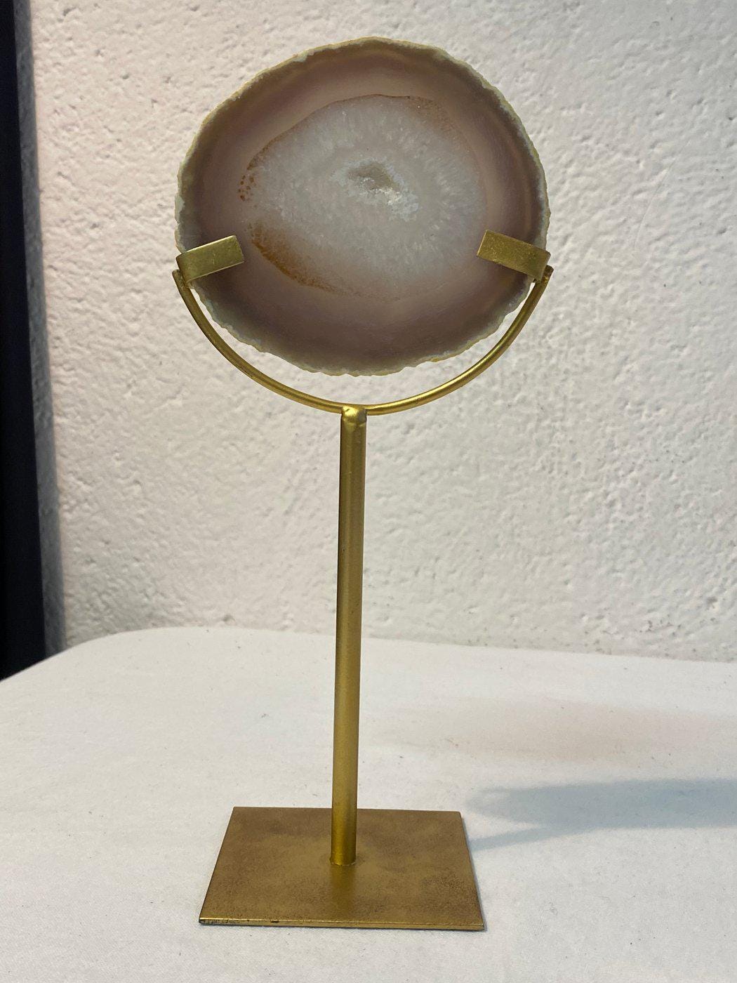 Questa raffinata fetta di agata su un supporto in metallo dorato è un complemento d’arredo sofisticato che porta la bellezza naturale in qualsiasi ambiente. L’agata, con le sue venature traslucide e armoniche, è apprezzata per la sua energia equilibrante e armonizzante. La combinazione di toni neutri e caldi si integra facilmente in interni moderni e classici, rendendola ideale per salotti, uffici o studi.