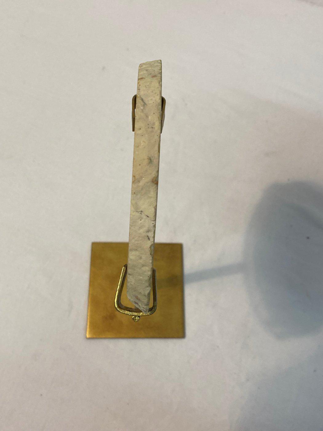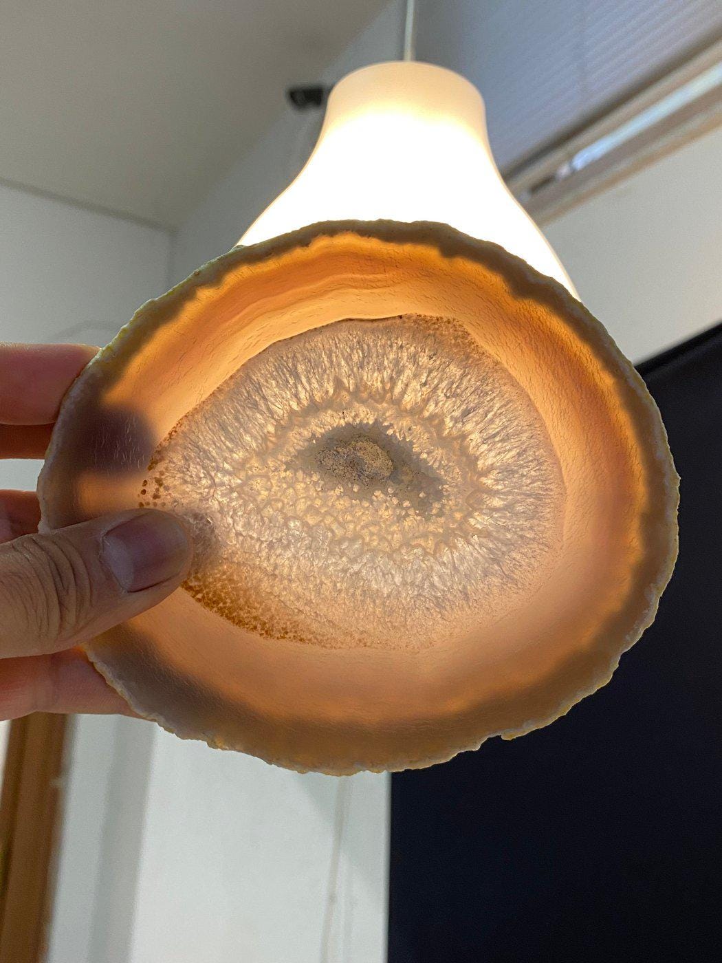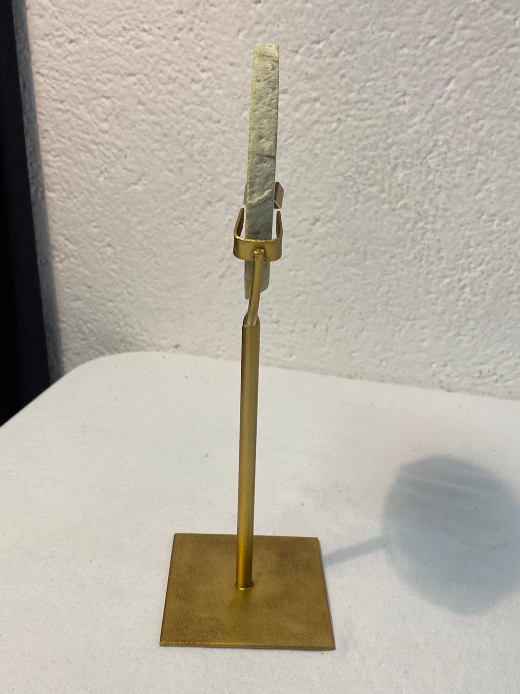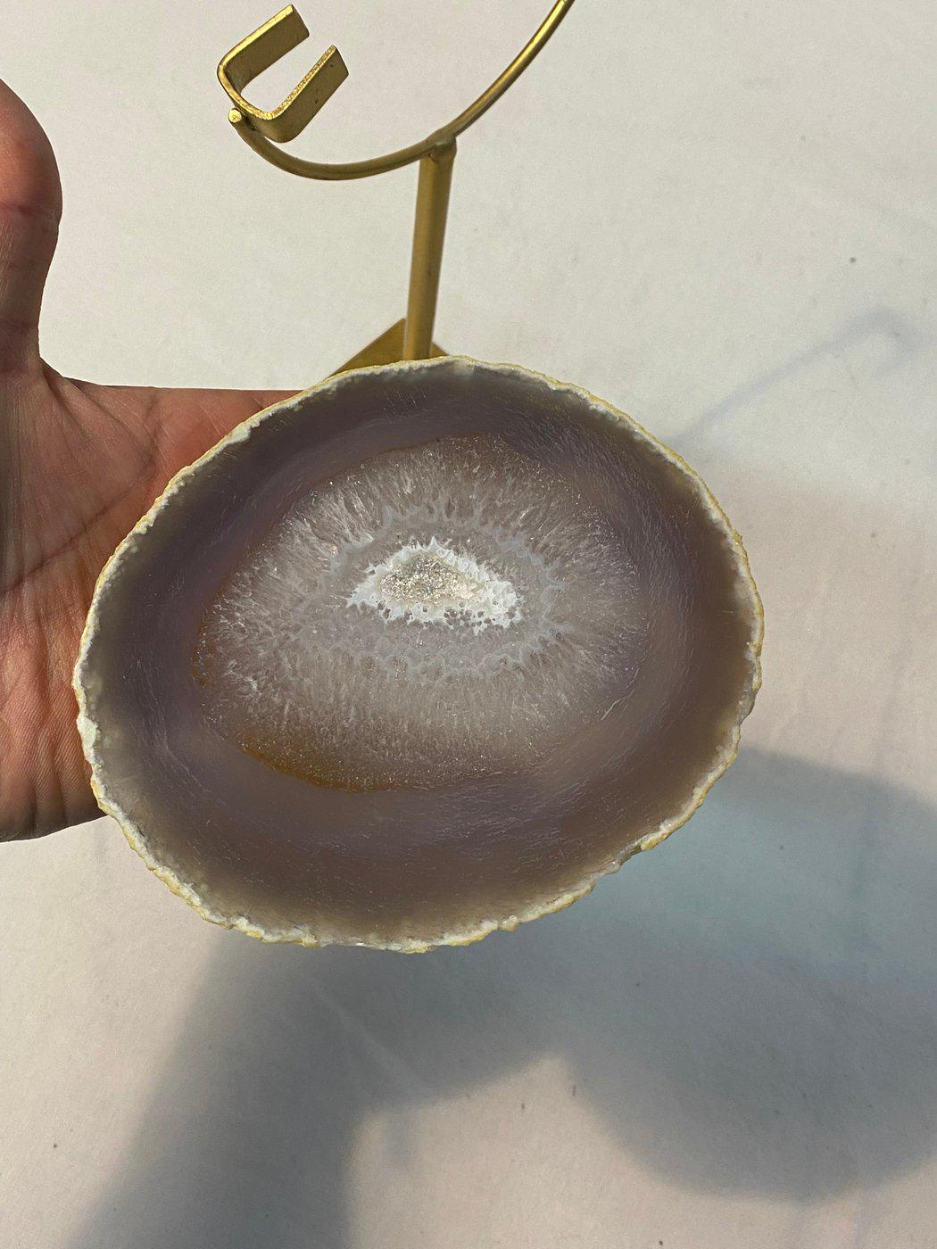 La fetta di agata misura circa 13 x 11,5 x 1,2 cm (5,12 x 4,53 x 0,47 pollici), offrendo una superficie ampia e decorativa. L’intera struttura, compresa la base, pesa circa 0,40 kg (0,88 libbre), garantendo stabilità e permettendo al minerale di essere il vero protagonista visivo. Un oggetto perfetto per collezionisti e appassionati di elementi naturali unici e affascinanti.