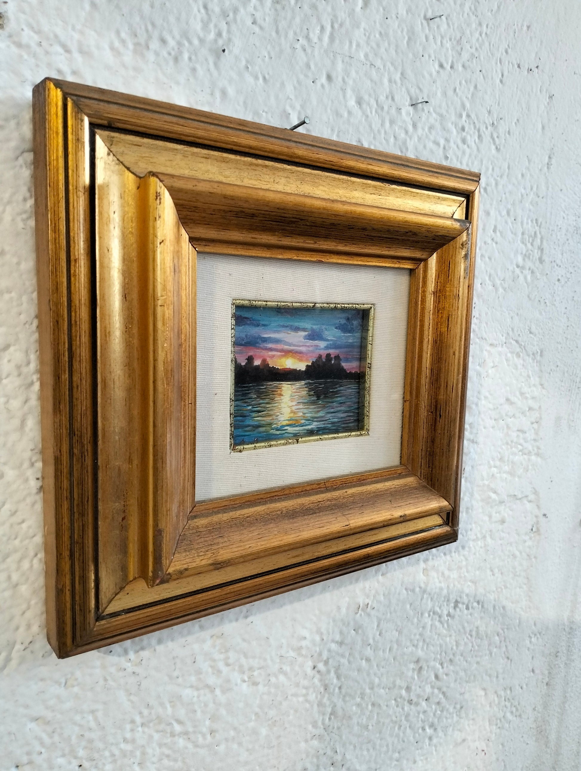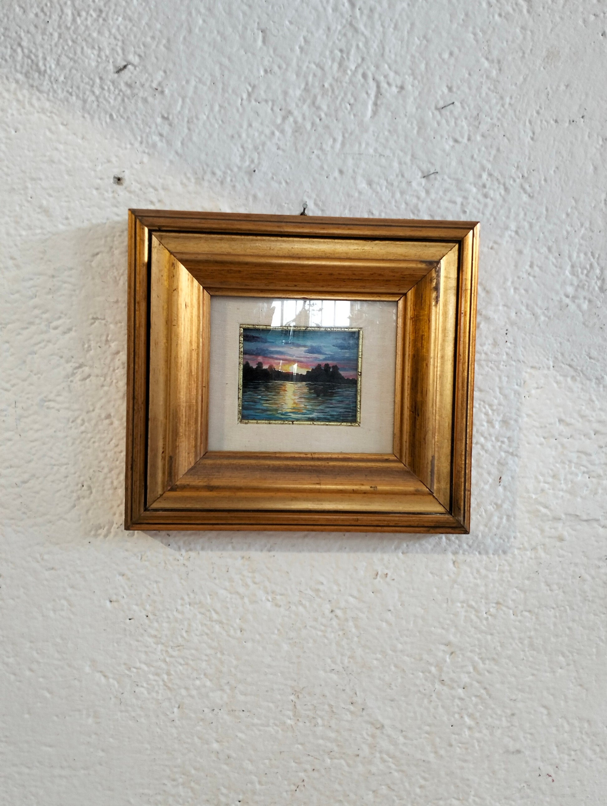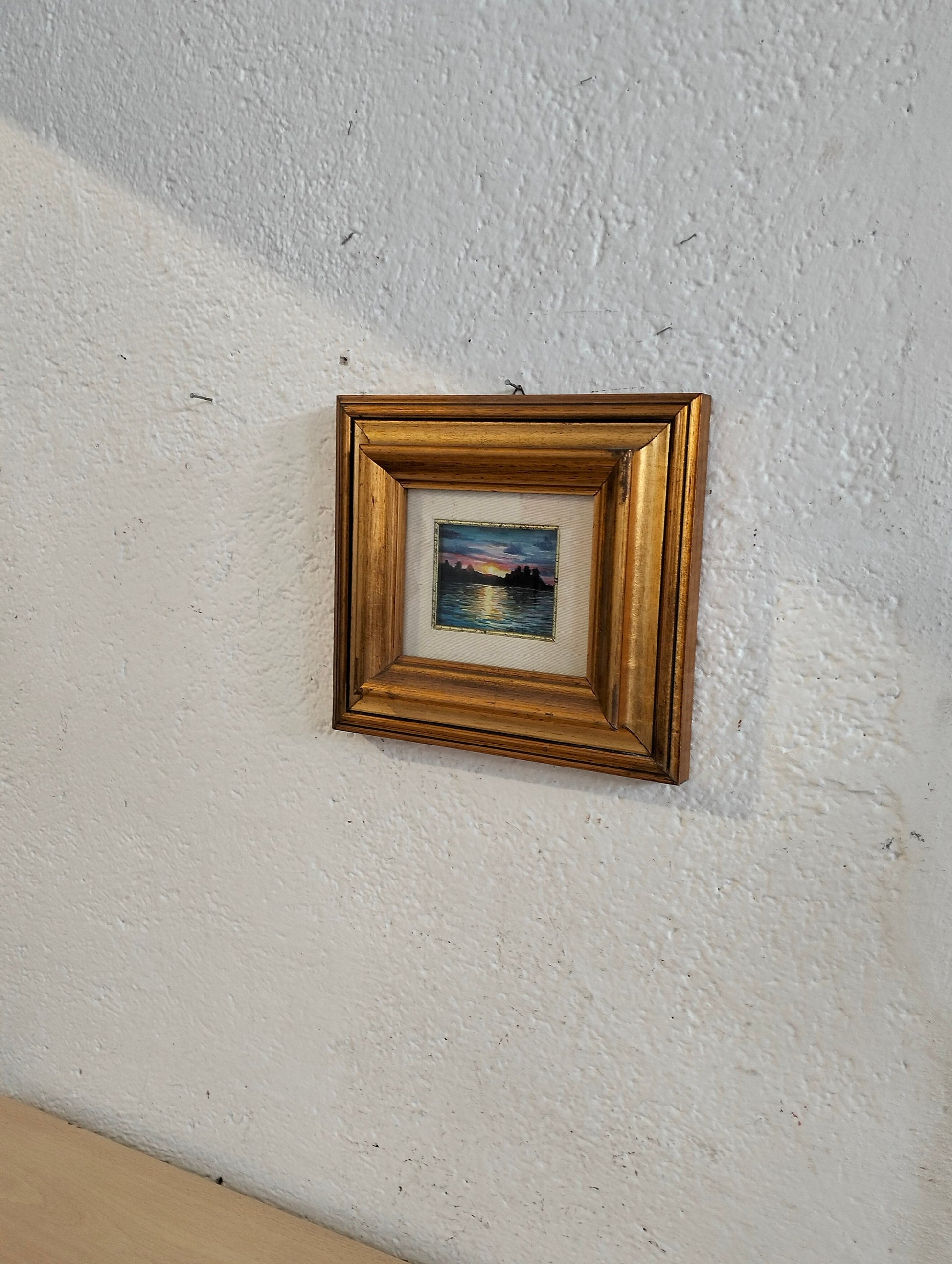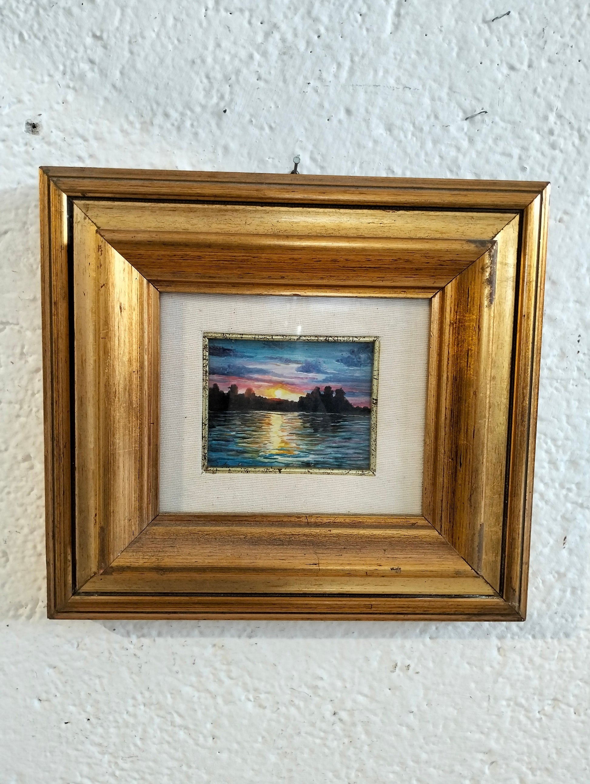 small painted picture representing a sunset the measurements of the picture are 10x7,50 cm while the golden frame measures 29,50x27 cm
