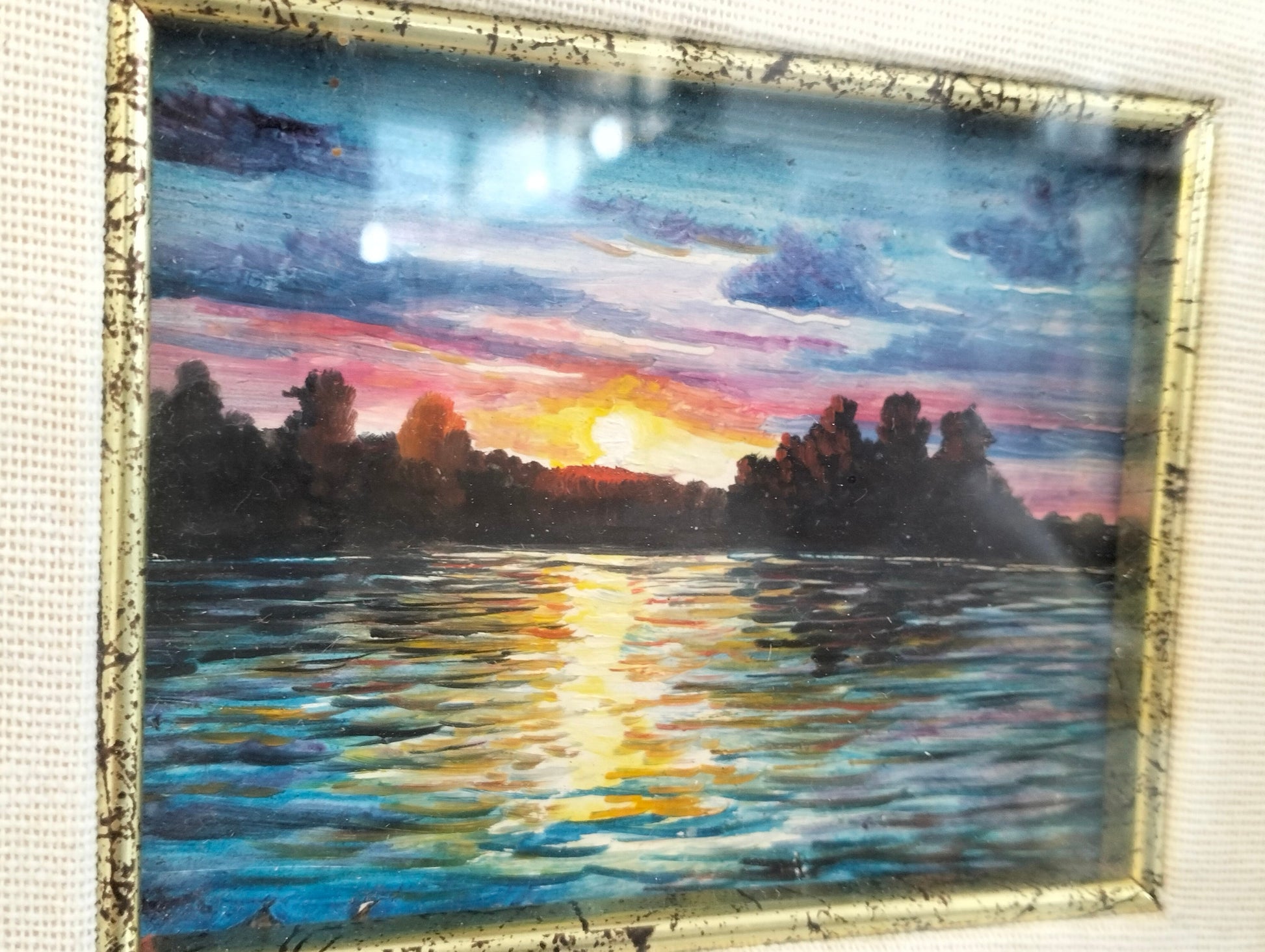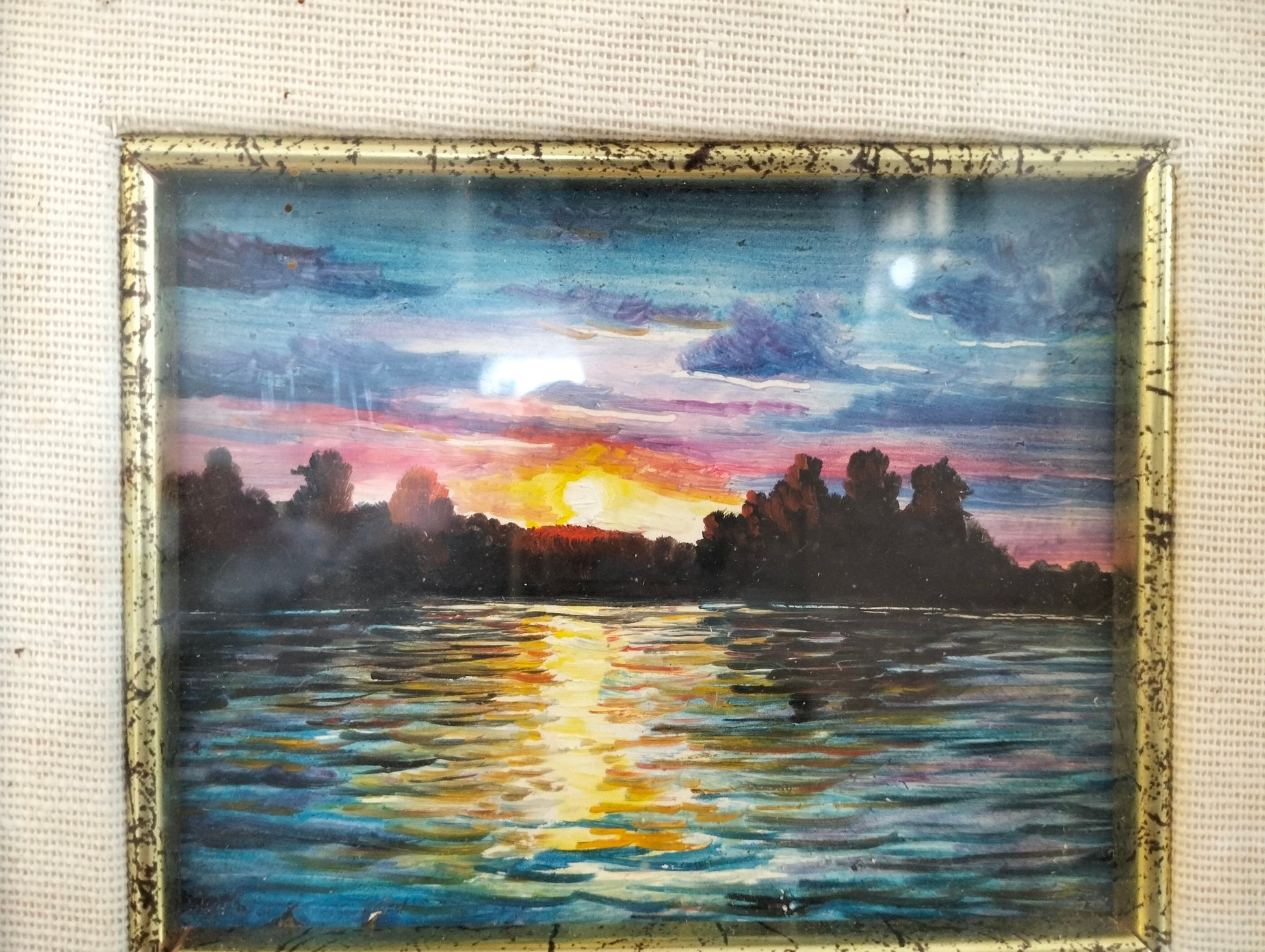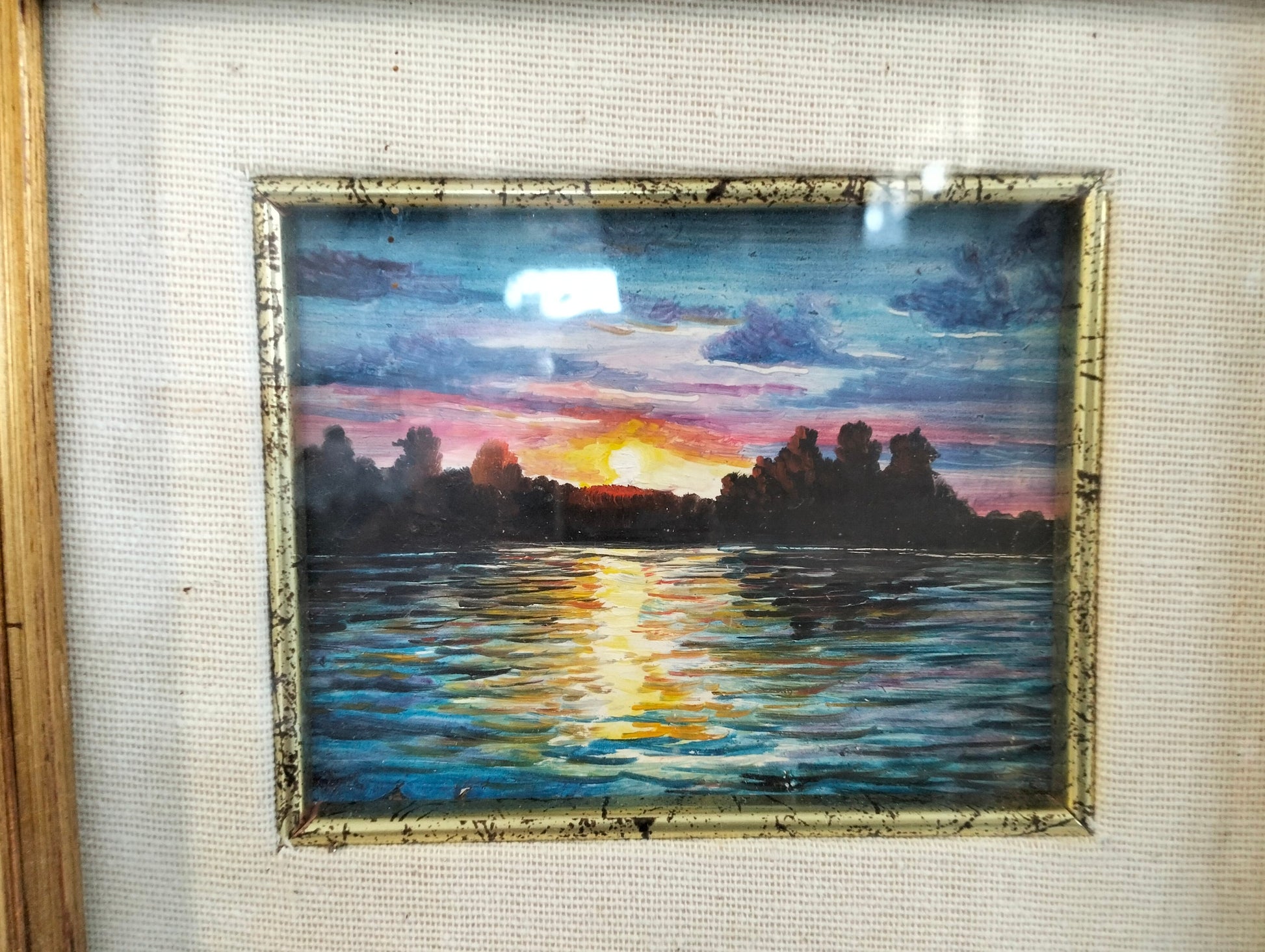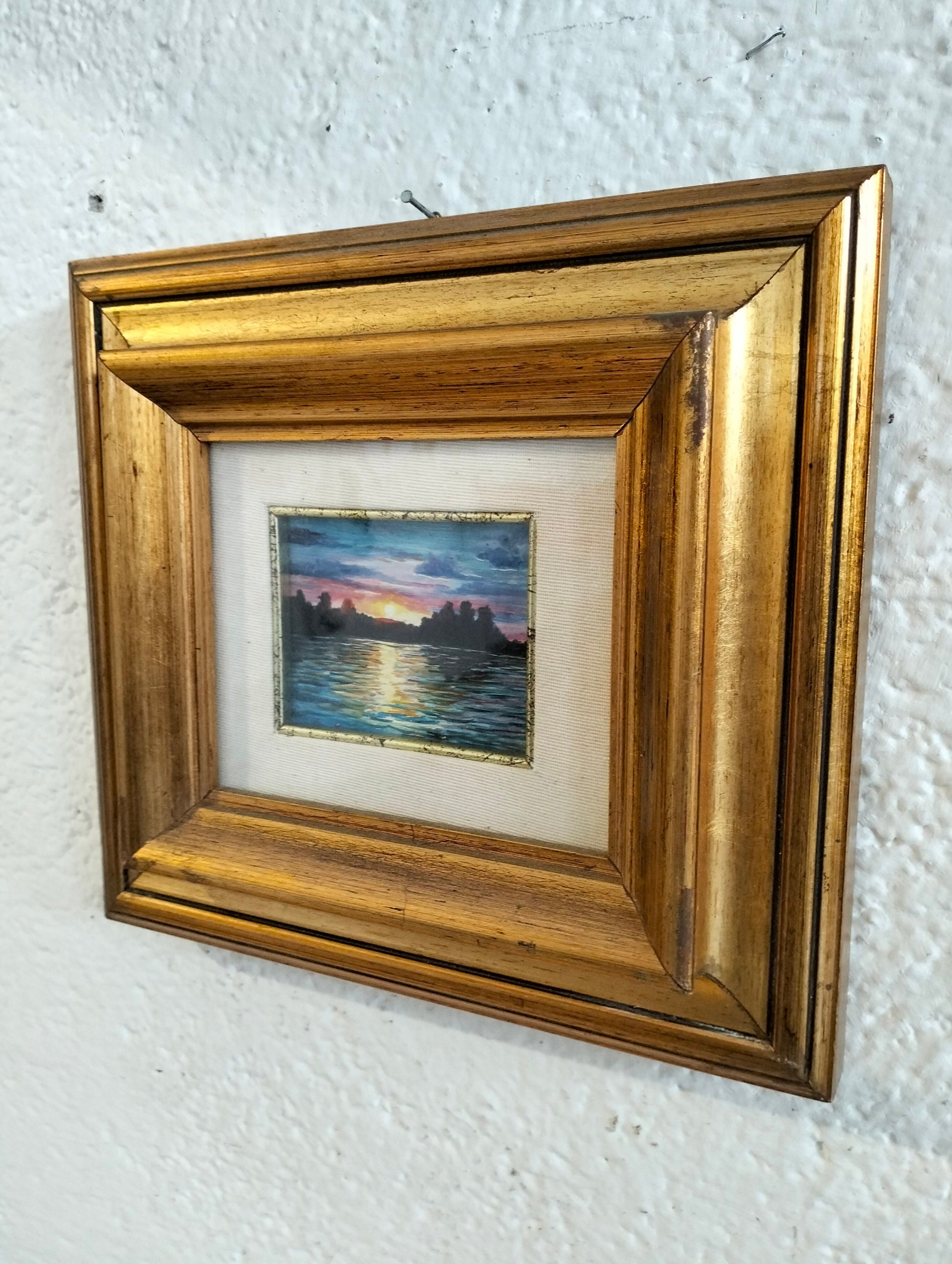 small painted picture representing a sunset the measurements of the picture are 10x7,50 cm while the golden frame measures 29,50x27 cm