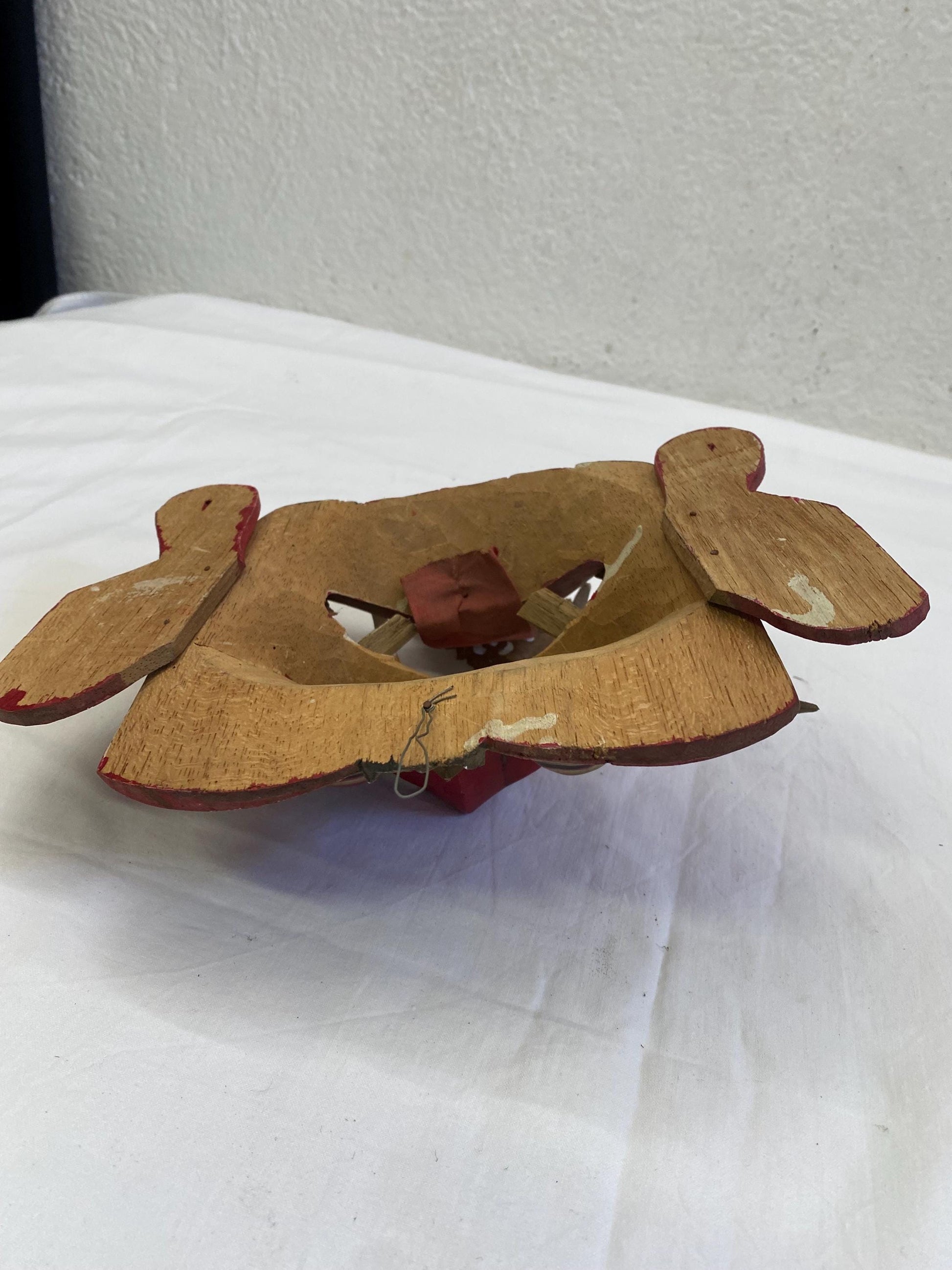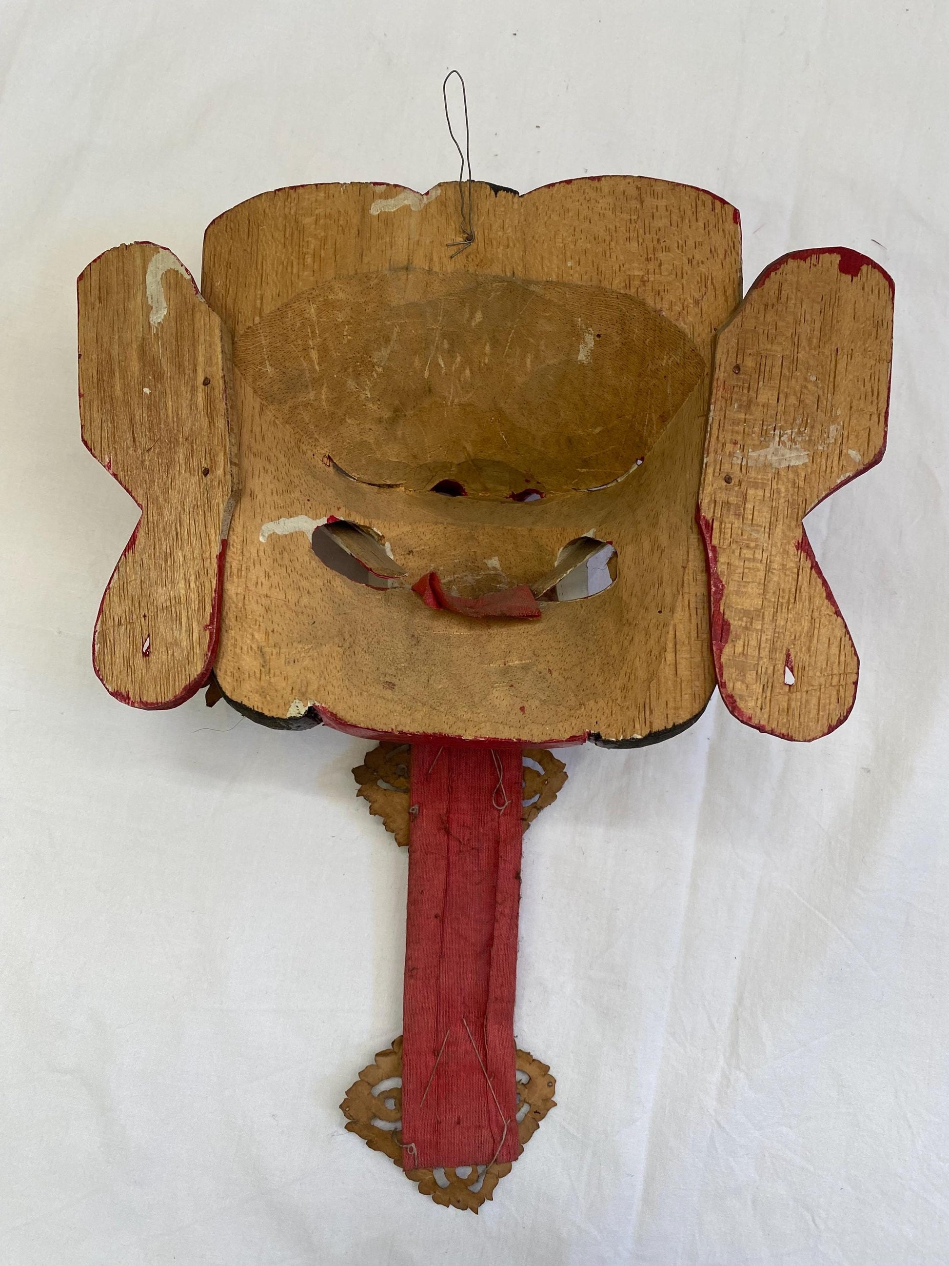 Dettagli: Occhi bulbosi neri, orecchie grandi, bocca grande con denti sporgenti e quattro zanne (due rivolte verso l‘alto e due verso il basso). Un lungo filo di cotone arancione con due fiori di carta e uno specchio al centro pende dalla bocca, simulando una lingua