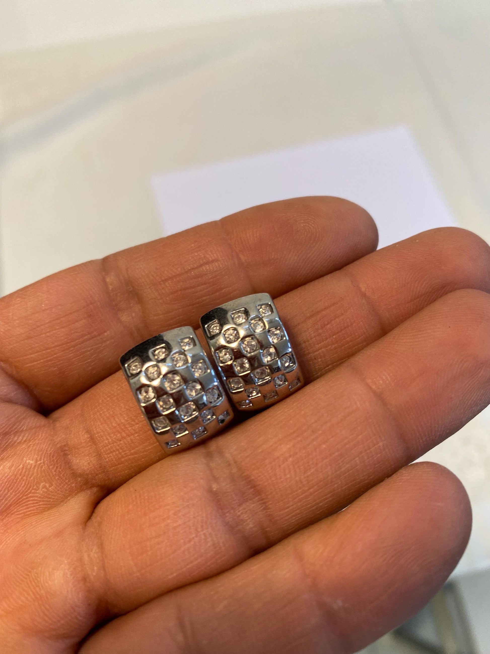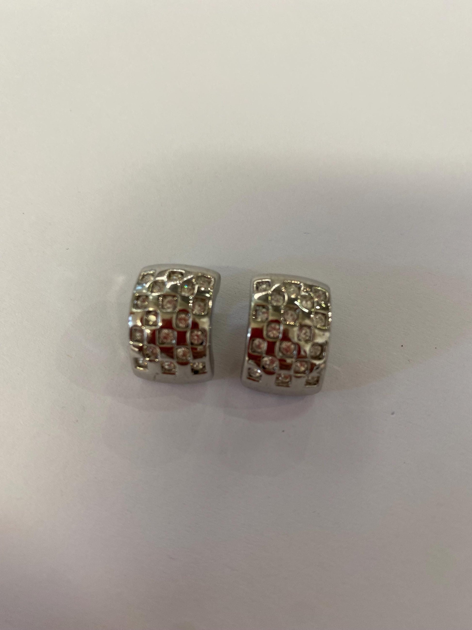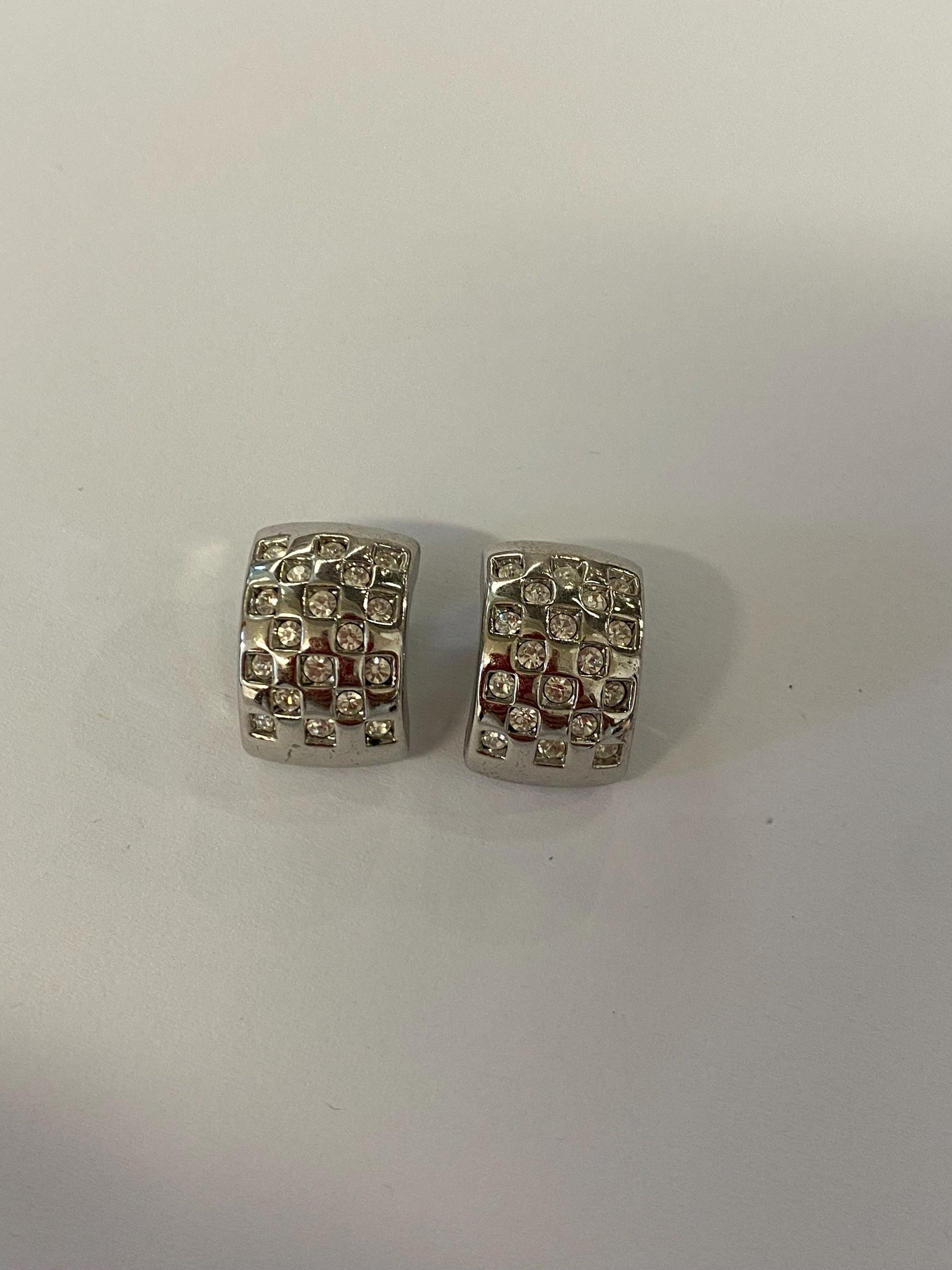 Orecchini a clip metallo argentato con strass pavé | Vintage eleganti anni '90 1,5x1 cm | Bijoux luminosi da sera