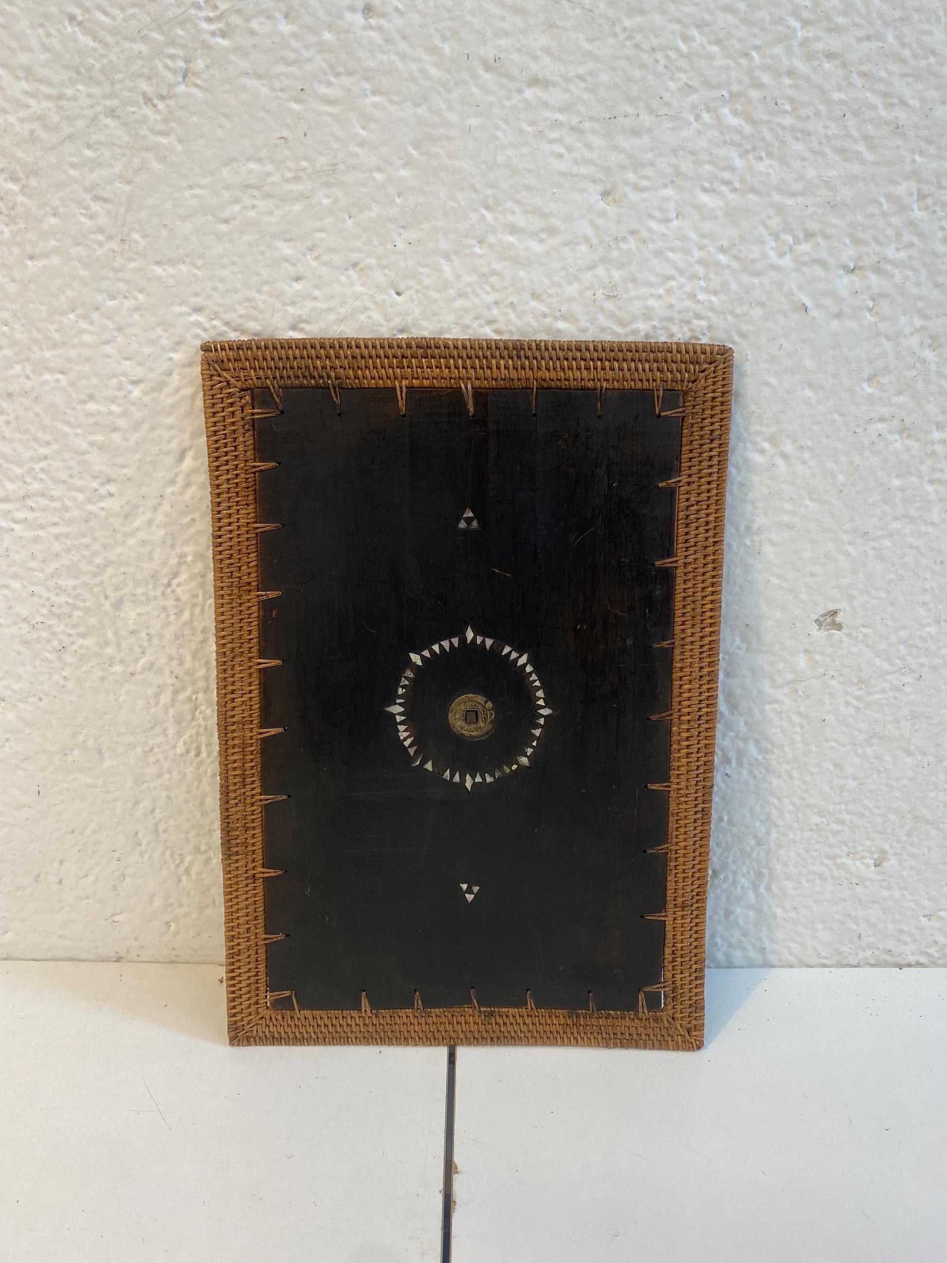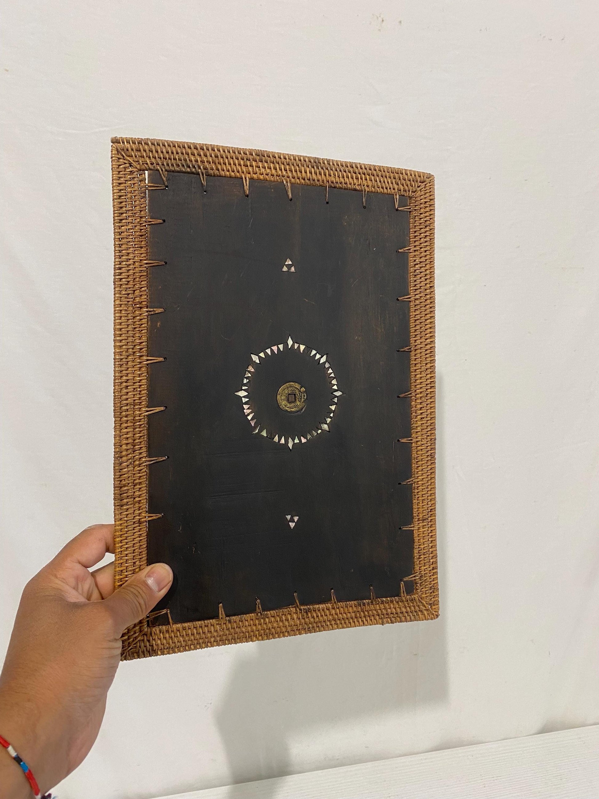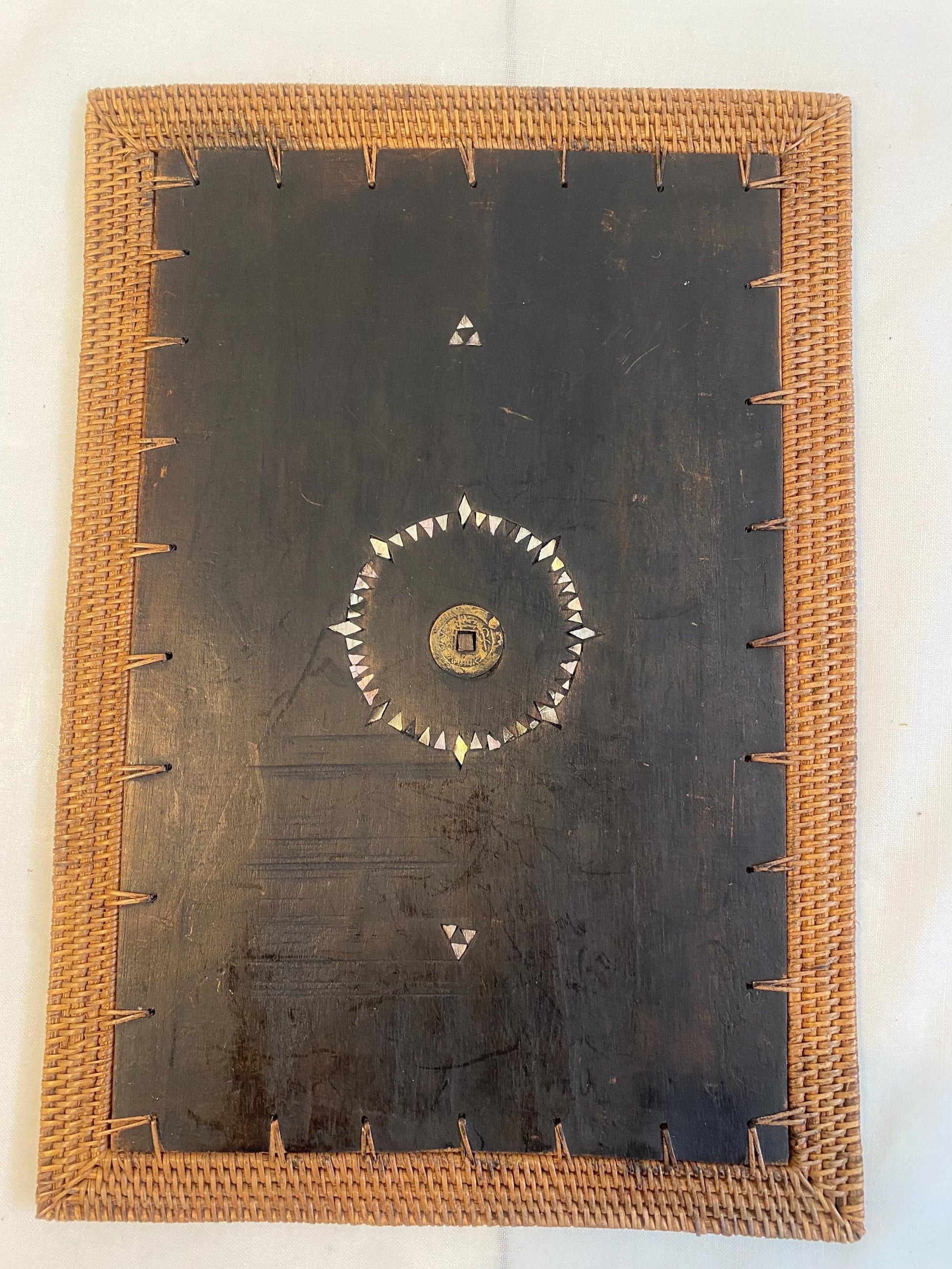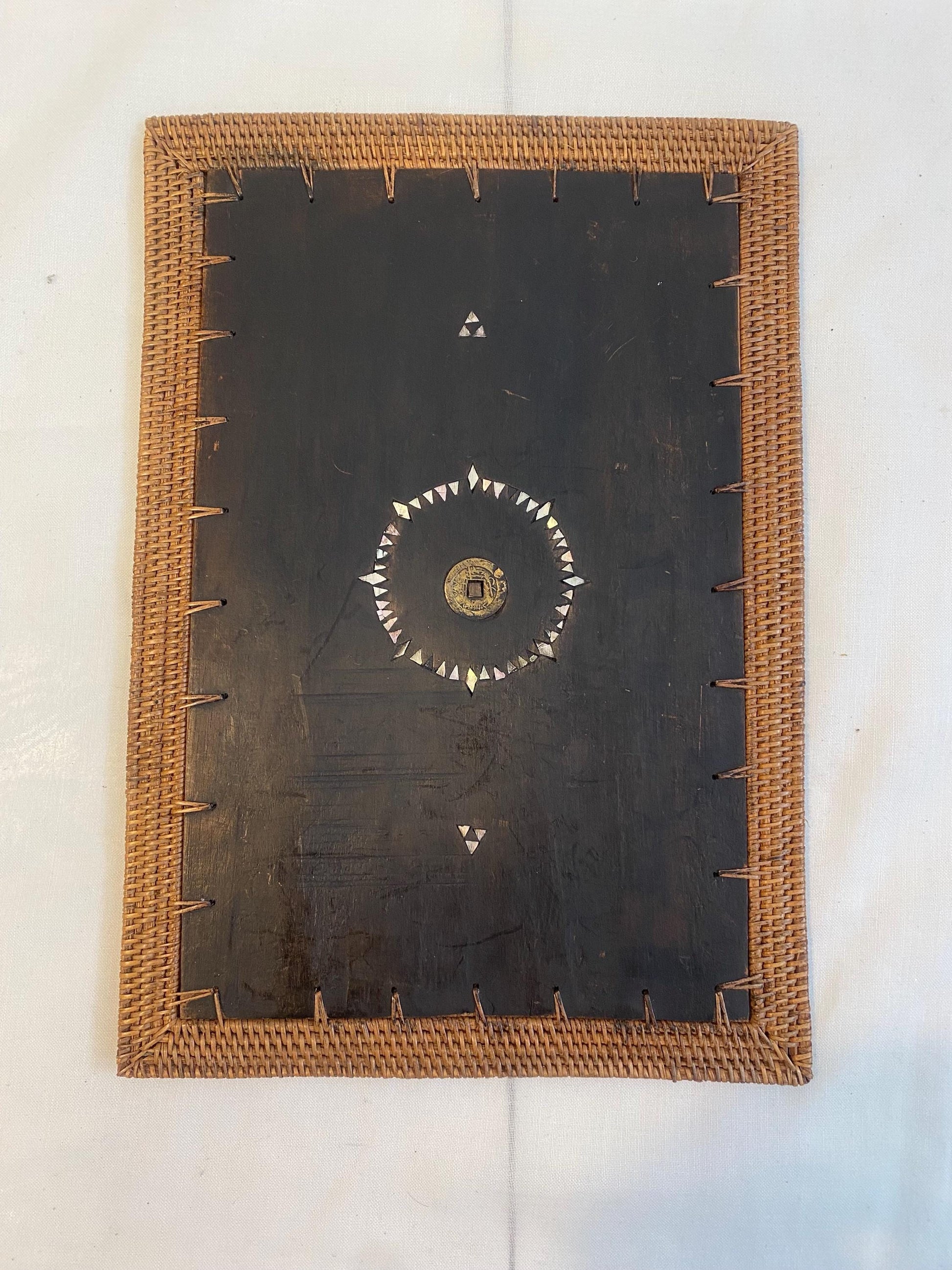 Pannello etnico da parete con moneta asiatica, legno intarsiato a mano con madreperla e bordo in rattan 34x23 cm