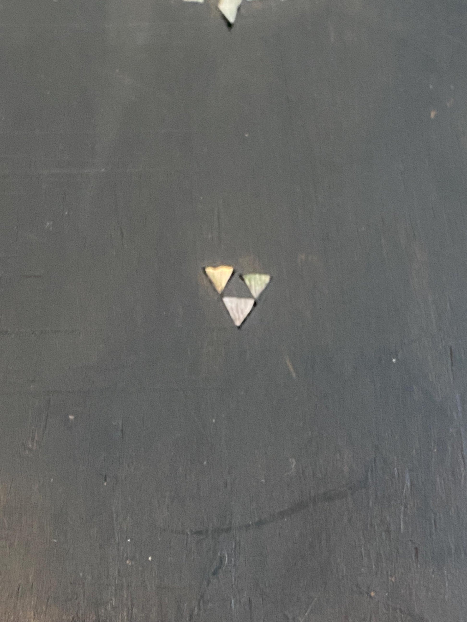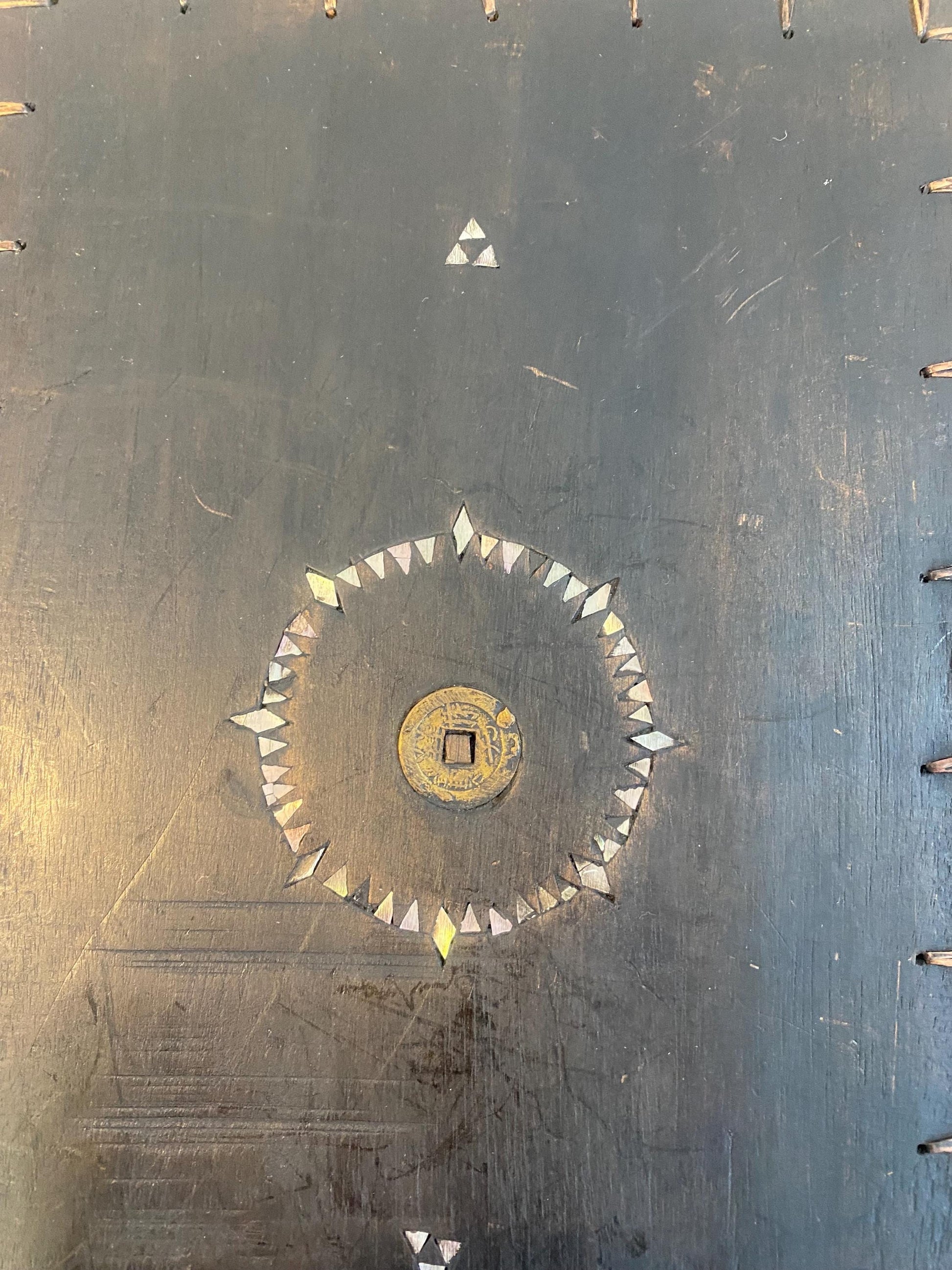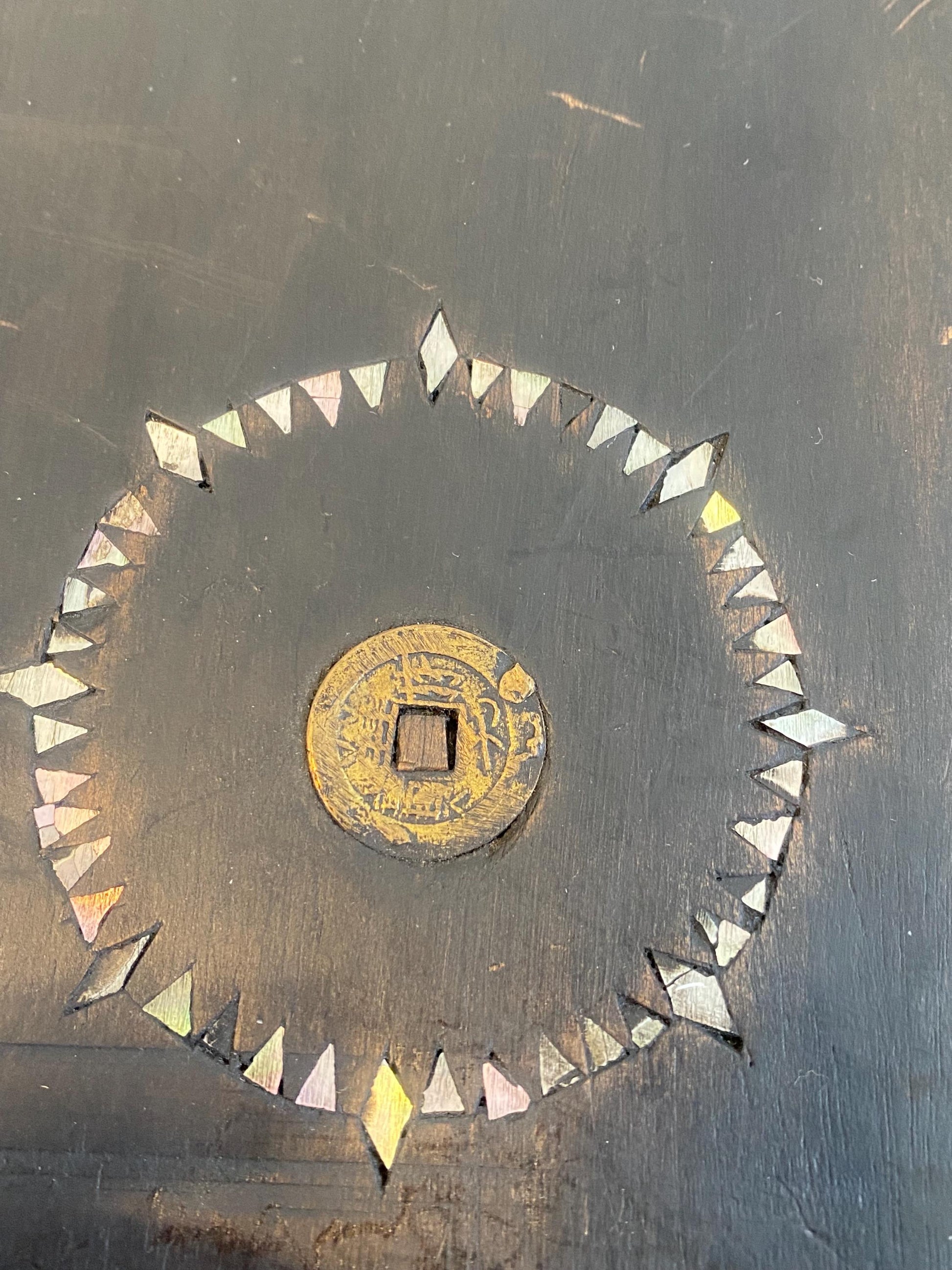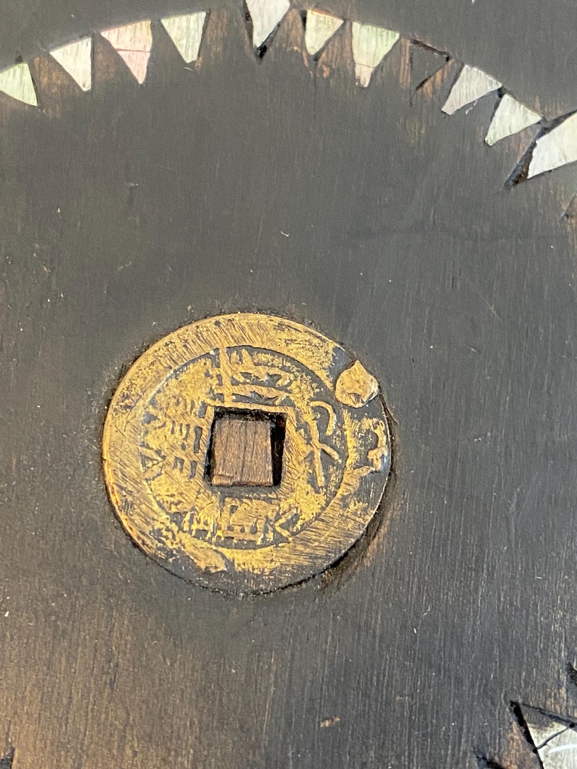 Dai un tocco unico ed esotico ai tuoi ambienti con questo splendido pannello decorativo in legno, realizzato artigianalmente. Il protagonista del design è una moneta asiatica con foro quadrato incastonata al centro, simbolo tradizionale di fortuna e prosperità. A circondarla, un raffinato intarsio geometrico in madreperla che riflette la luce con sfumature cangianti, creando un effetto visivo affascinante.