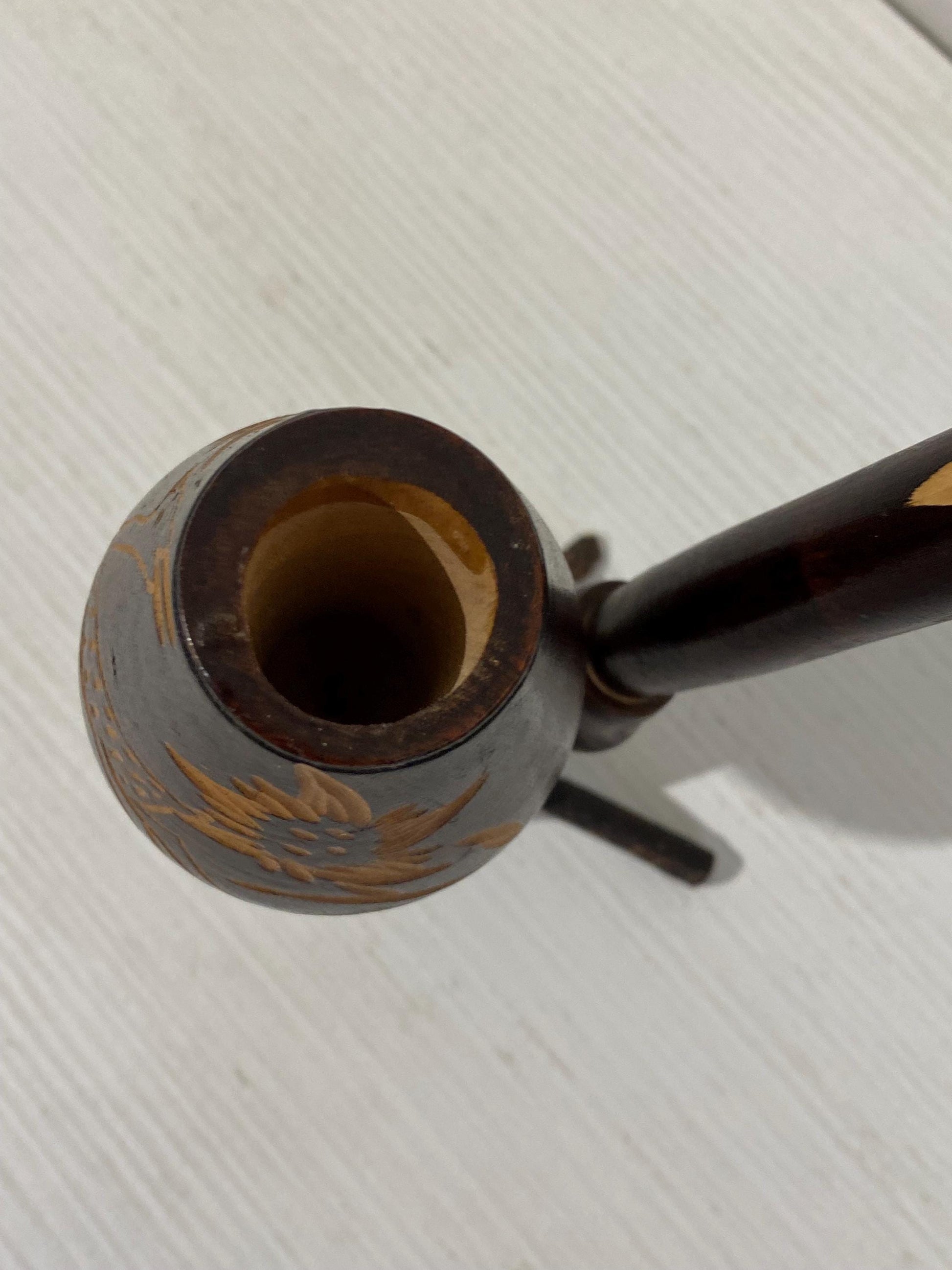 Scopri questa elegante pipa funzionante vintage in legno intagliato, impreziosita da dettagli floreali artigianali. Realizzata con maestria, questa pipa non è solo un oggetto da collezione, ma è perfettamente funzionante e pronta per essere utilizzata. Un pezzo autentico che unisce funzionalità e design, ideale per gli amanti del fumo tradizionale e per chi cerca un oggetto raffinato e originale.