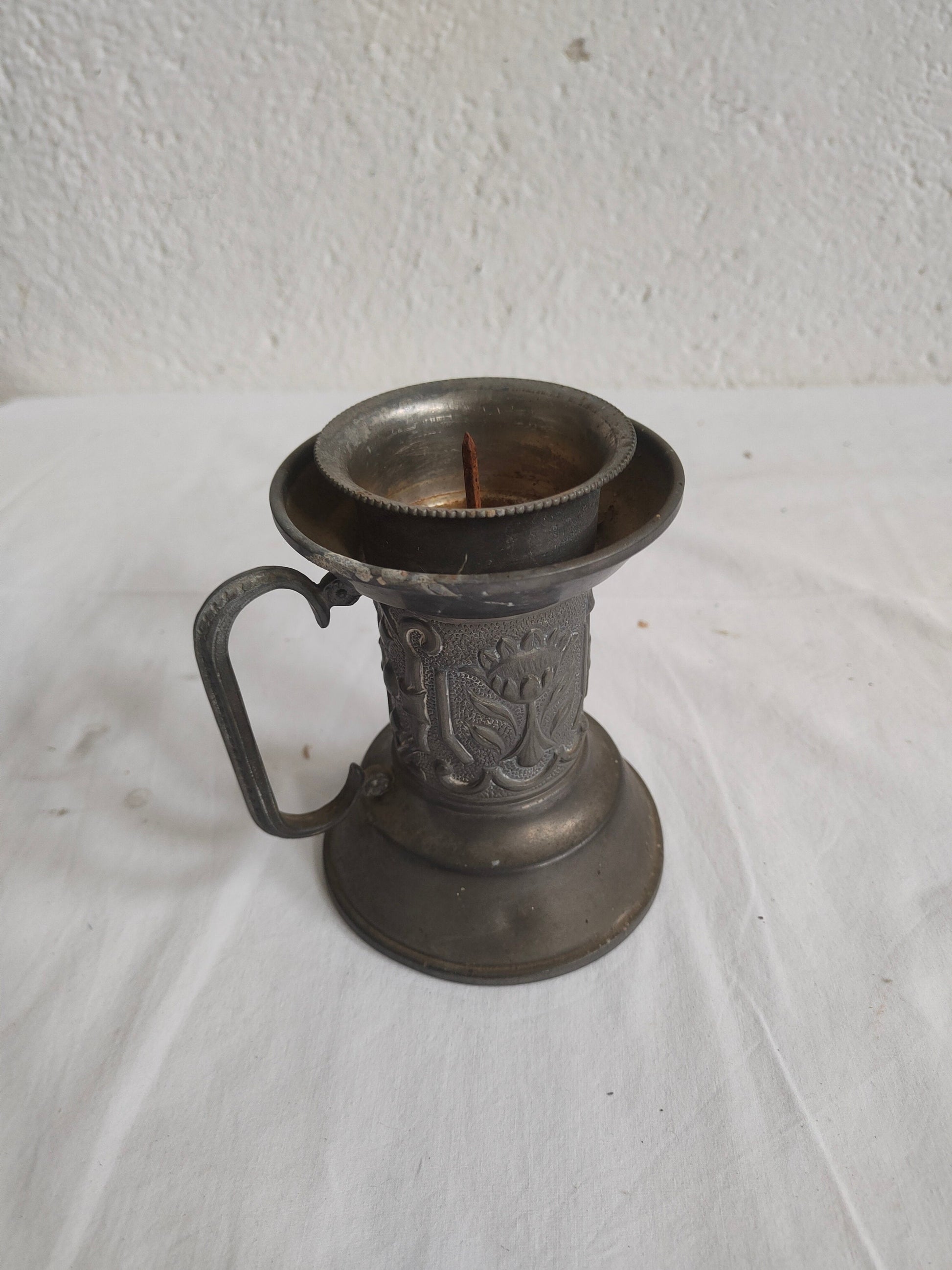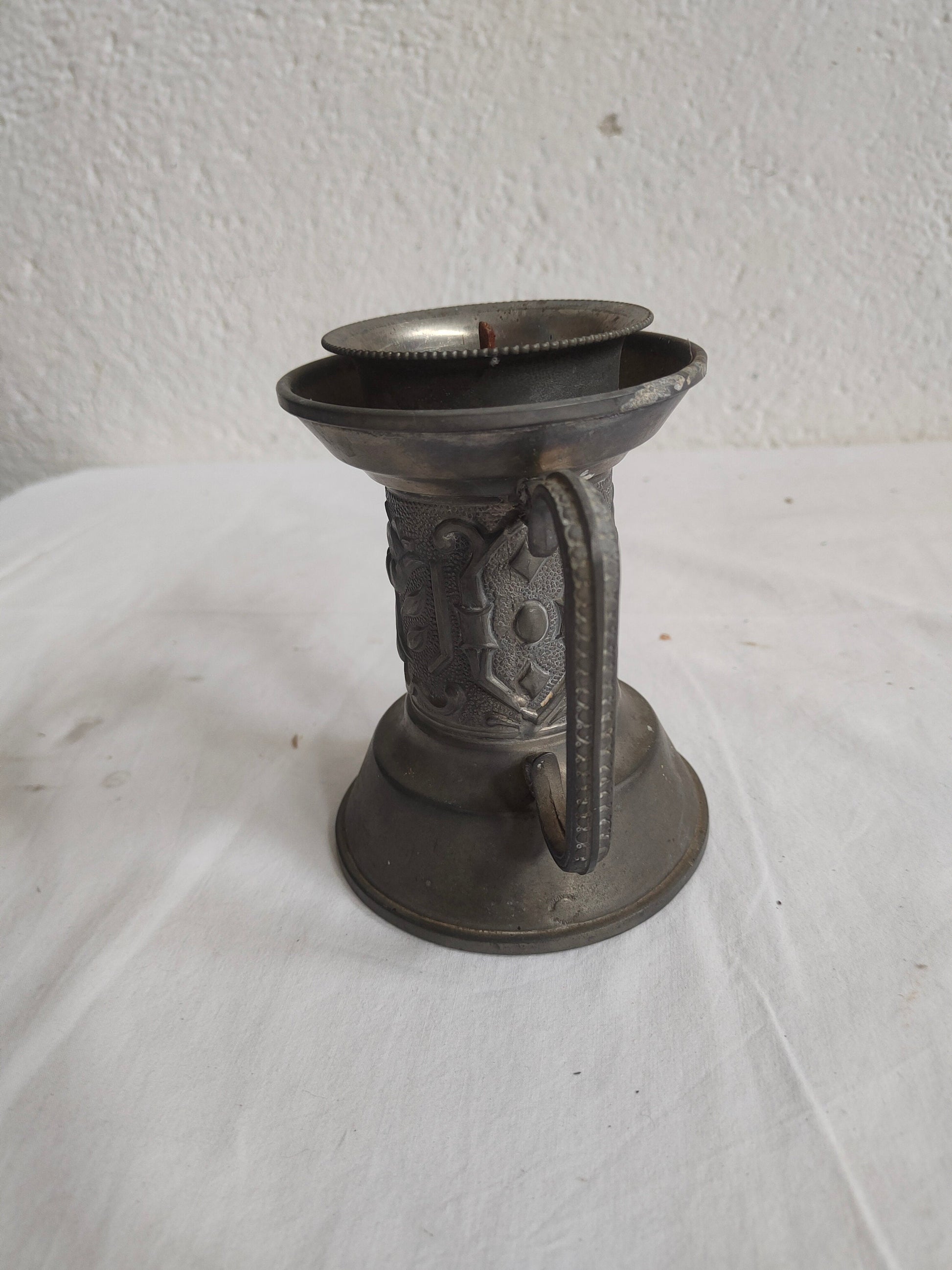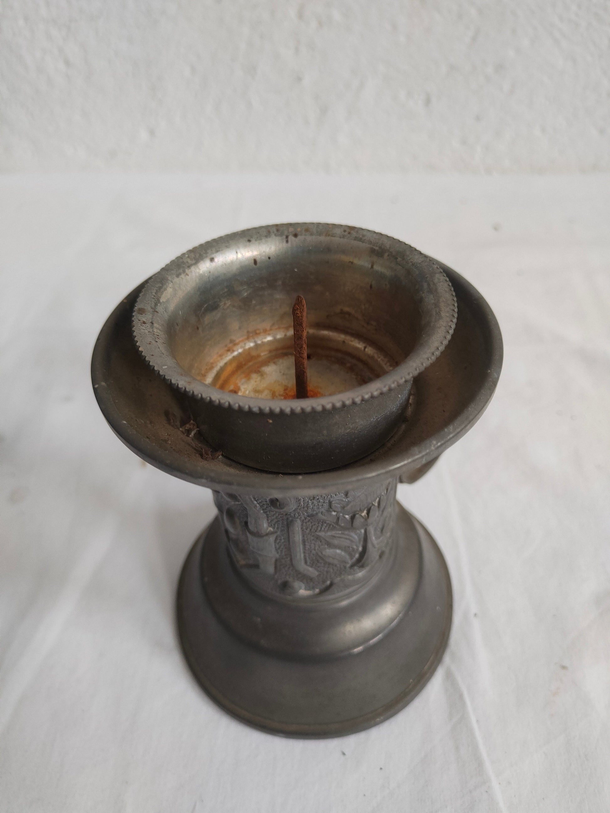 Porta candele antico in peltro antico con decorazione al corpo centrale