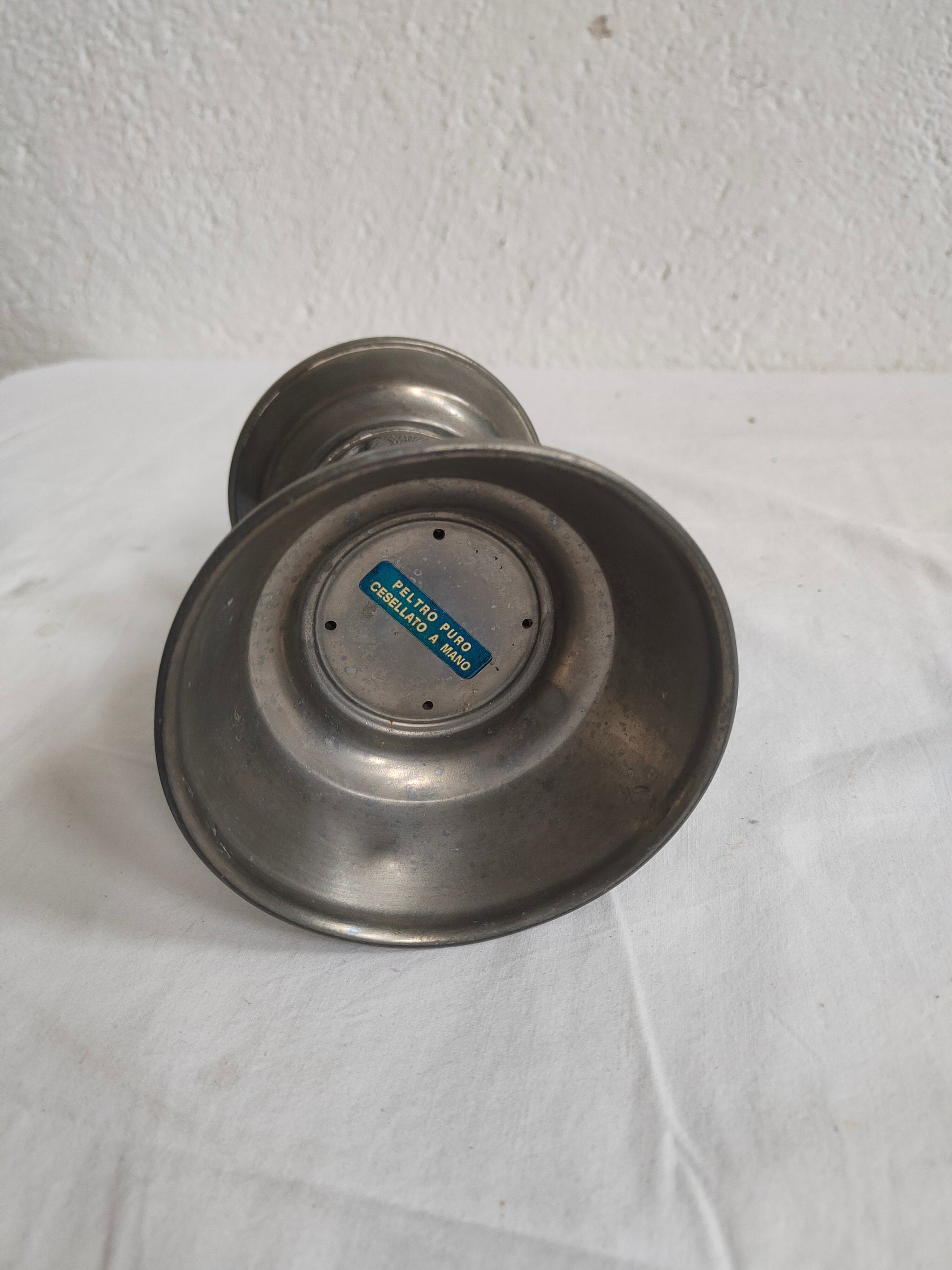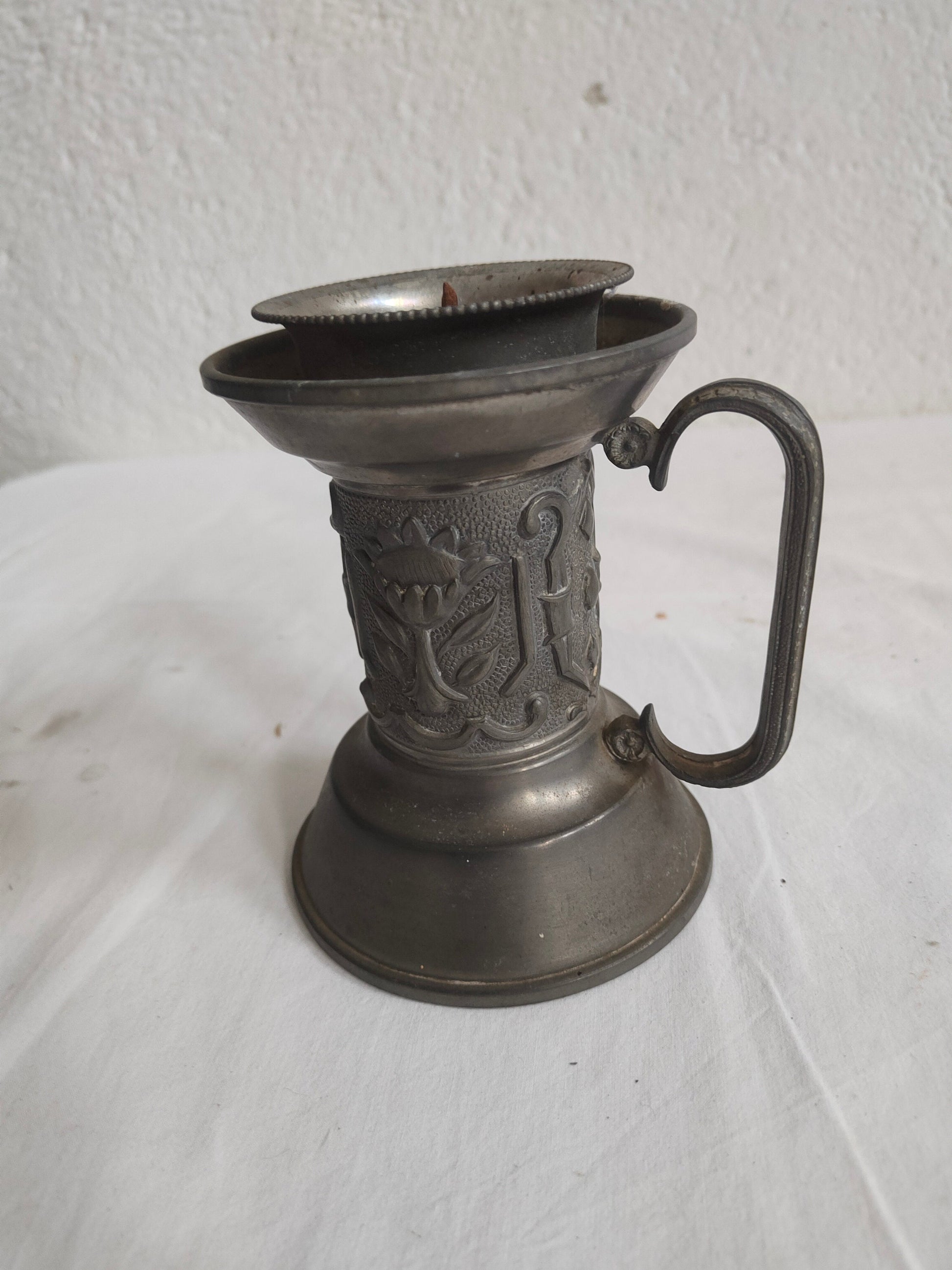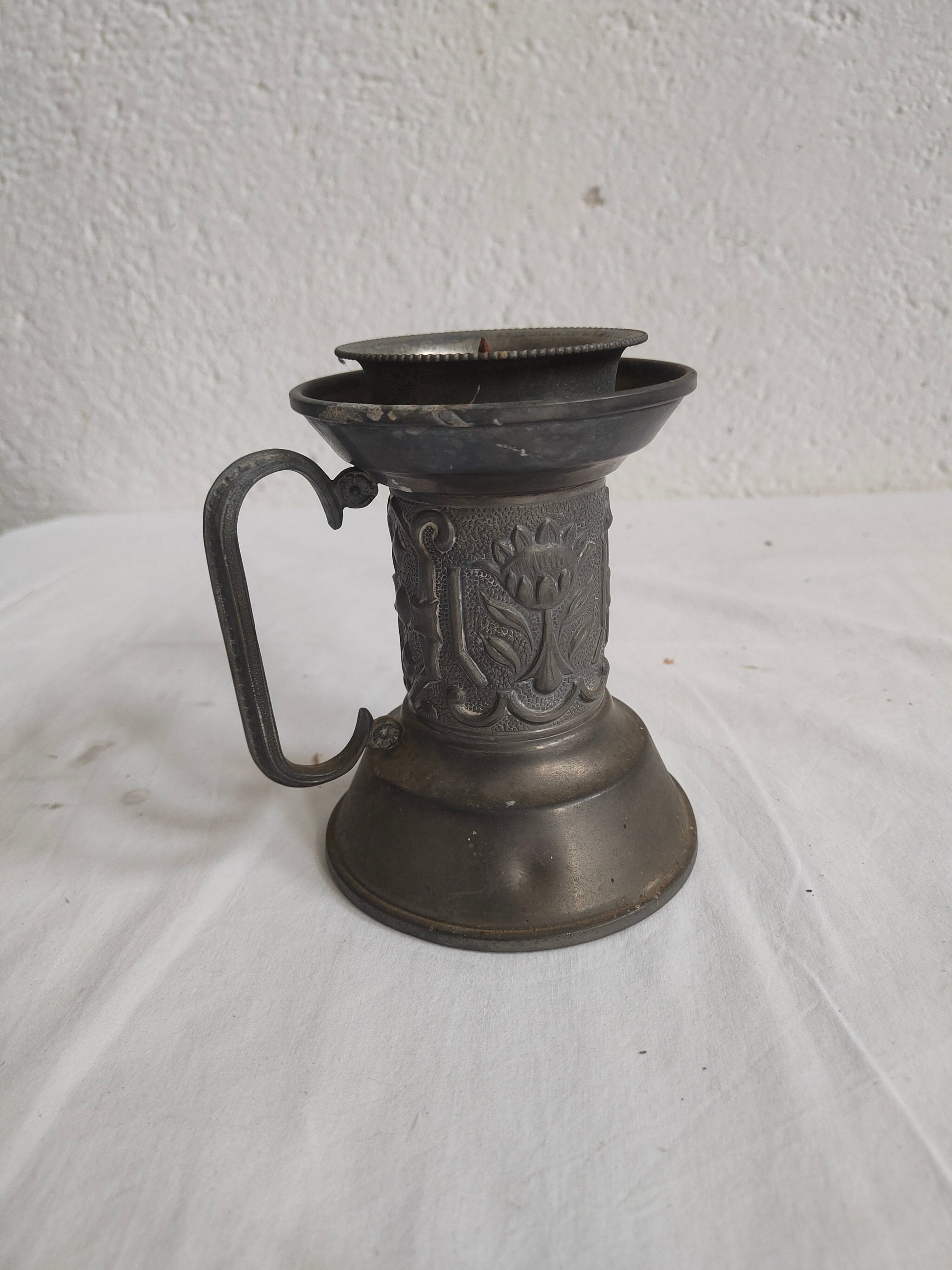 Porta candele antico in peltro antico con decorazione al corpo centrale