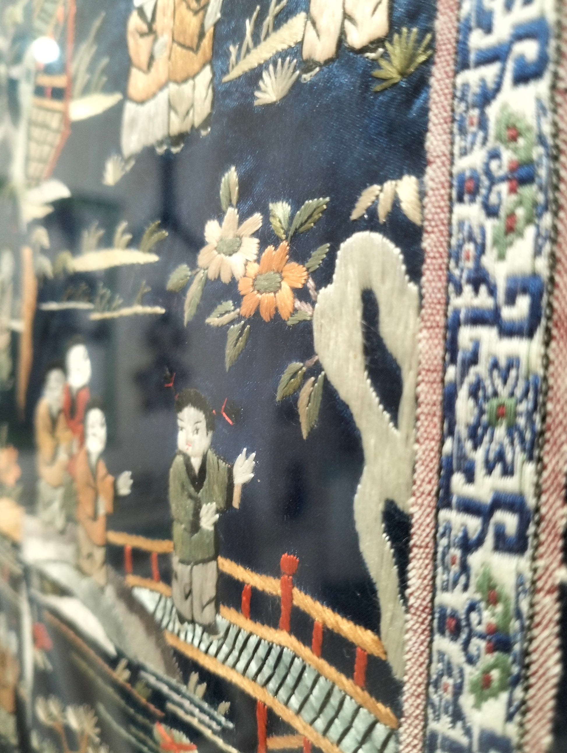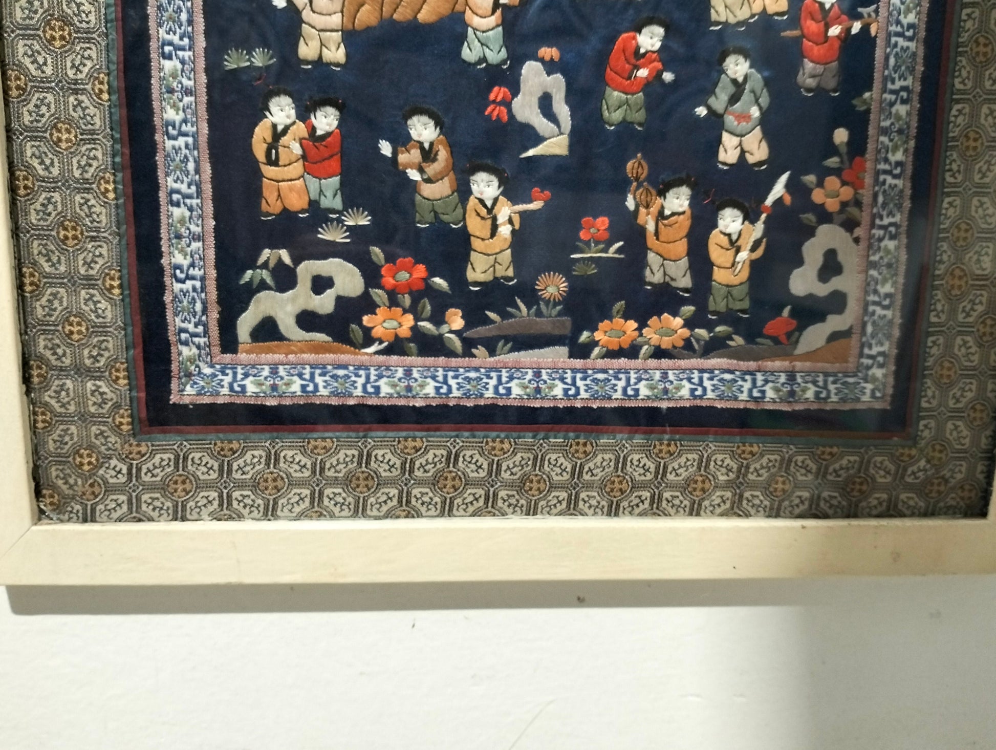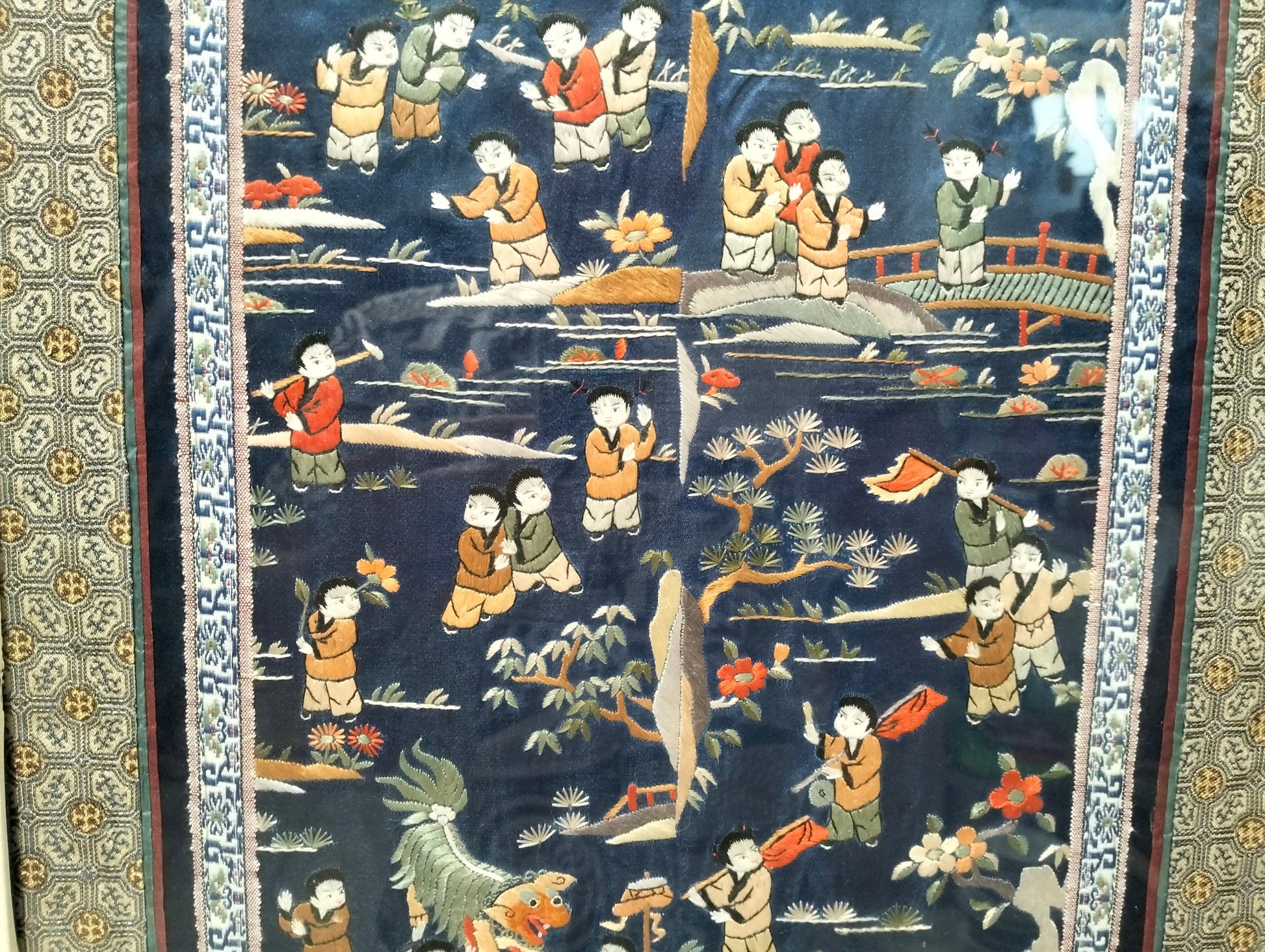Quadro Asiatico, Ricamo su Seta, Figure Asiatiche, Drago, Artigianato, Tecnica Manuale.
