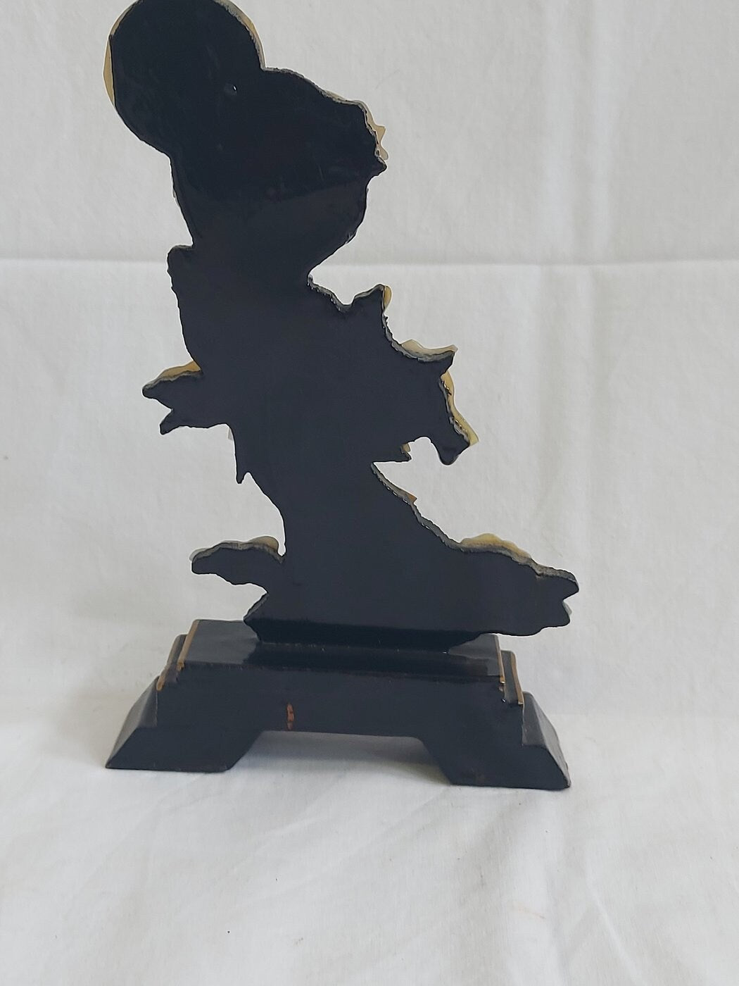 Il rilievo vintage raffigura una geisha, una figura tradizionale della cultura giapponese, realizzato con l‘uso di madreperla. La madreperla è un materiale pregiato, noto per la sua lucentezza e i delicati riflessi iridescenti che conferiscono un aspetto elegante e sofisticato all‘opera.
