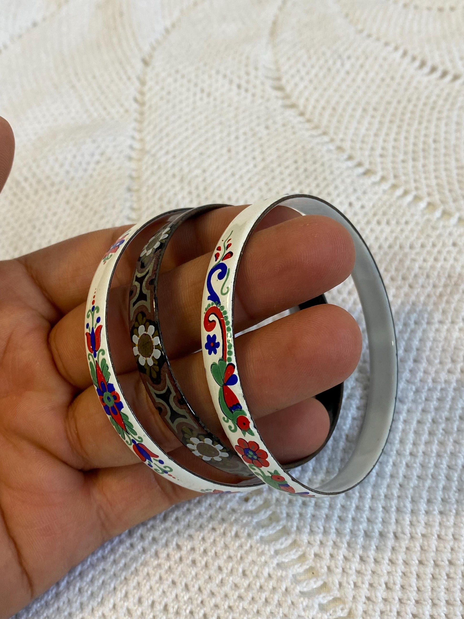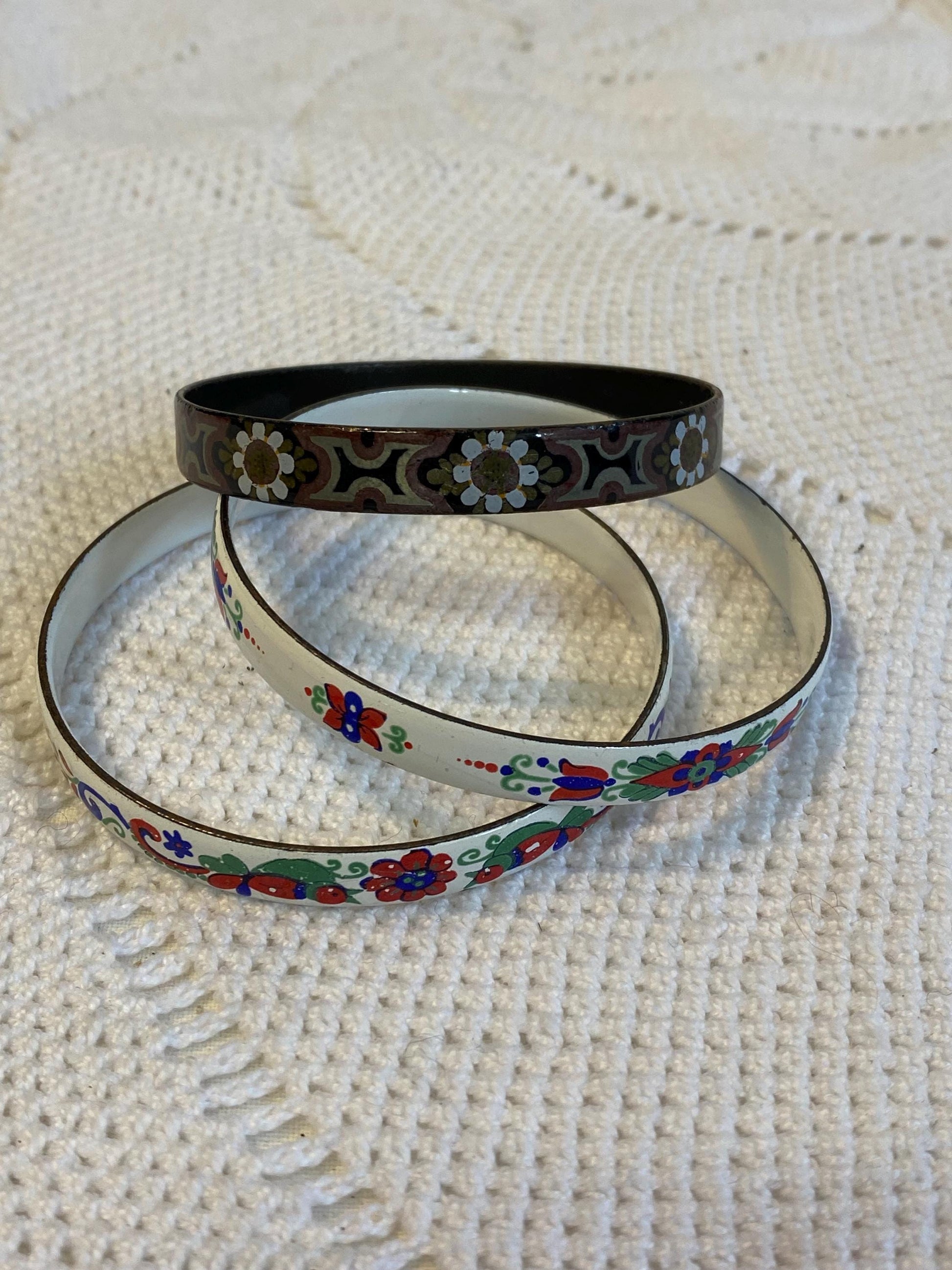 Set 3 bracciali rigidi vintage in metallo smaltato anni 80 nero e bianco con fiori diametro 7 cm 2.75 in e 6.5 cm 2.56 in