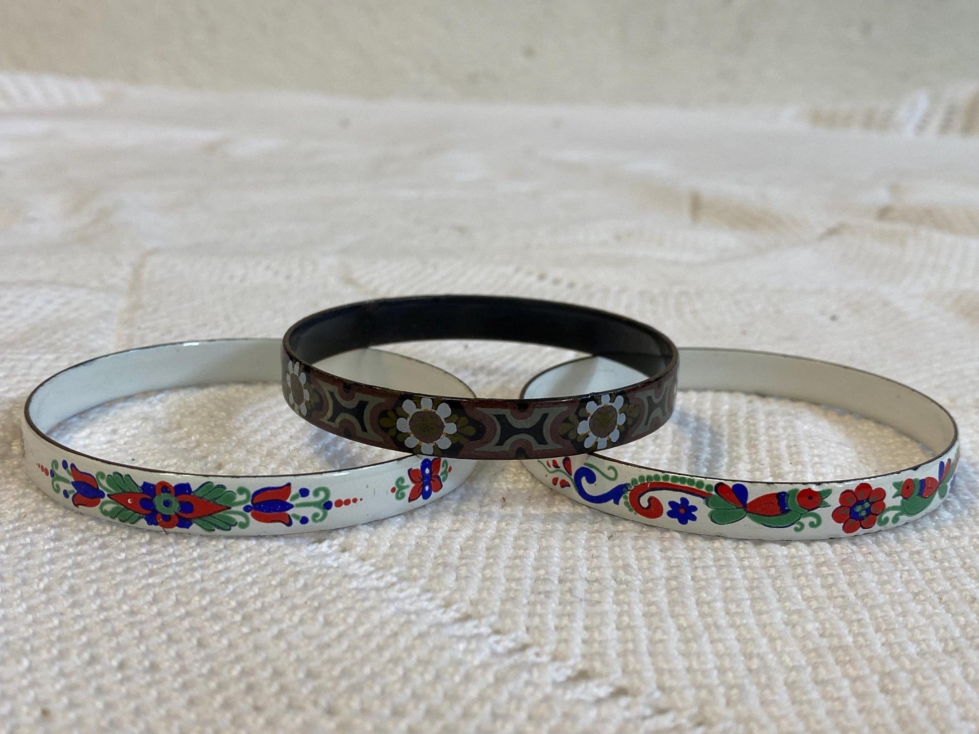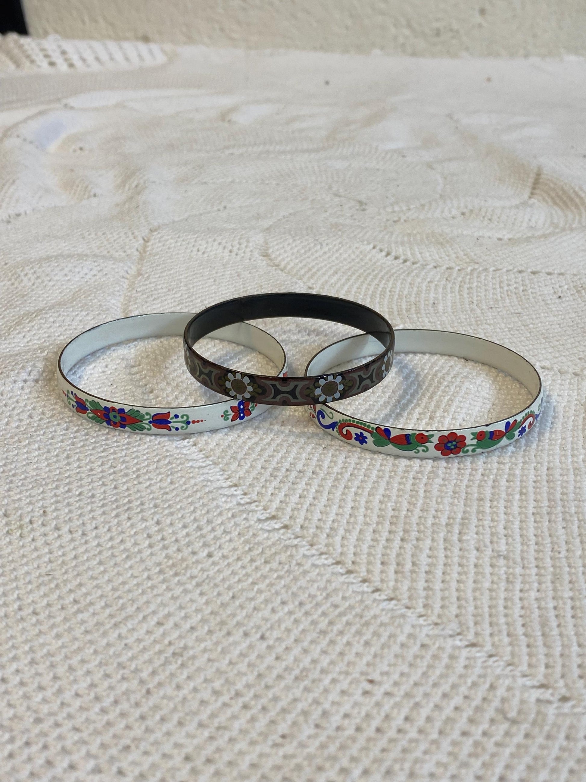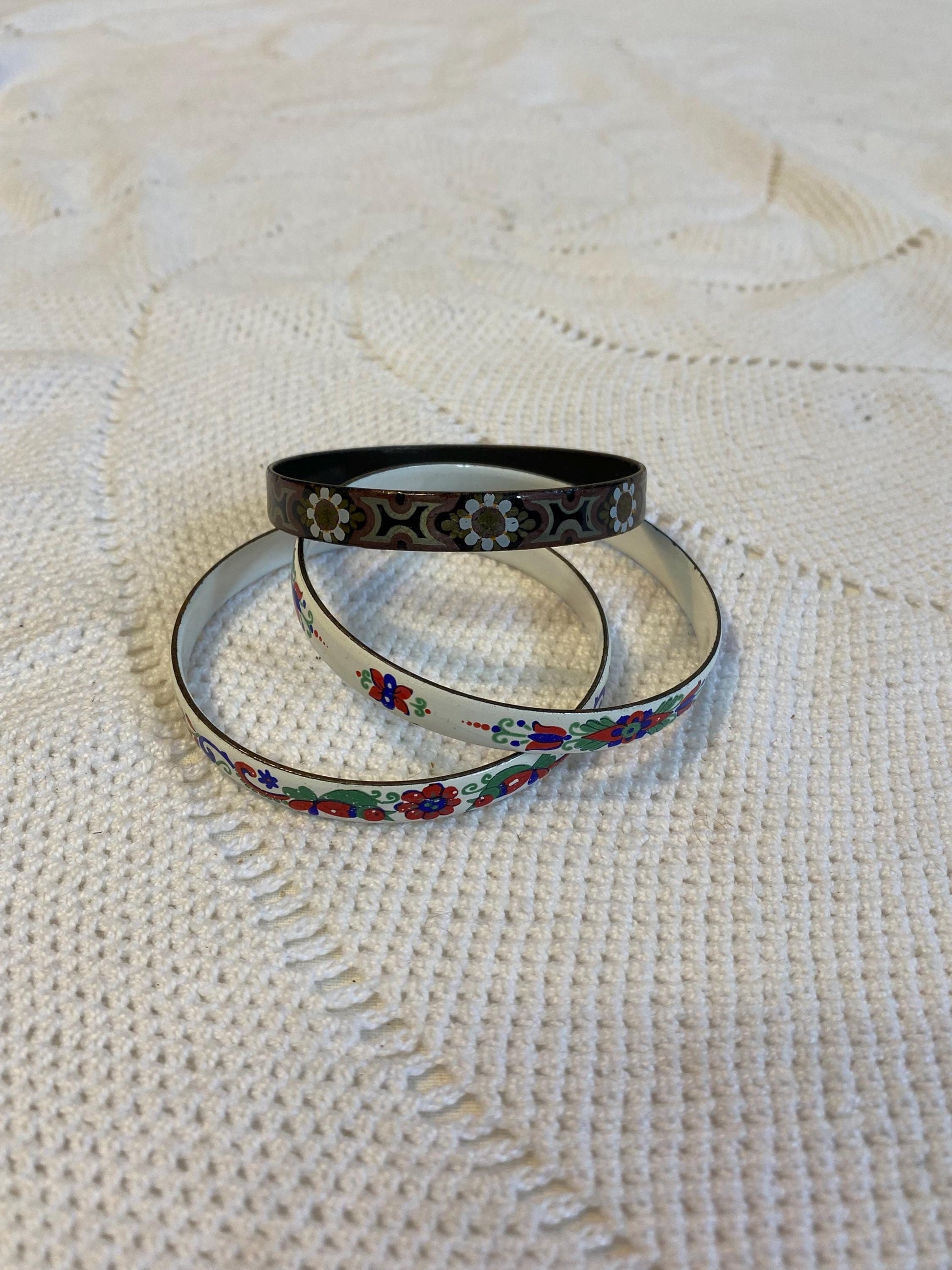 Questo affascinante set di tre bracciali rigidi vintage degli anni 80 è realizzato in metallo smaltato e rifinito a mano. Due bracciali presentano una base smaltata nera e bianca con vivaci motivi floreali multicolori ispirati alla tecnica cloisonne, mentre il terzo bangle mette in risalto le tonalita argento e oro con dettagli incisi. Questi accessori unici si adattano a polsi di piccole e medie dimensioni: due bracciali hanno un diametro interno di circa 7 cm (2.75 in) e uno misura circa 6.5 cm (2.56 in), con una larghezza di circa 1 cm. Il set è in ottimo stato, con lievissimi segni d’uso coerenti con l’epoca.