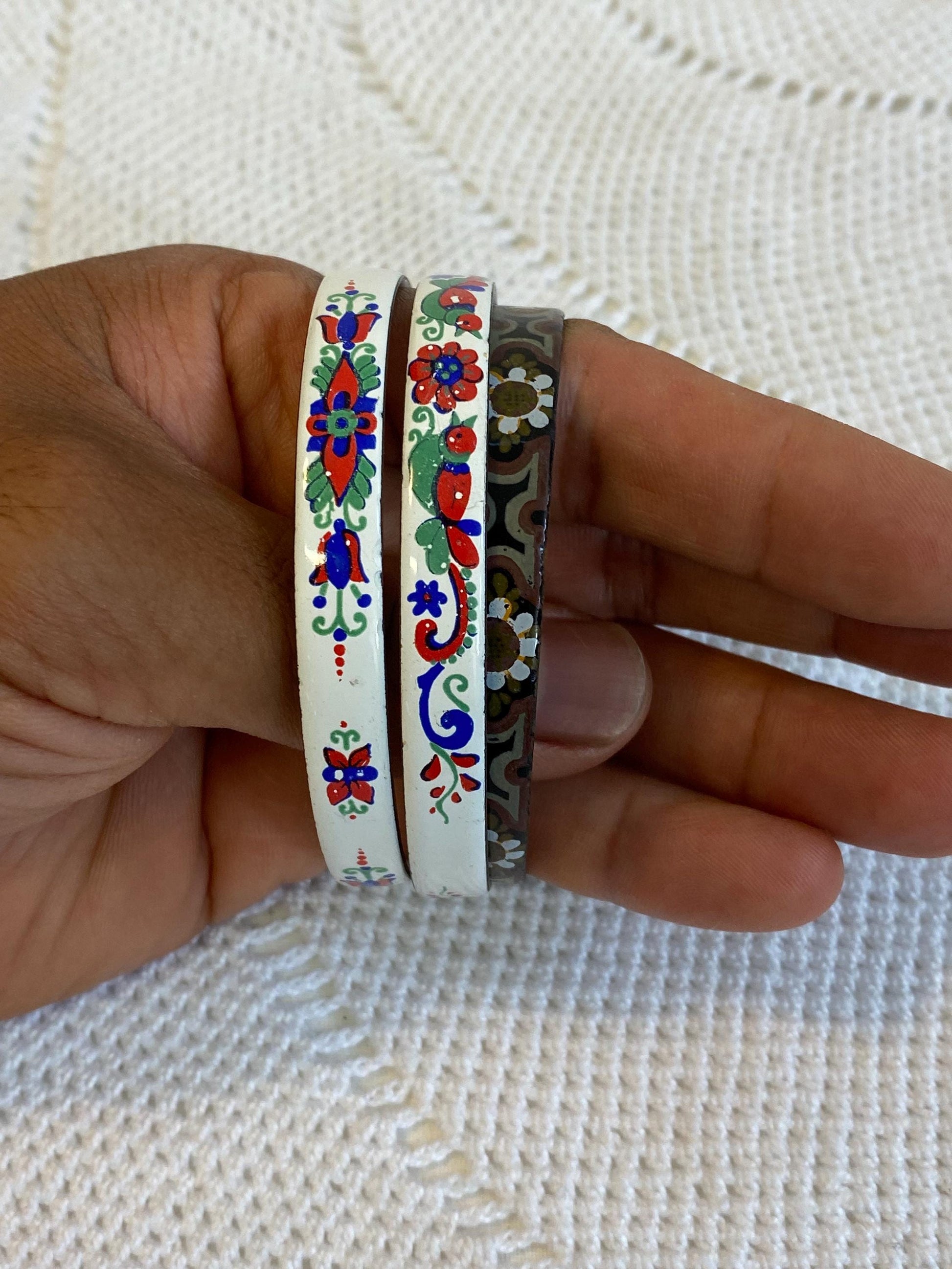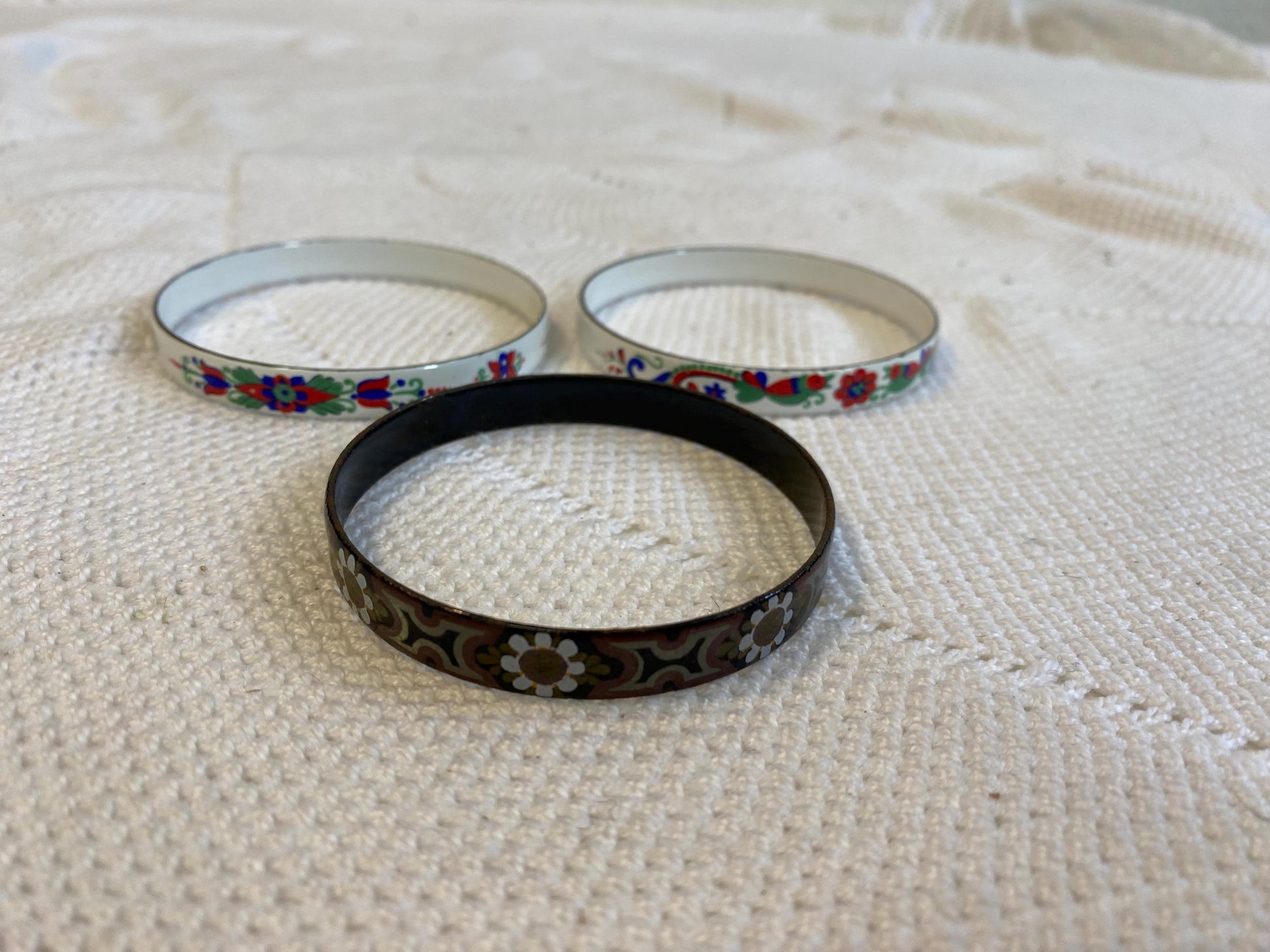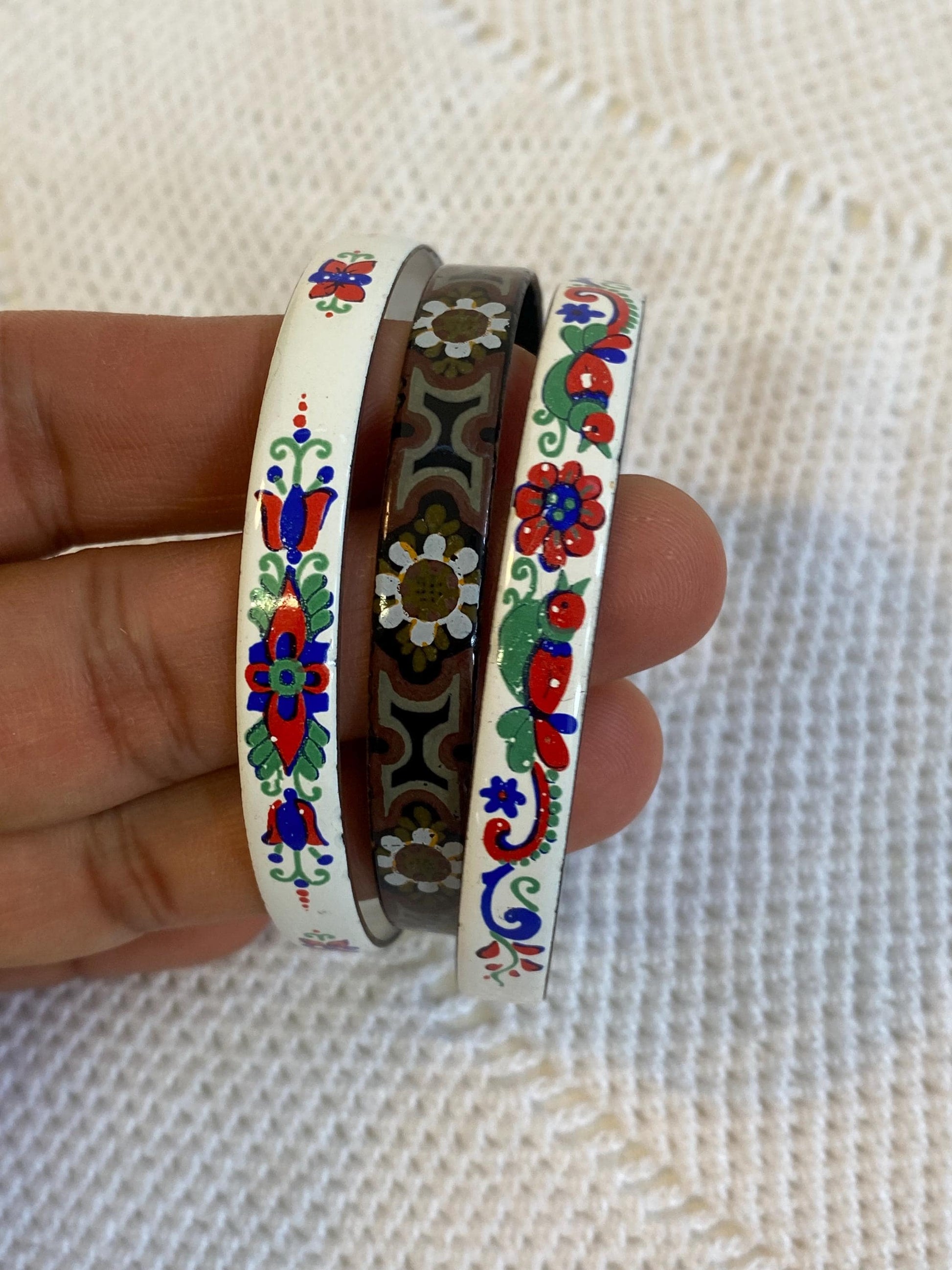 Questo affascinante set di tre bracciali rigidi vintage degli anni 80 è realizzato in metallo smaltato e rifinito a mano. Due bracciali presentano una base smaltata nera e bianca con vivaci motivi floreali multicolori ispirati alla tecnica cloisonne, mentre il terzo bangle mette in risalto le tonalita argento e oro con dettagli incisi. Questi accessori unici si adattano a polsi di piccole e medie dimensioni: due bracciali hanno un diametro interno di circa 7 cm (2.75 in) e uno misura circa 6.5 cm (2.56 in), con una larghezza di circa 1 cm. Il set è in ottimo stato, con lievissimi segni d’uso coerenti con l’epoca.