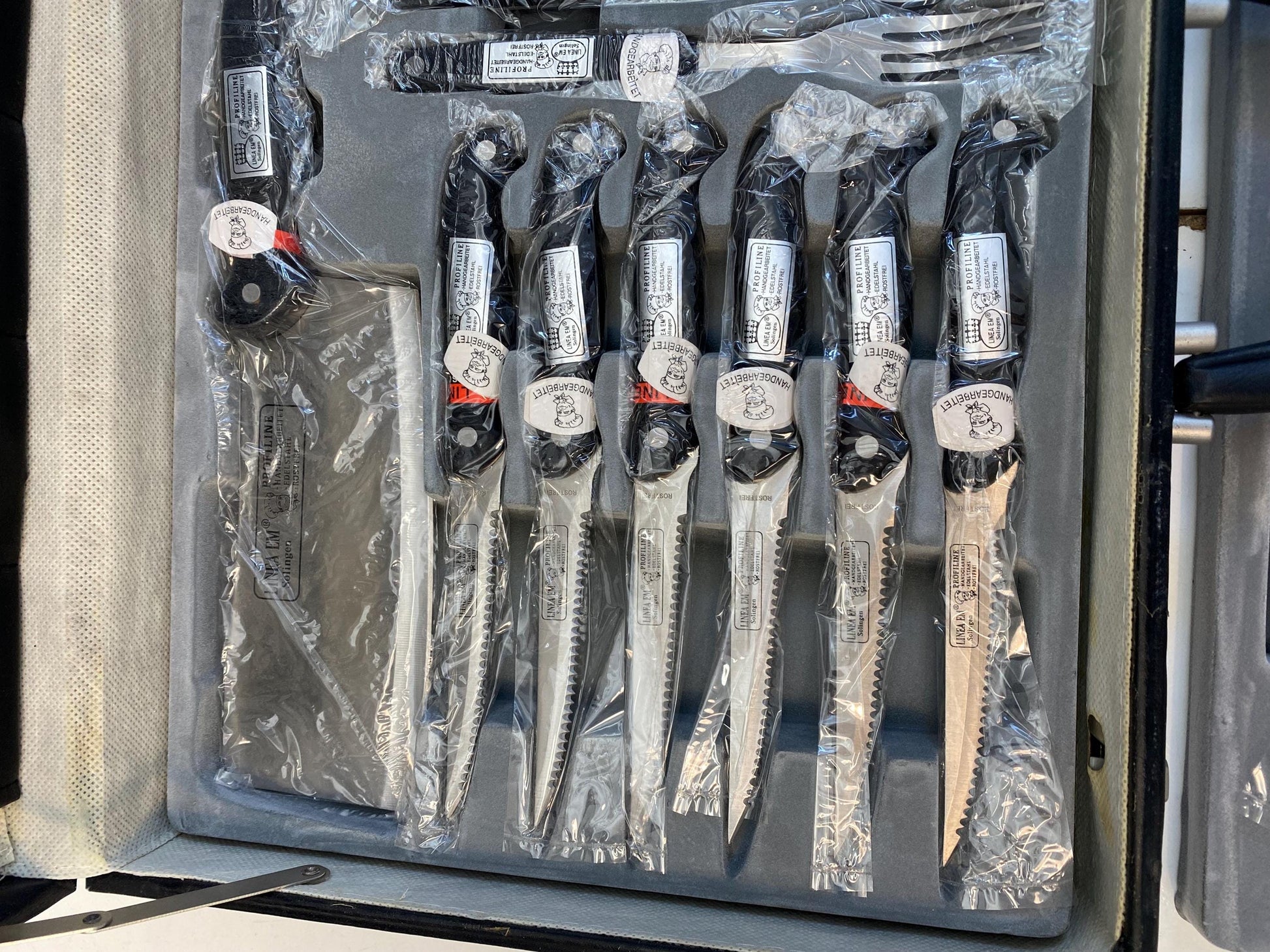 Ogni coltello e forchetta è prodotto in acciaio inox rostfrei, rinomato per la sua resistenza alla ruggine e la lunga durata nel tempo. Le impugnature ergonomiche nere con rivetti garantiscono una presa sicura e professionale. Il tutto è custodito in una raffinata valigetta rigida con serratura, perfetta per conservare e trasportare gli utensili in modo sicuro e ordinato.