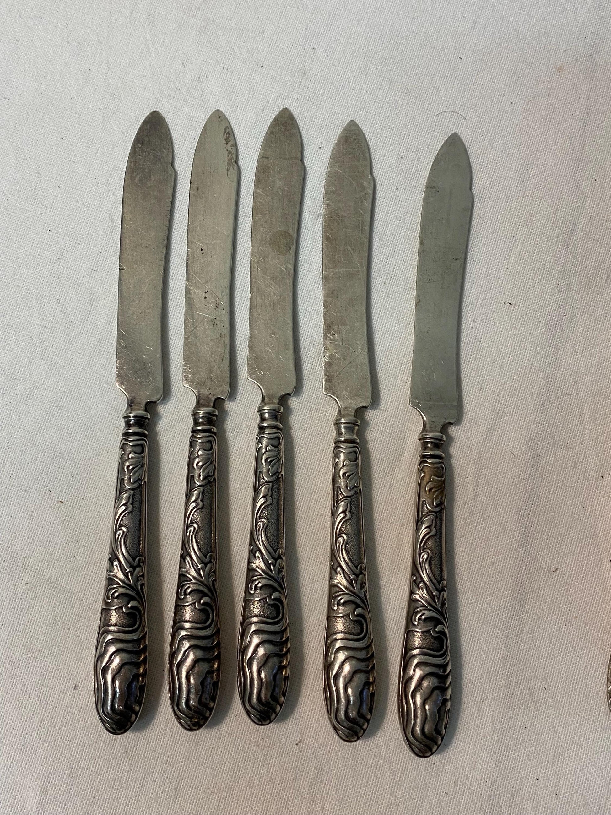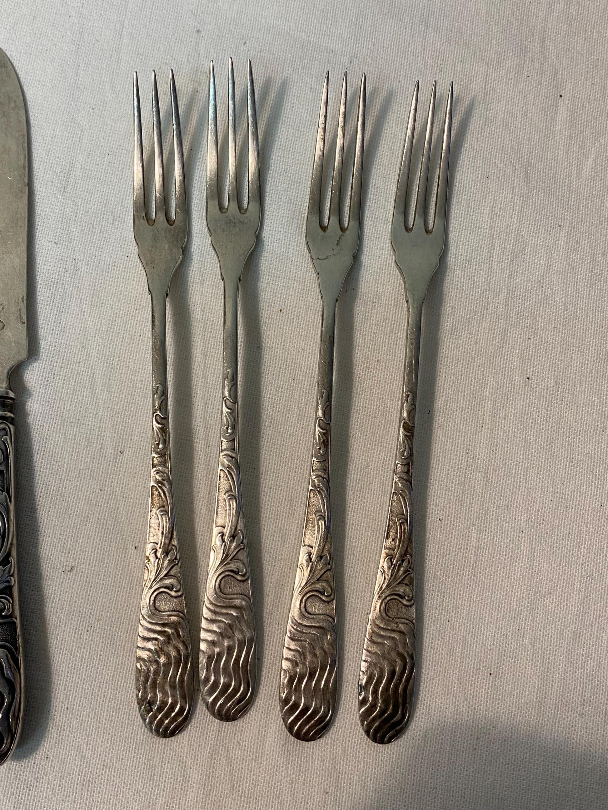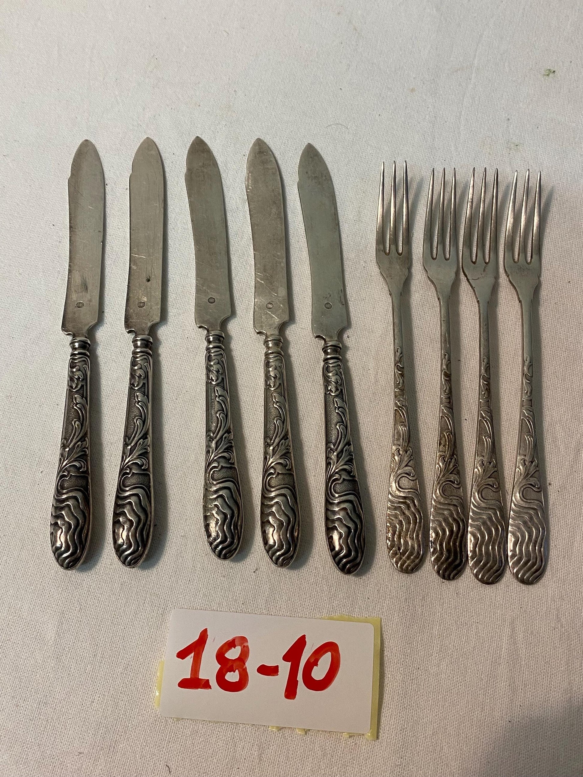Set di Posate Antiche Art-Krupp Berndorf - Manici in Rilievo, 5 Coltelli e 4 Forchette