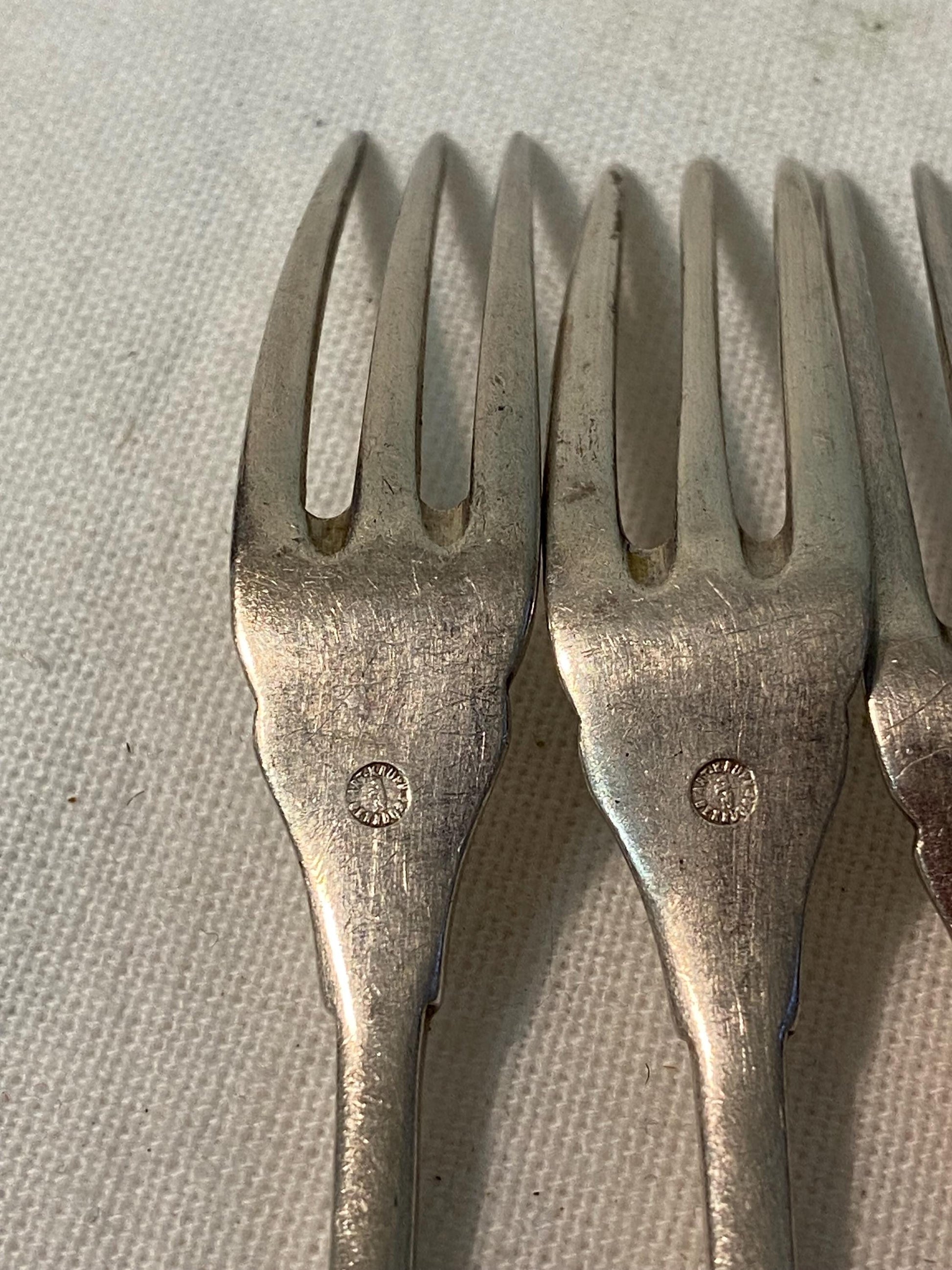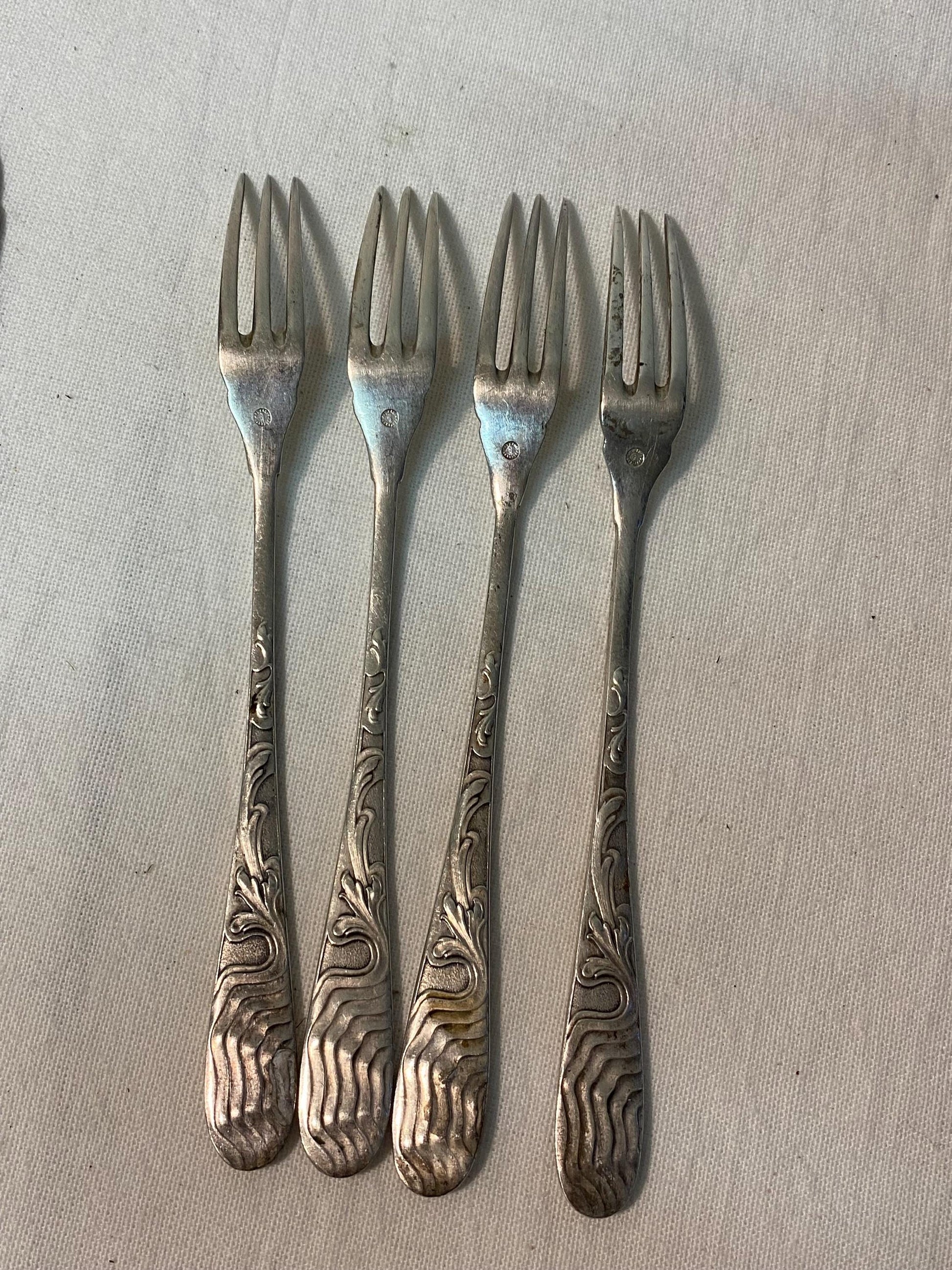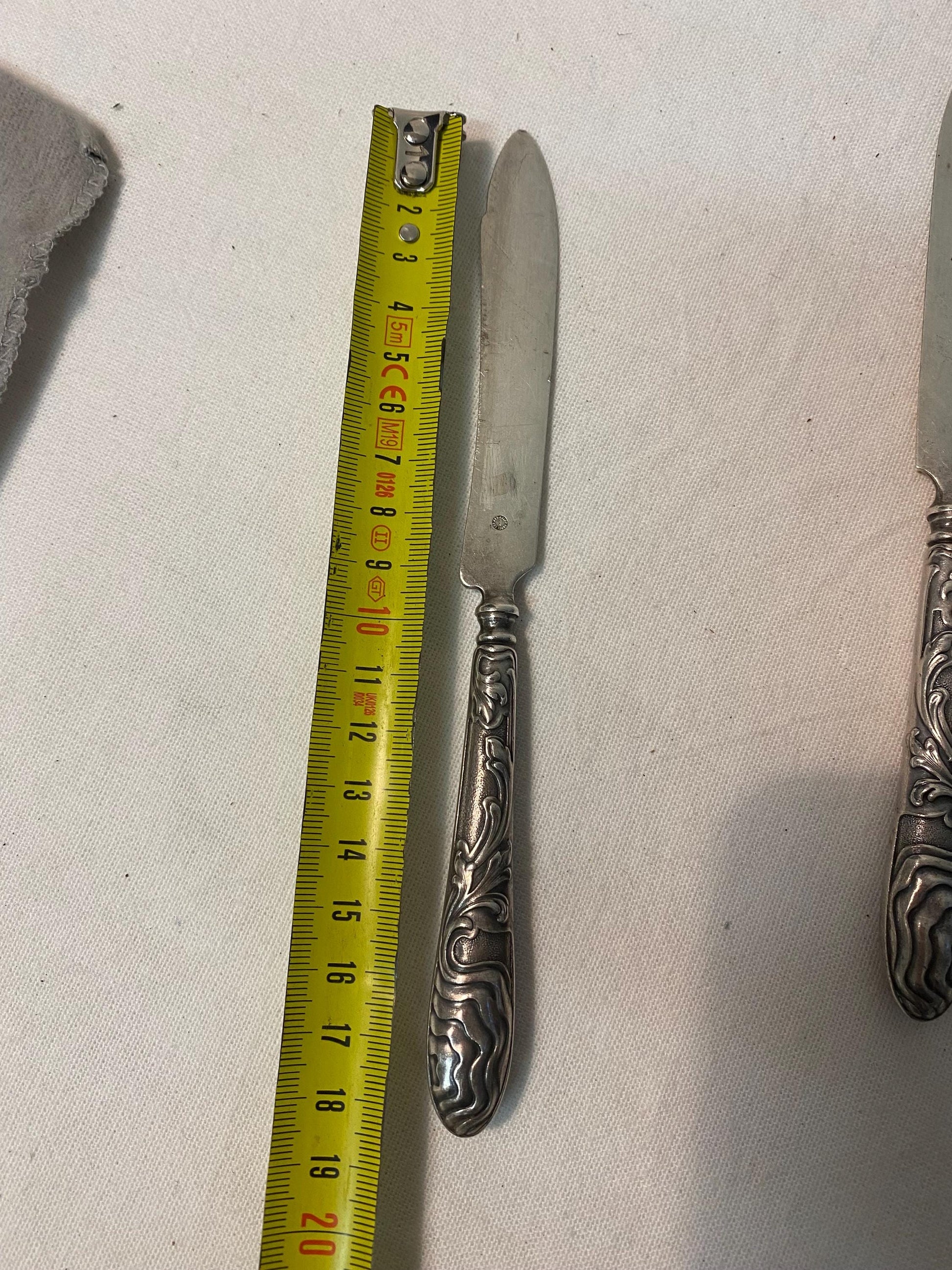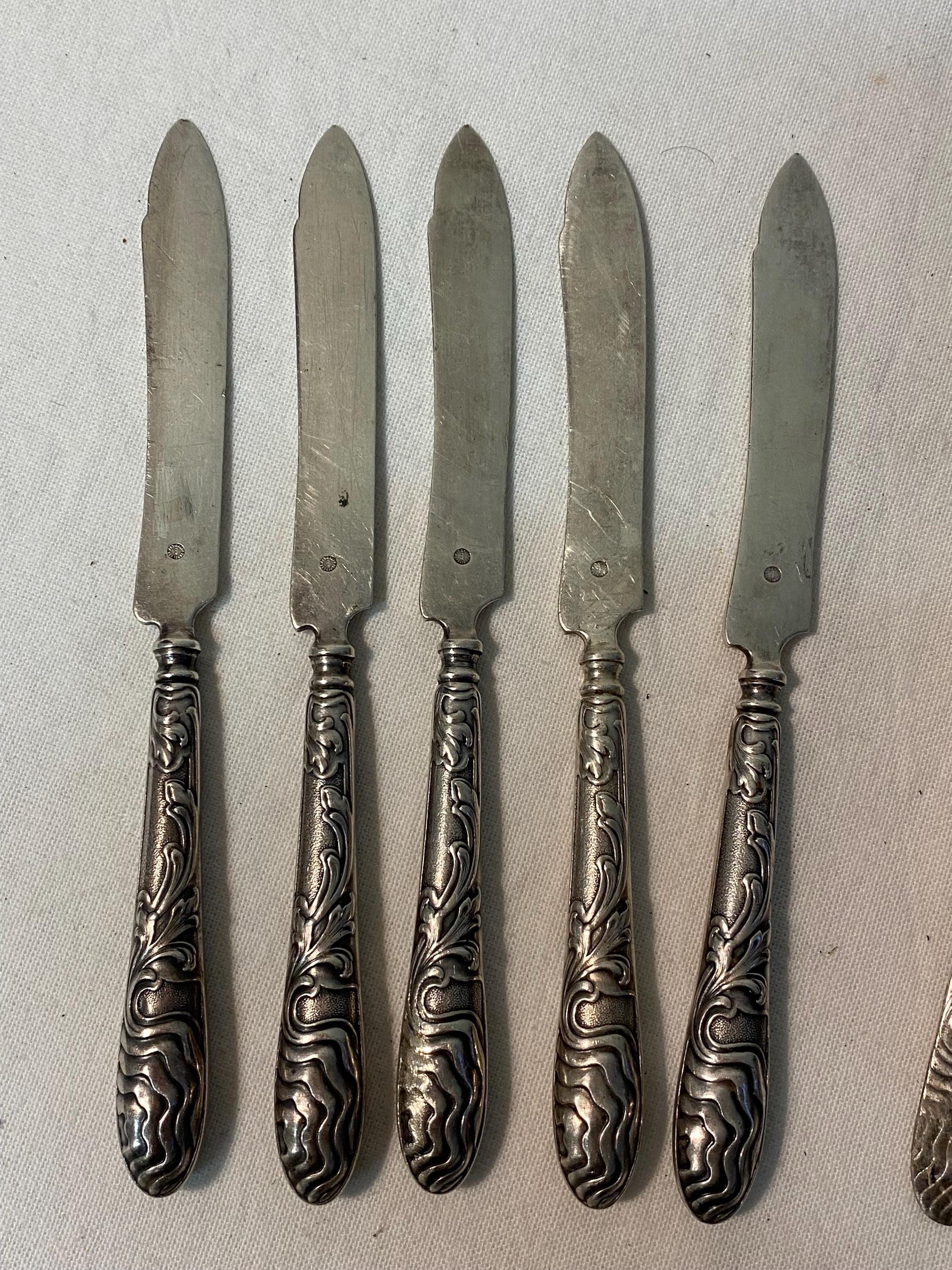 Set di Posate Antiche Art-Krupp Berndorf - Manici in Rilievo, 5 Coltelli e 4 Forchette